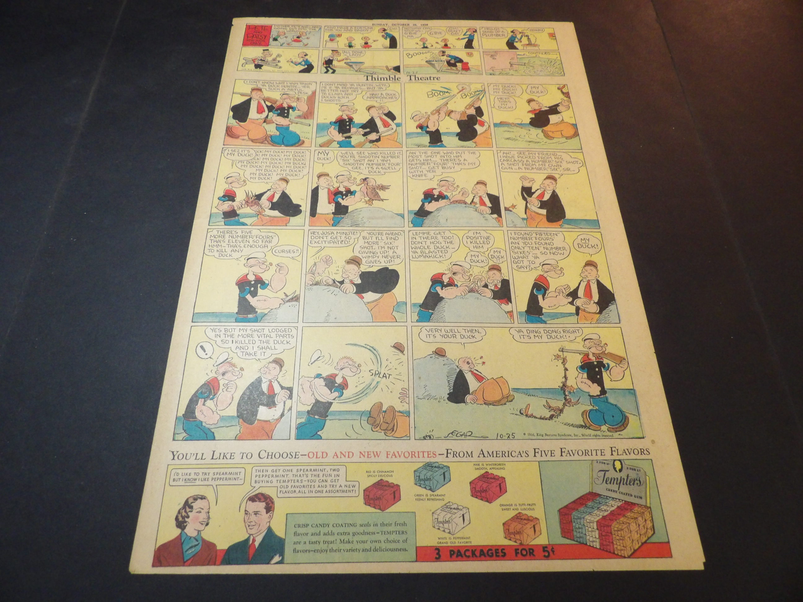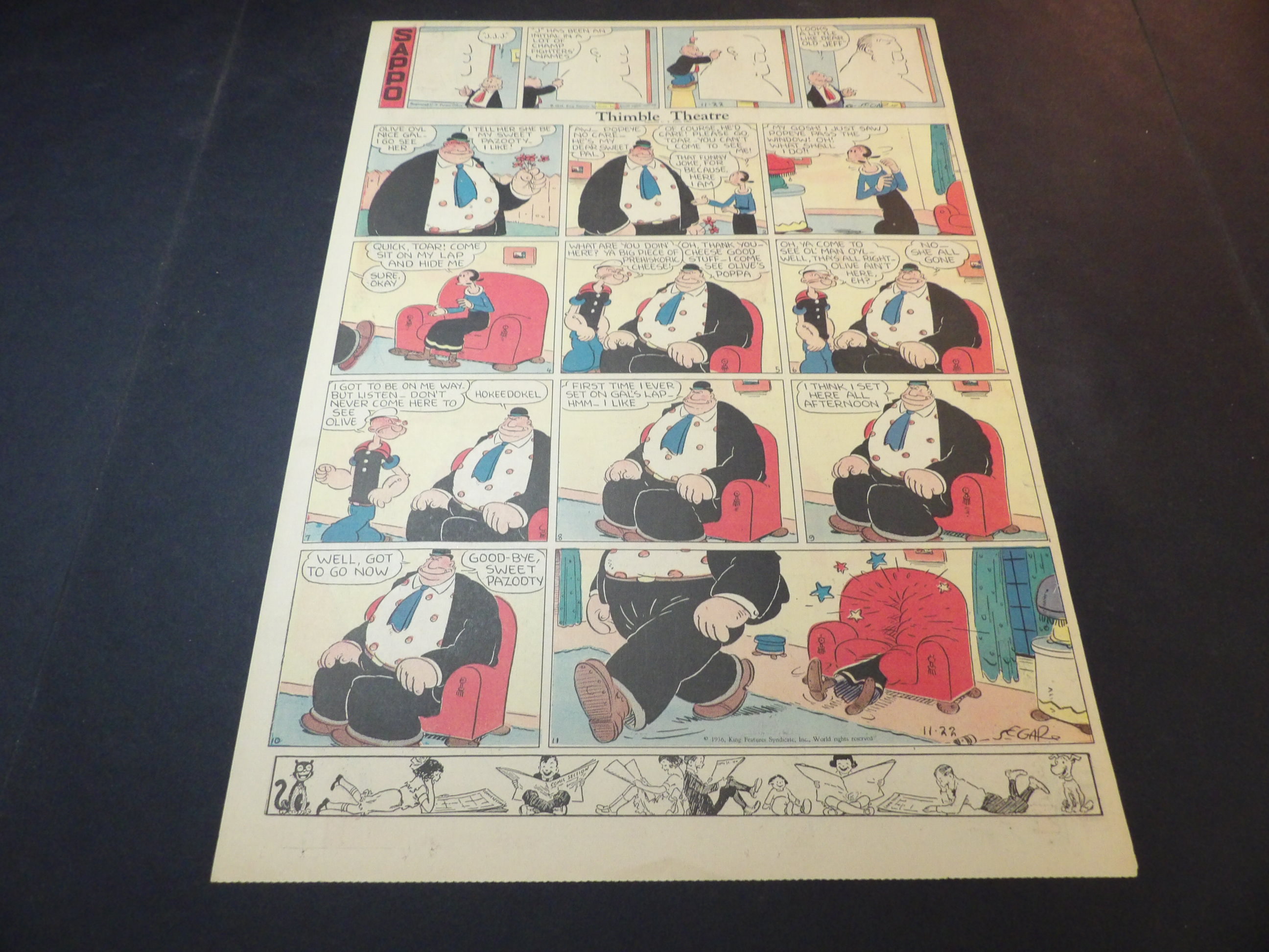 | Thimble Theatre (Popeye) by Elzie Segar (1450-) 1st Appearance December 19th 1919, 1st Sunday January 25th 1925, 1st Popeye Daily January 17th 1929, 1st Popeye Sunday March 2nd 1930 - Elzie Crisler Segar was already a very successful cartoonist from his earlier work on "Married Life" and "Charley Chaplin's comic capers" when he began working on Thimble Theatre. The original stars of the strip was the Oyl family, especially Olive and her brother Castor. Together with Olive's boyfriend "Ham" Gravy, they set off on a number of slapstick adventures which had plenty of gag strips sprinkled in. The landscape of comics changed forever when 10 years into the strip a surly ill-mannered sailor came into the picture, his name was Popeye. In a matter of a couple of years, Popeye was now the center of all of the action in the strip. His adventures on the sea, in boxing, and later settling into suburban life would be some of the most humorous of any to see print. Elzie Segar built a great cast of peripheral characters which included Eugene the Jeep. The Sea-Hag, Alice the Goon, J. Wellington Wimpy and many more. Popeye's strength reliance to Spinach became a marketing dream as the premise was extended to the incredible Max Fleischer cartoons of the early 1930's. Popeye turned into a true cartoon icon which has transcended multiple generations. The market for Thimble Theatre is quite good. The strip had very wide carraige so lucky collectors wil find stout supply which keeps prices reasonable. Collectors tend to navigate to full-color Fulls and Tabs. Premium strips include the early 1925 sundays, the early 1930 appearances of Popeye, the first appearance of the Jeep, and the great Plunder Island episodes with the Sea-Hag, Alice the Goon, and Bill Barnacle. |