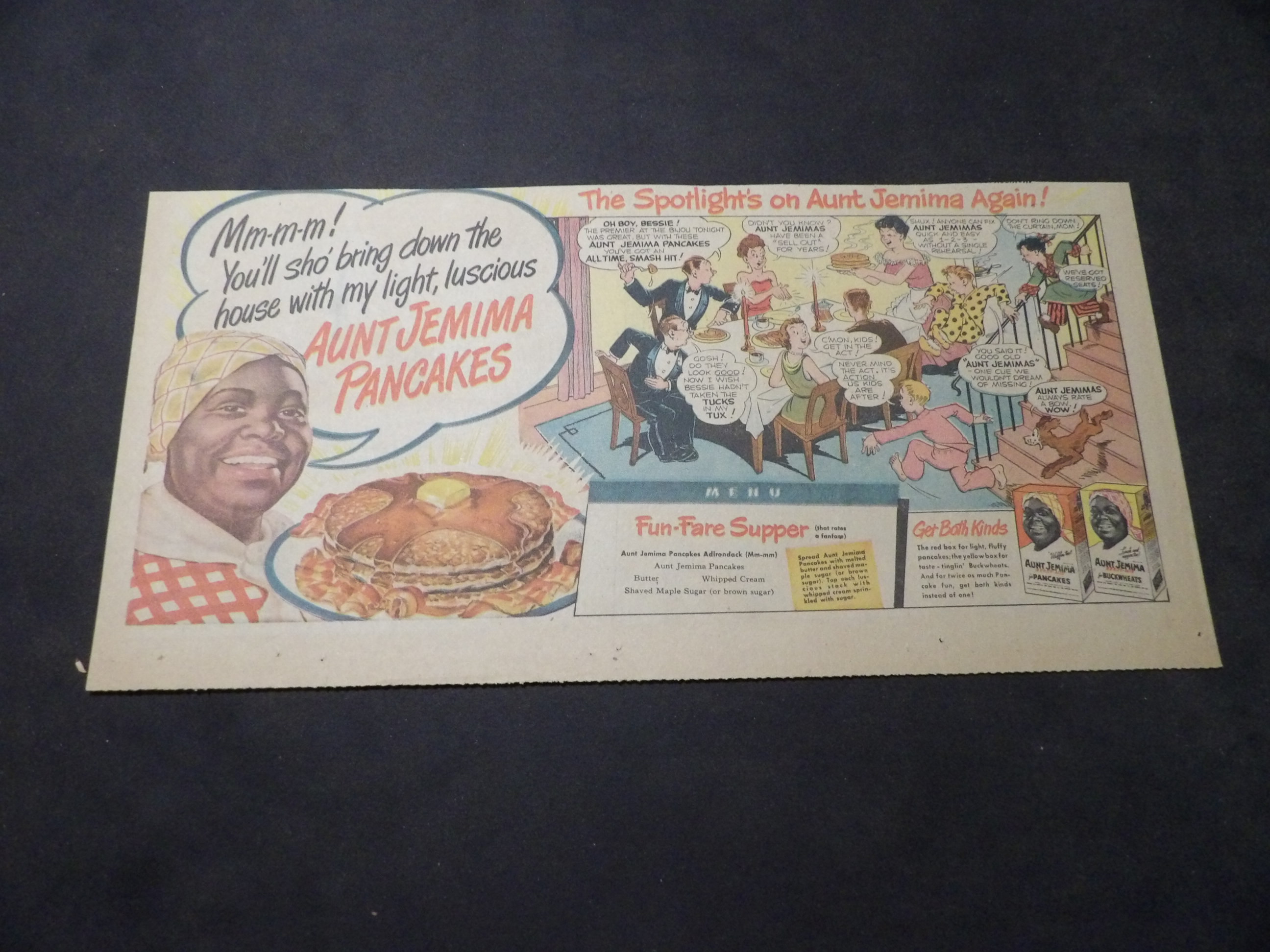 | A001-0192 | Aunt Jemima Pancake Mix | 1940s - 1TH | G-VG/G-VG/VG | $5.00 | by Dudley Fisher, 'Startin' the day off right'', On reverse Pond's Cold Cream ad(TH) |