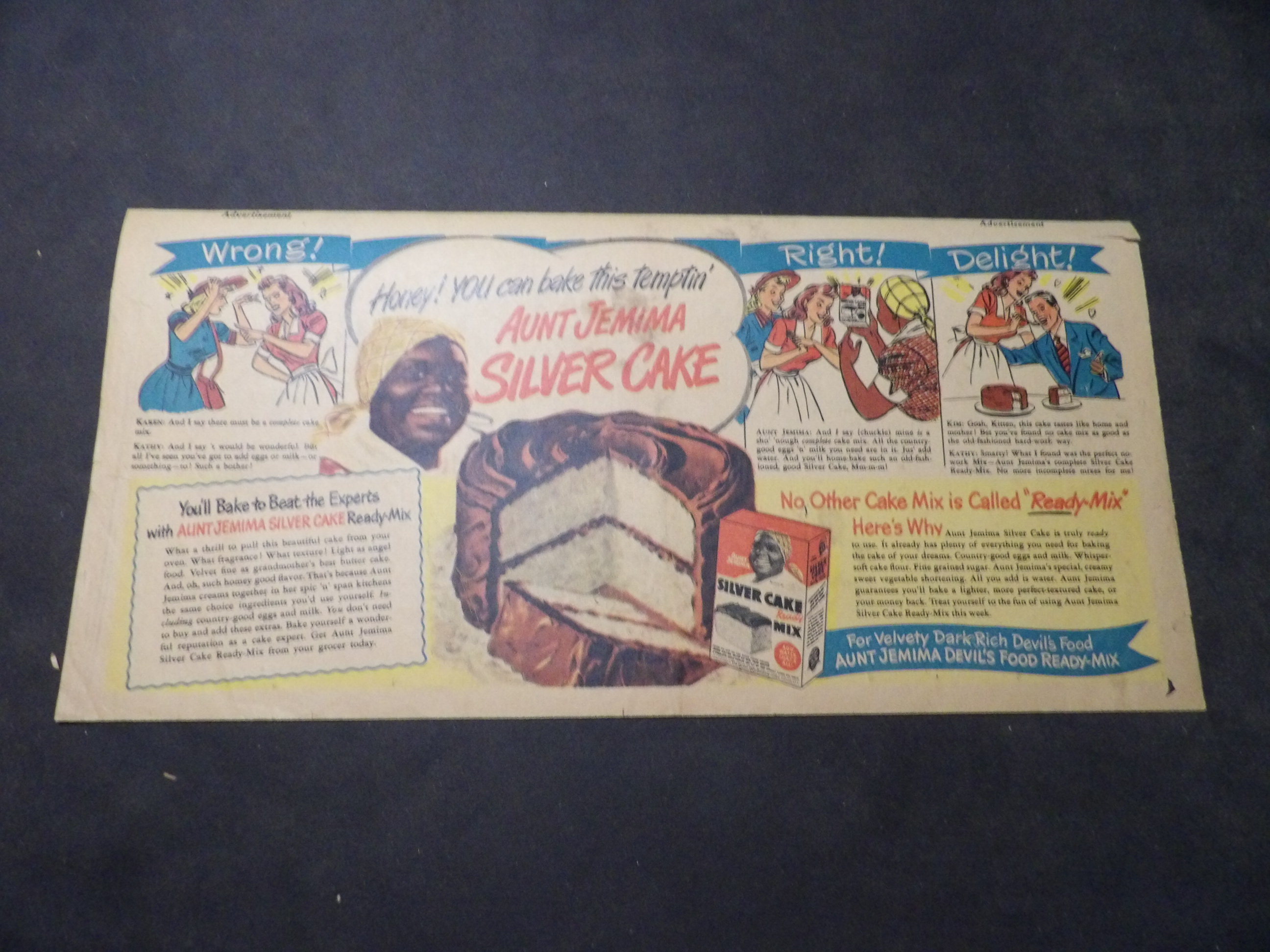 | A001-0161 | Aunt Jemima Devil Food Cake Mix | 1950's - 1TH | G-VG/G-VG/G | $3.00 | On reverse Welch's Grape Juice ad. |