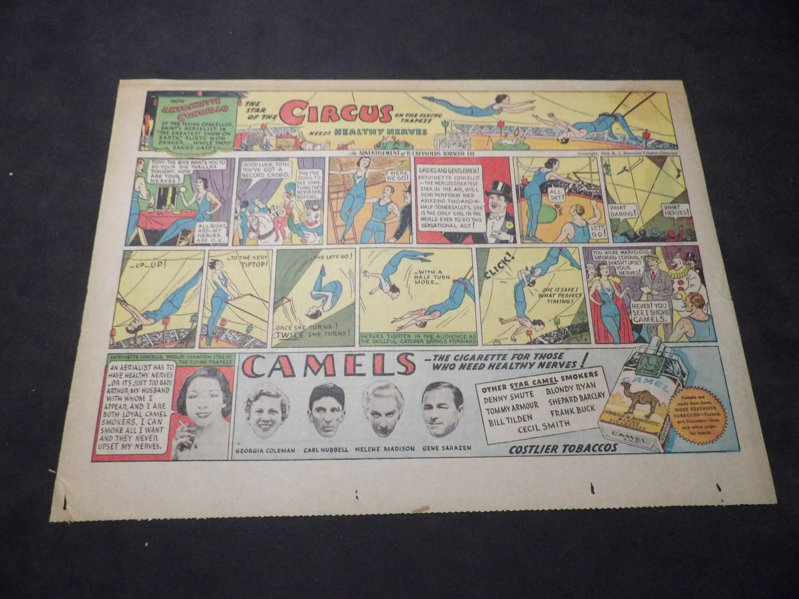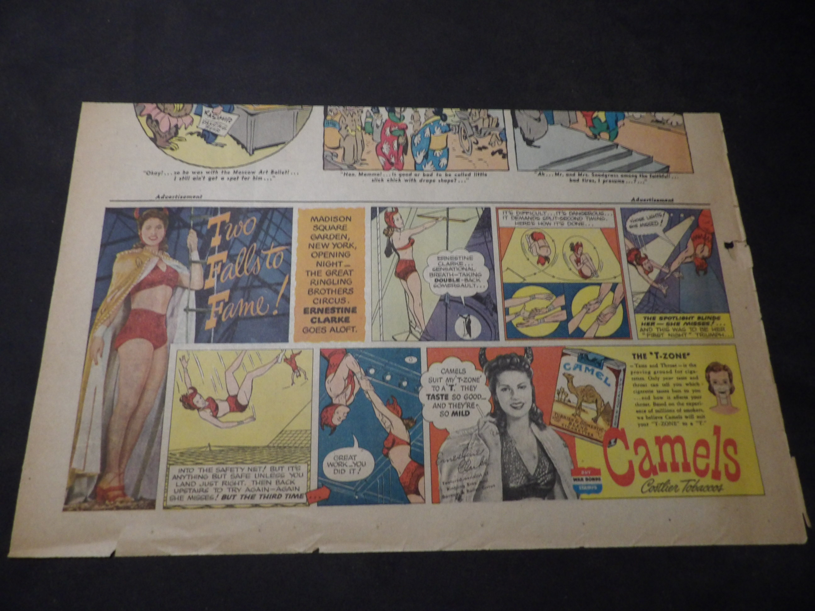 | A002-0123 | Camel Cigarettes | 1945/10/14 - TH | G/G/VG | $4.00 | featuring Ernestine Clarke Trapeze Artist(pic), On reverse Our Bill by Harry Haenigsen(H) |