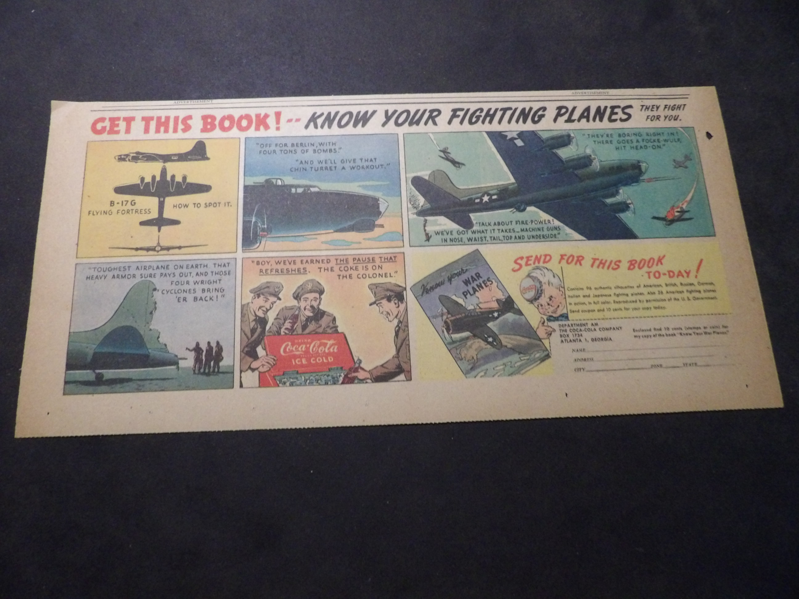 | A007-0214 | Coca-Cola | 1940's - 1TH | G-VG/G-VG/VG | $5.00 | featuring B-17G Flying Fortress, 'Know Your Fighting Planes' Book Premium, On reverse Mennen Quinsana ad(TH) |