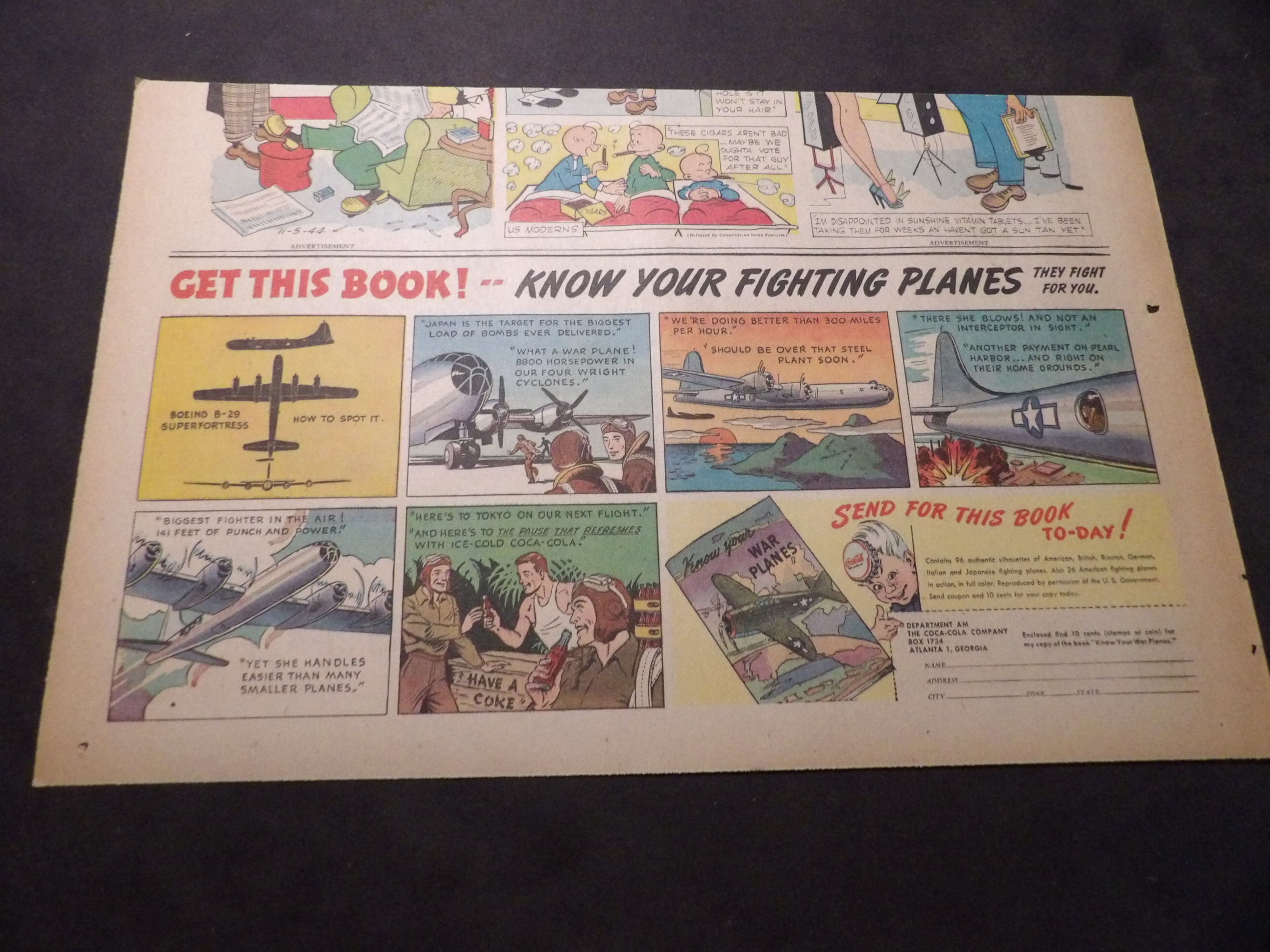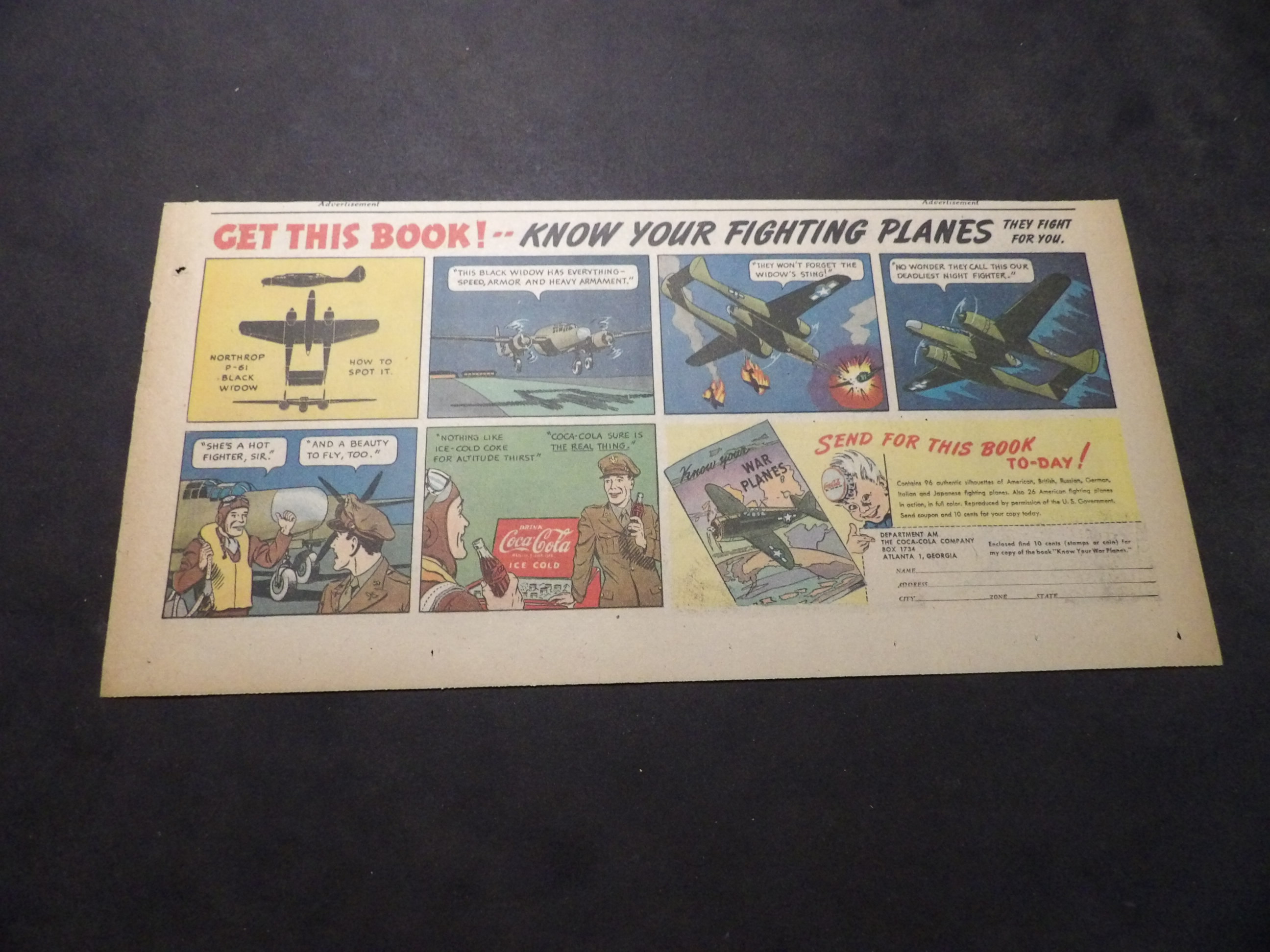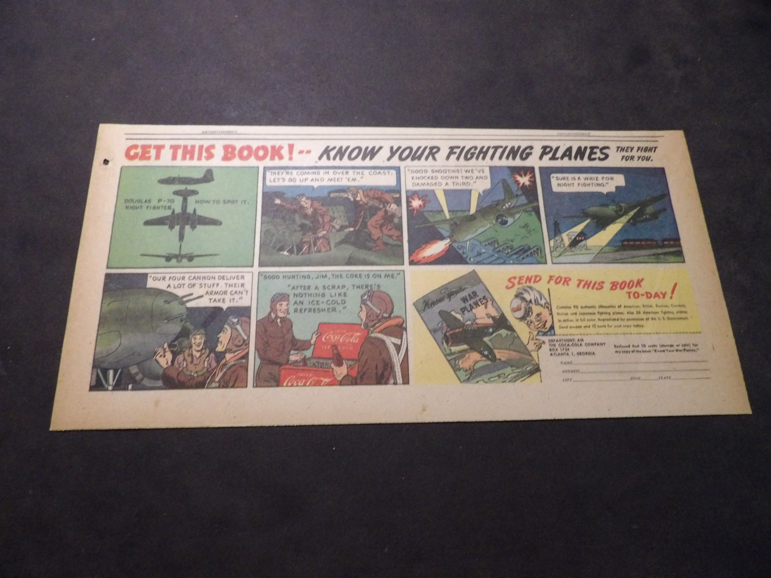 | A007-0226 | Coca-Cola | 1940's - 1TH | G-VG/G-VG/VG | $5.00 | featuring Northrop P-61 Black Widows, 'Know Your Fighting Planes' Book Premium, On reverse Aunt Jemima ad(TH) |