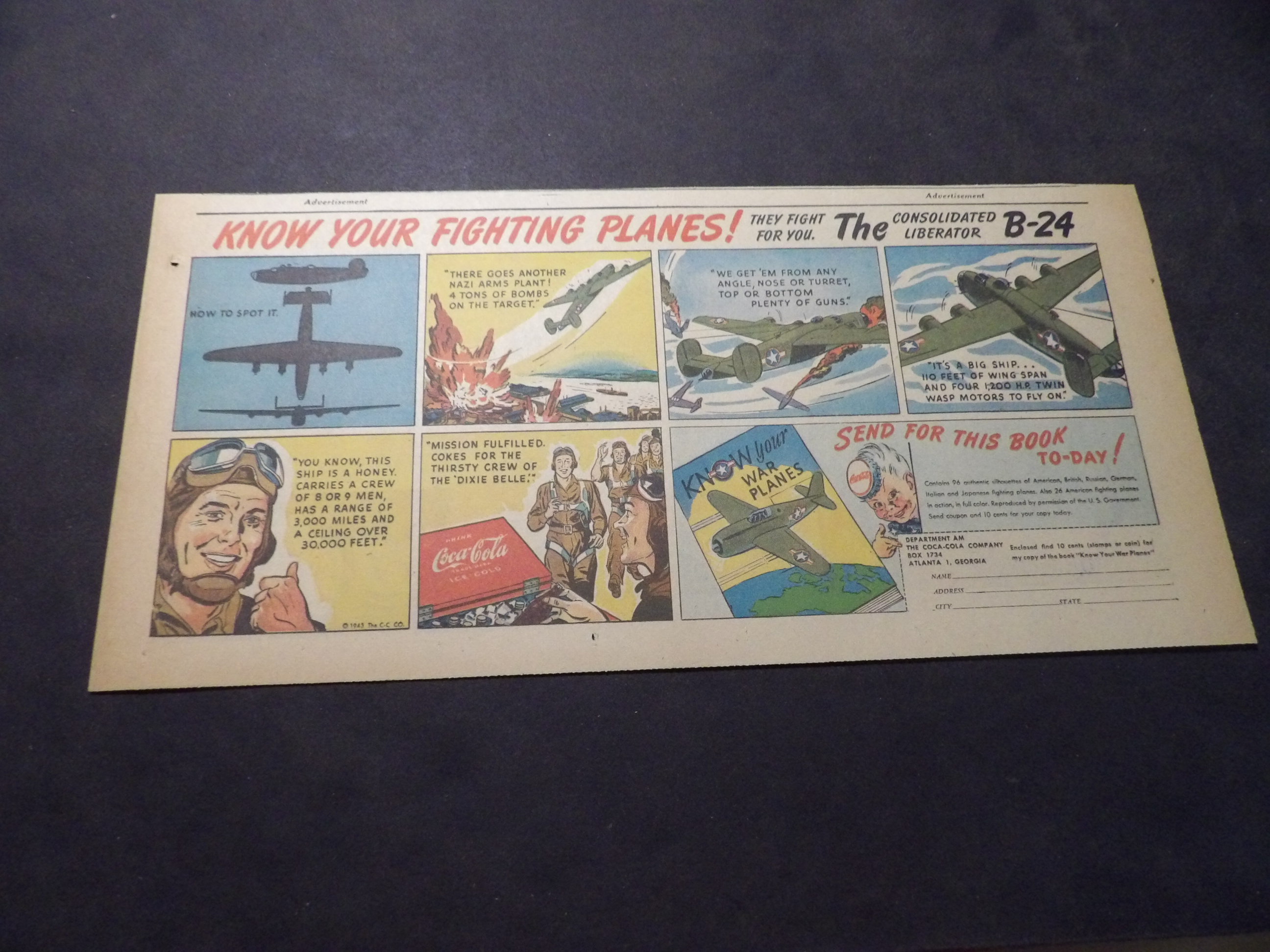| A007-0216 | Coca-Cola | 1940's - 1TH | G-VG/G-VG/VG | $5.00 | featuring Consolidated Liberator B-24, 'Know Your Fighting Planes' Book Premium, On reverse Pond's Cold Cream ad(TH) |