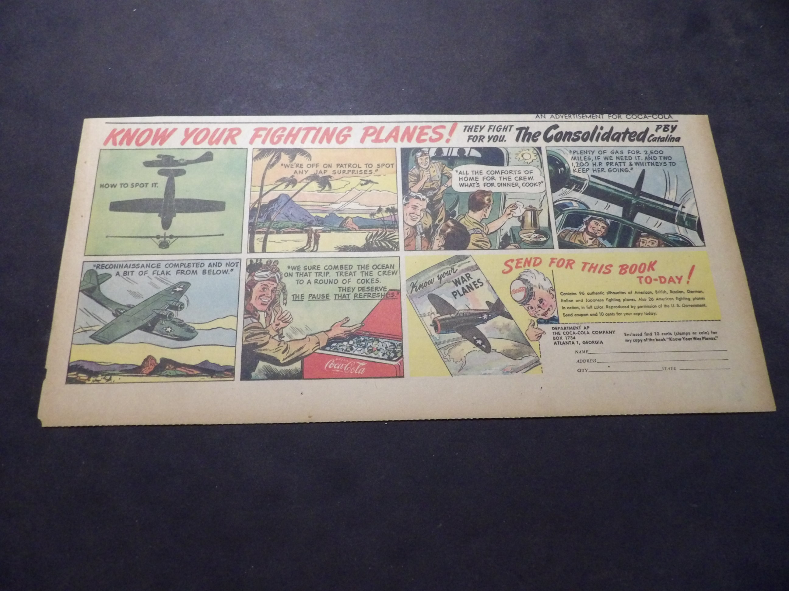 | A007-0217 | Coca-Cola | 1940's - 1TH | VG/VG/VG | $5.00 | featuring Consolidated PBY Catalina, 'Know Your Fighting Planes' Book Premium, On reverse Aunjt Jemima ad(TH) |