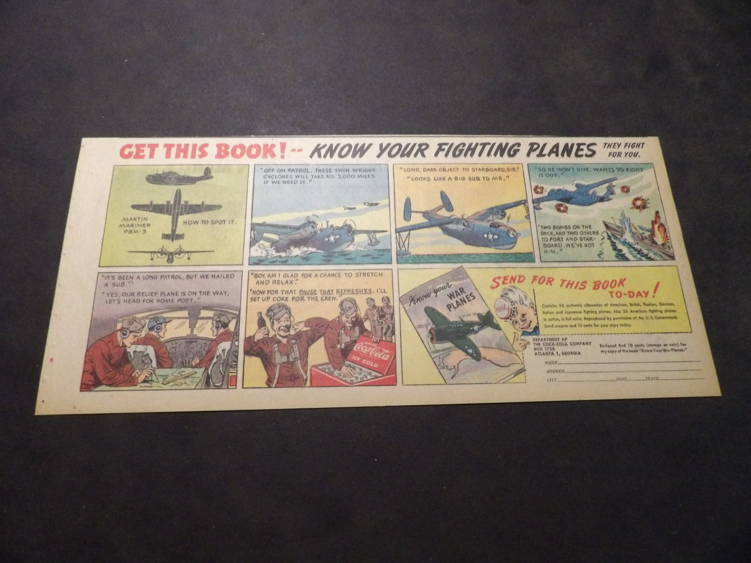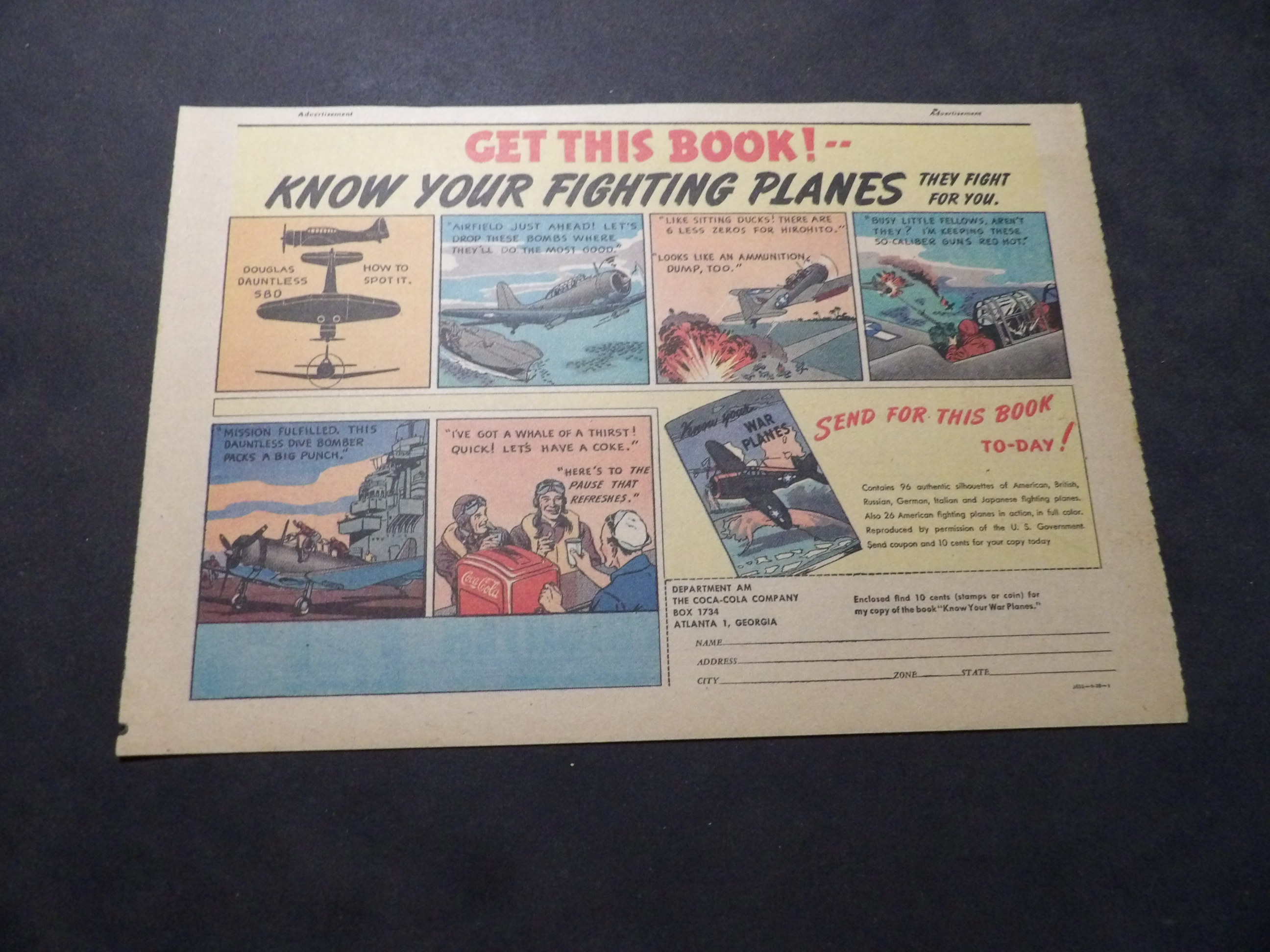 | A007-0218 | Coca-Cola | 1940's - 1HT | G-VG/G-VG/VG | $5.00 | featuring Douglas Dauntless SBD, 'Know Your Fighting Planes' Book Premium, On reverse Pepsodent ad(HT) |