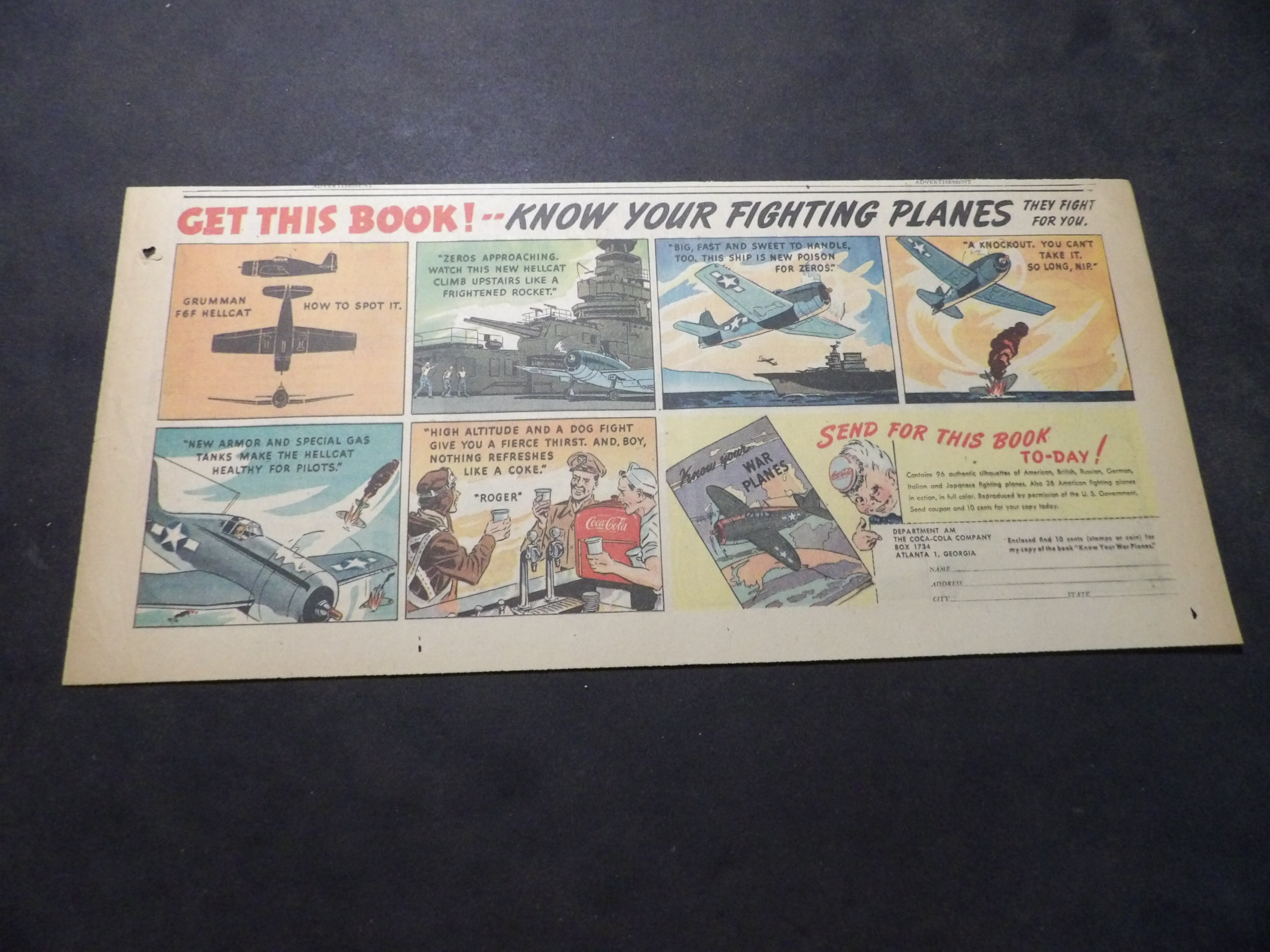 | A007-0220 | Coca-Cola | 1940's - 1TH | G-VG/G-VG/VG | $5.00 | featuring Grumman F6F Hellcat, 'Know Your Fighting Planes' Book Premium, On reverse Listerine Toothpaste ad(TH) |