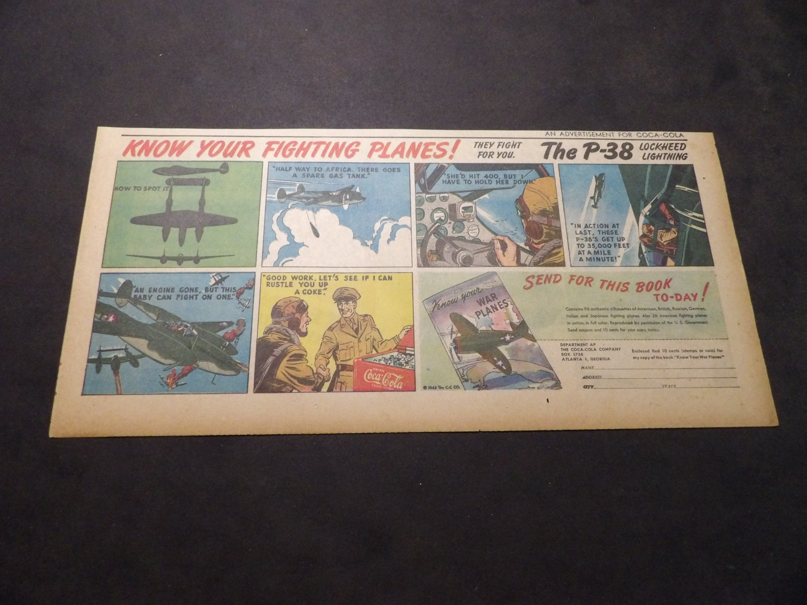 | A007-0221 | Coca-Cola | 1940's - 1TH | G-VG/G-VG/VG | $5.00 | featuring Lockheed Lightning P-38, 'Know Your Fighting Planes' Book Premium, On reverse Listering Toothpaste ad(TH) |