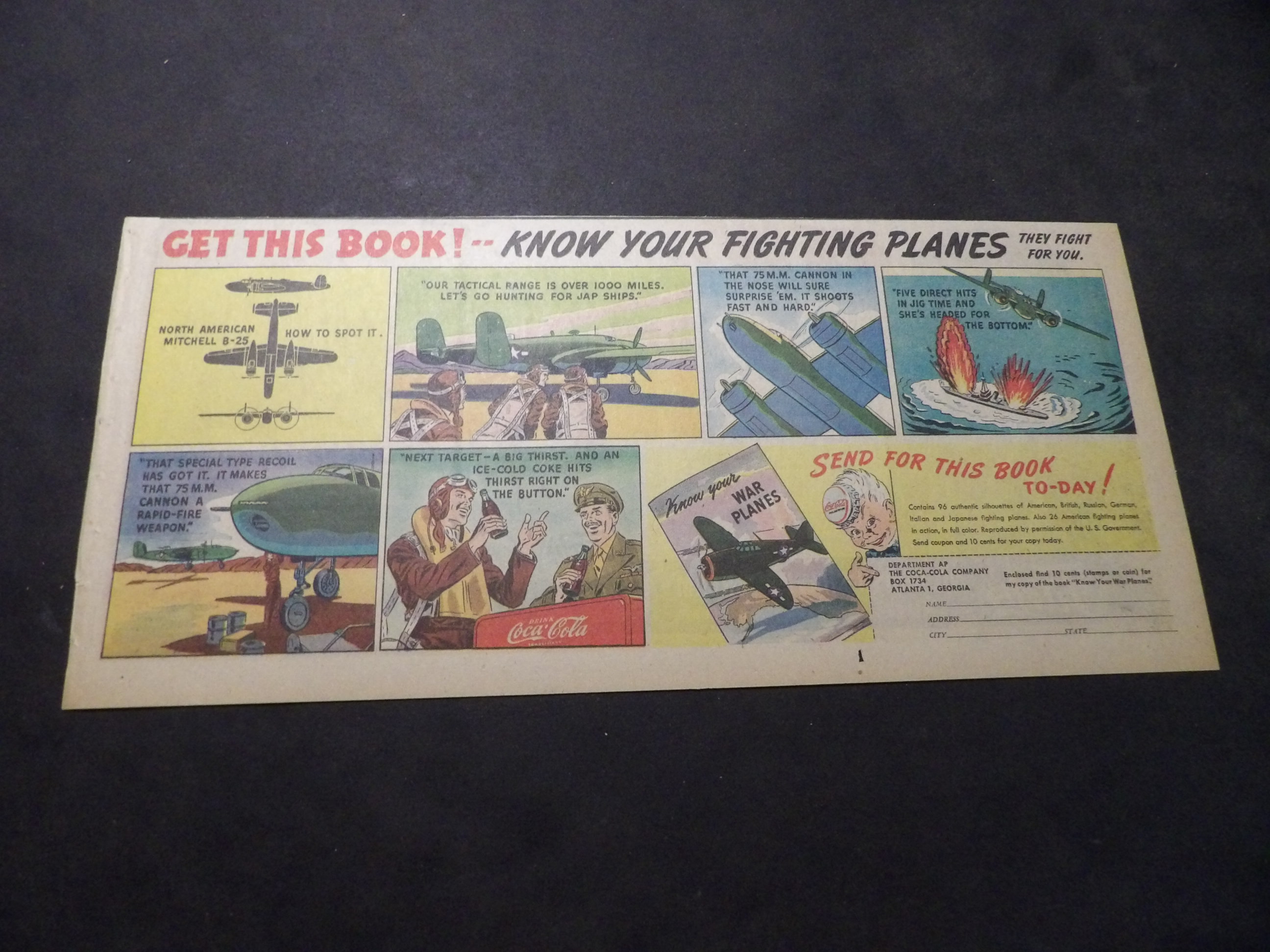 | A007-0223 | Coca-Cola | 1940's - 1TH | G-VG/G-VG/VG | $5.00 | featuring North American Mitchell B-25, 'Know Your Fighting Planes' Book Premium, On reverse Fitch's shave cream ad(TH) |