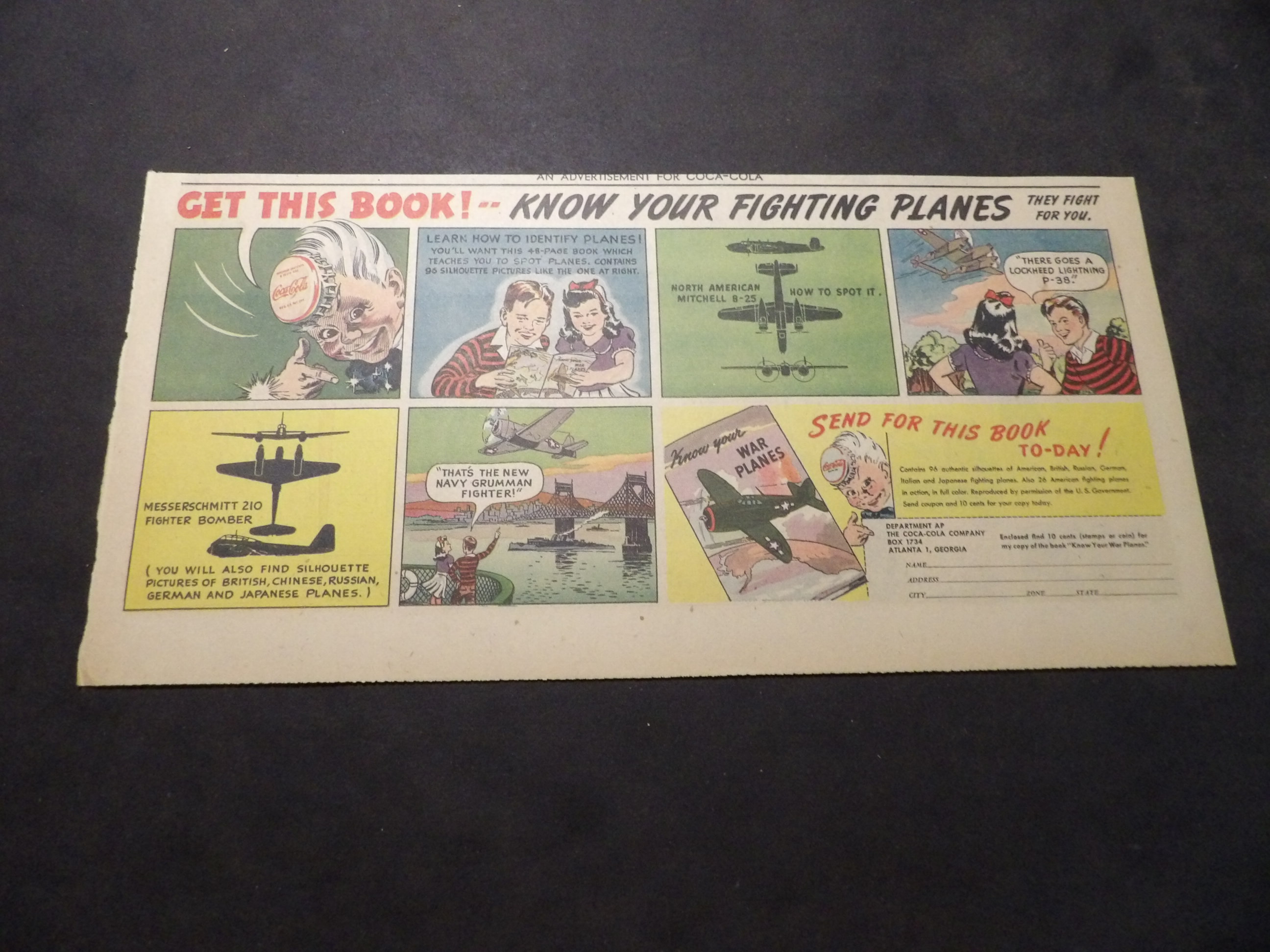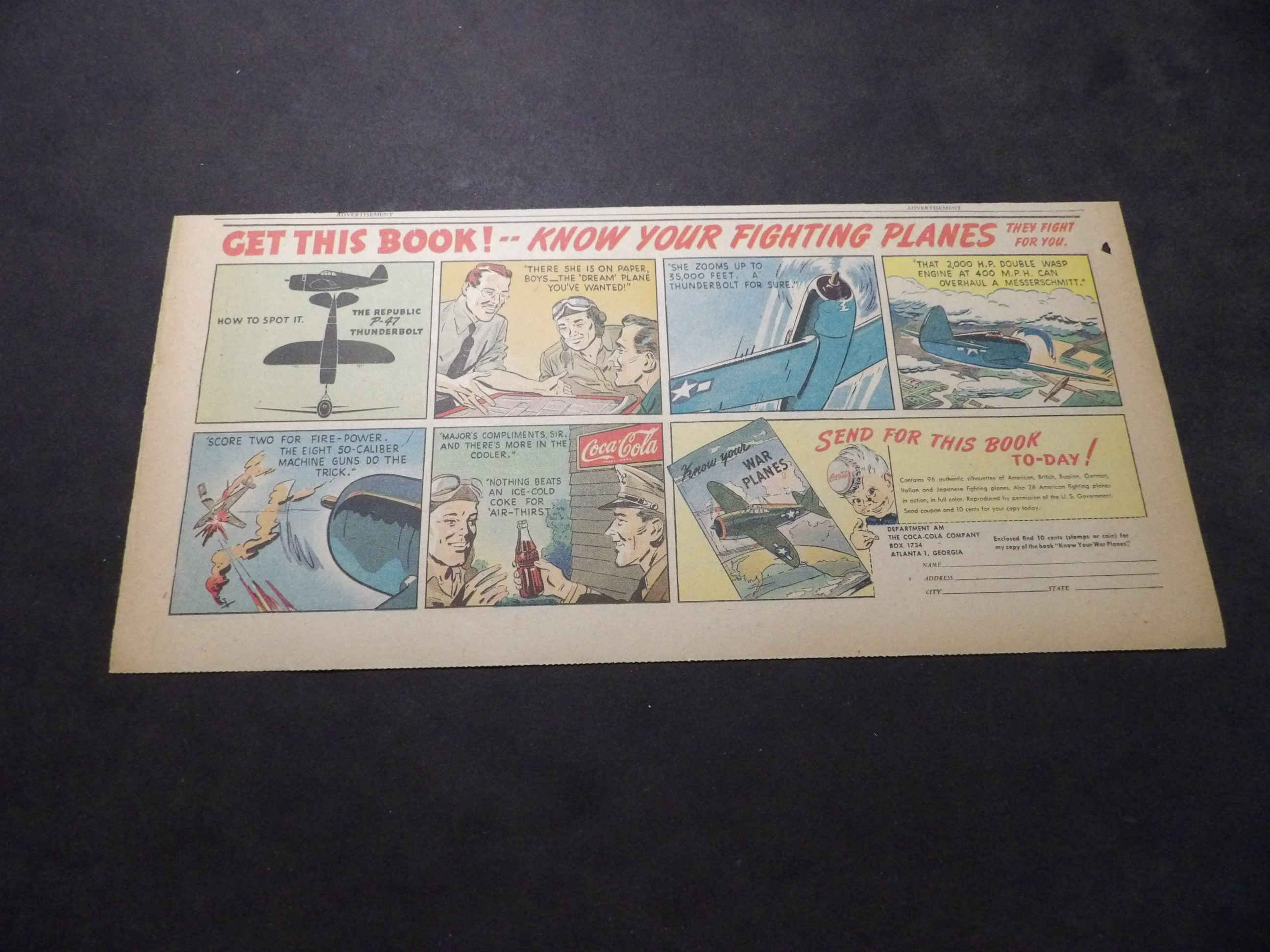 | A007-0227 | Coca-Cola | 1940's - 1TH | G-VG/G-VG/VG | $5.00 | featuring Republic P-47 Thunderbolts, 'Know Your Fighting Planes' Book Premium, On reverse Colgate Toothpaste ad(TH) |