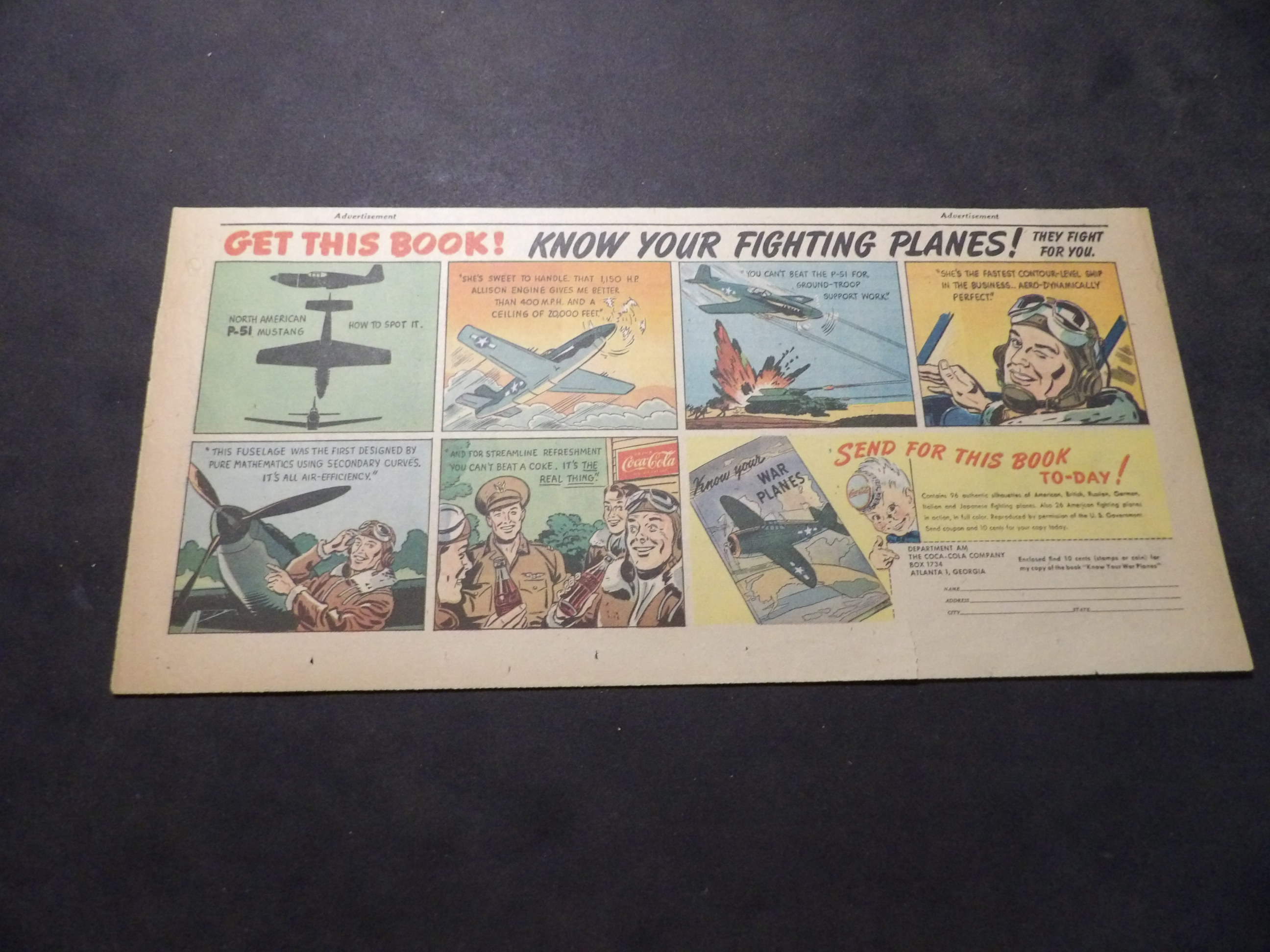 | A007-0225 | Coca-Cola | 1940's - 1TH | G-VG/G/VG | $5.00 | featuring North American P-51 Mustang, 'Know Your Fighting Planes' Book Premium, On reverse Pond's Cold Cream ad(TH) |