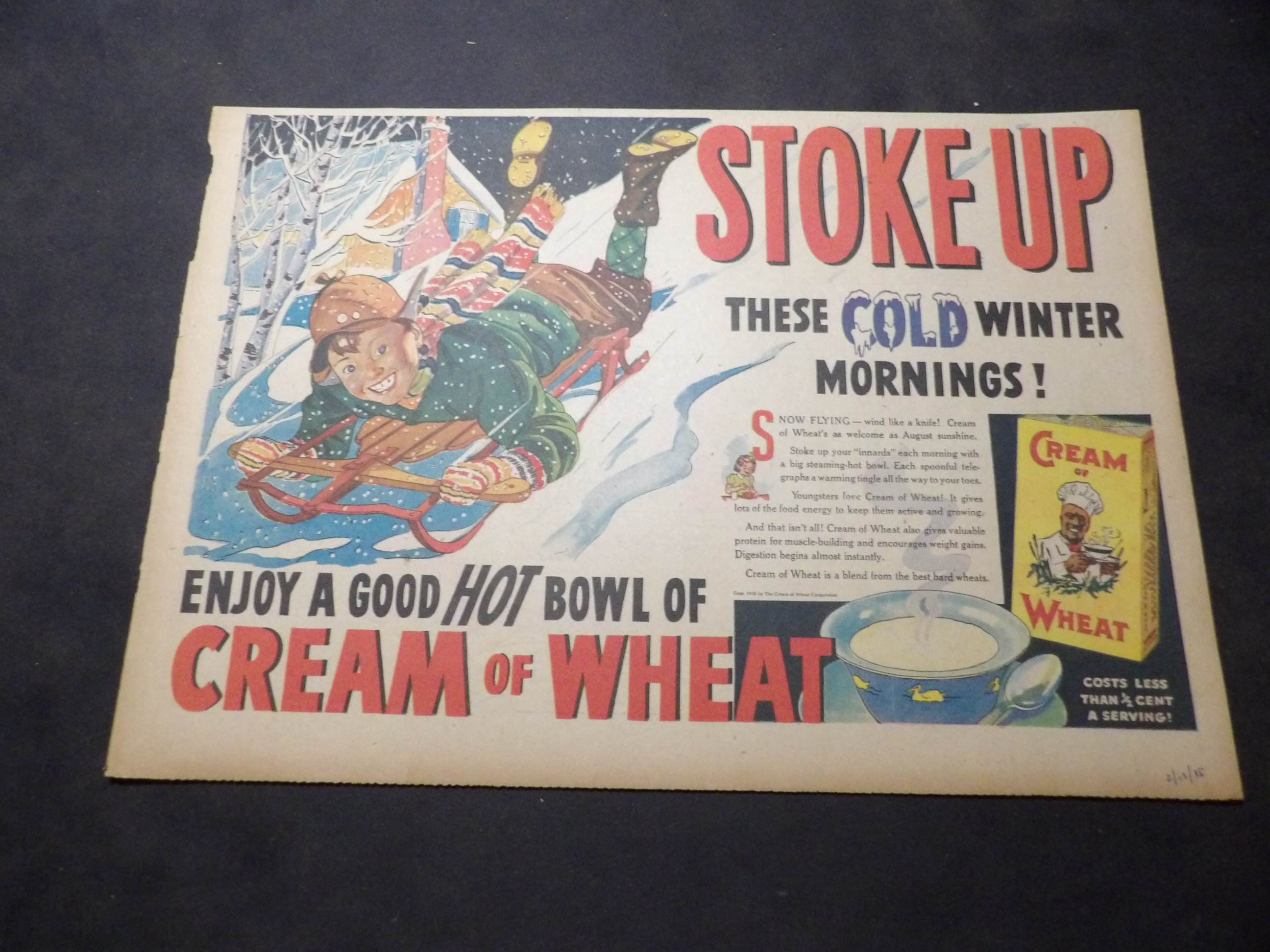 | A007-0169 | Cream of Wheat | 1937/01/31 - H | G/G/VG | $8.00 | 'Fighting his hardest battle now' by Harry Anderson, No reverse |