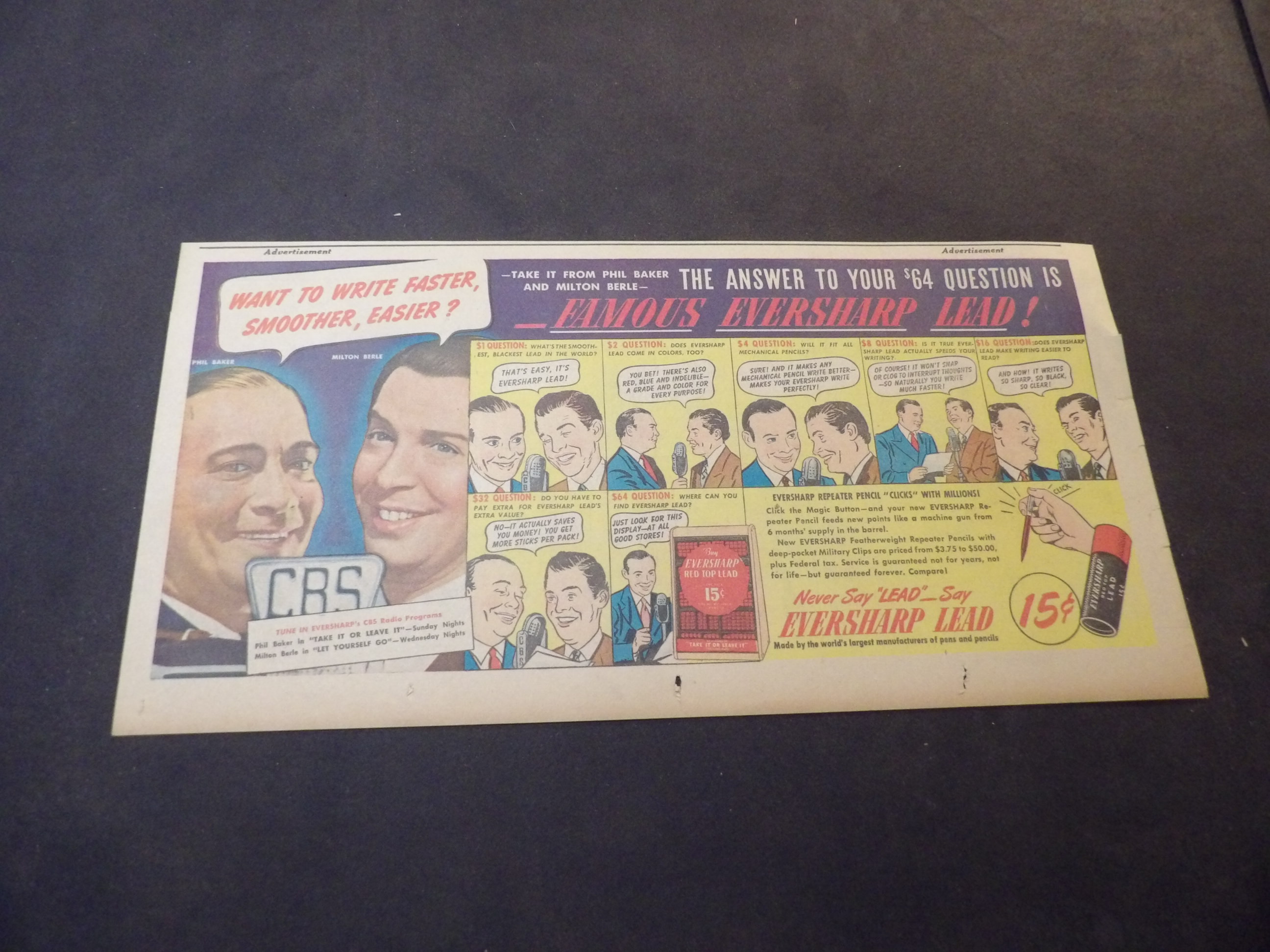 | A007-0236 | Eversharp | 1945 - 1TH | G/G/G-VG | $5.00 | 'featueing Milton Berle and Phil Baker, On reverse Fritzi Ritz(TH) |
