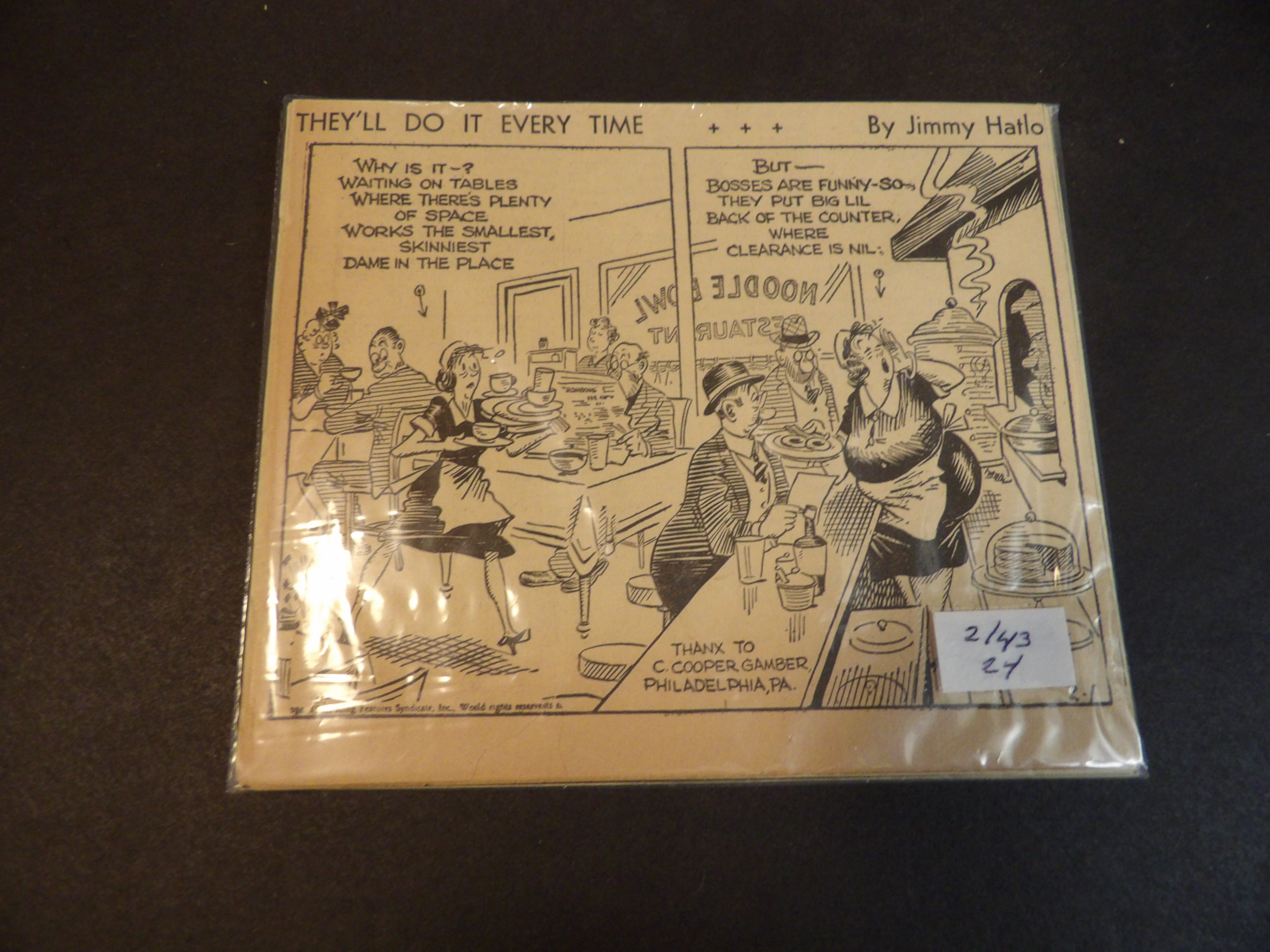 | D026-0024 | They'll Do it Every Time | 1943/02 - 24 | 5x6R | G | $5.00 | by Jimmy Hatlo |