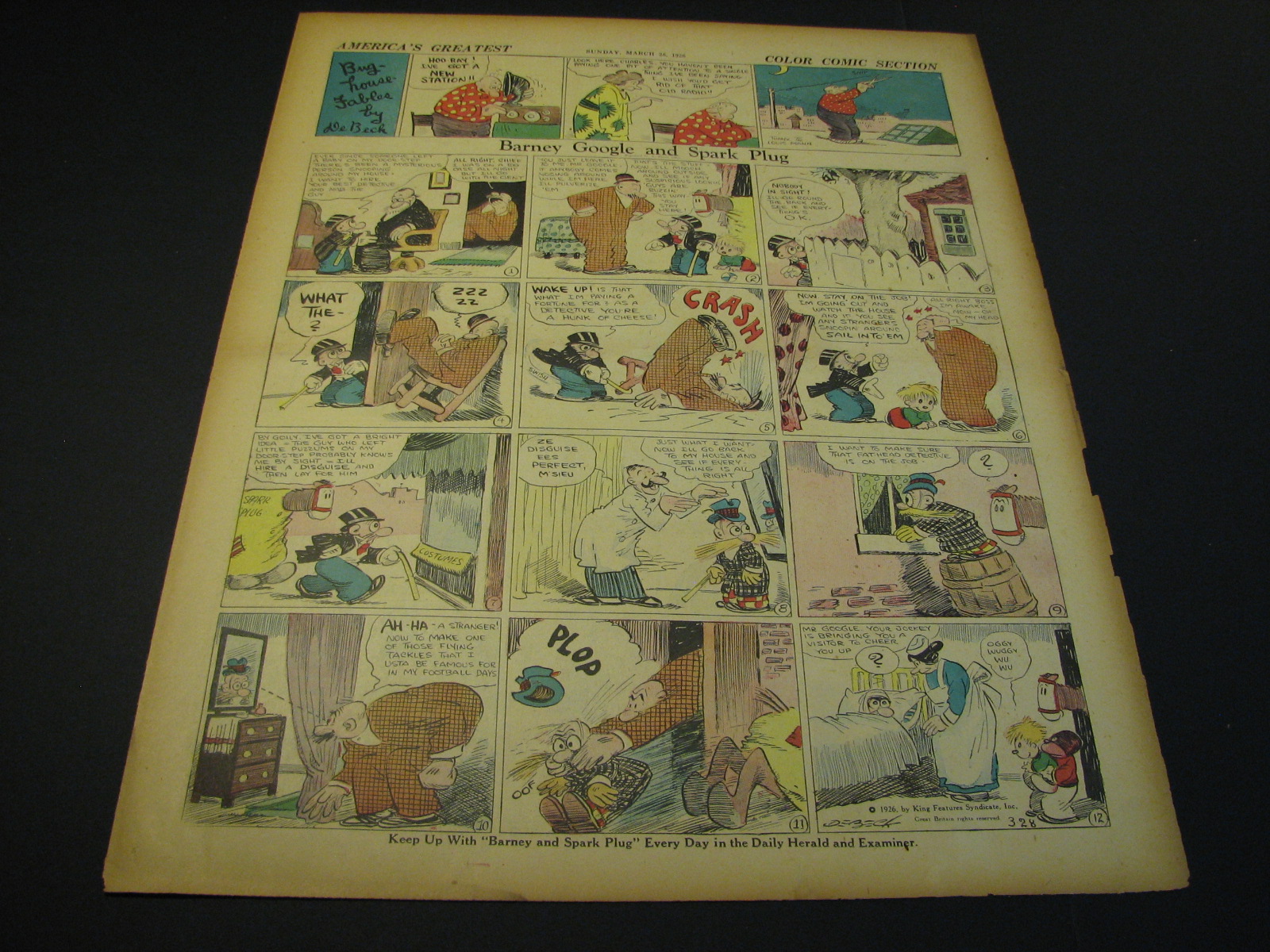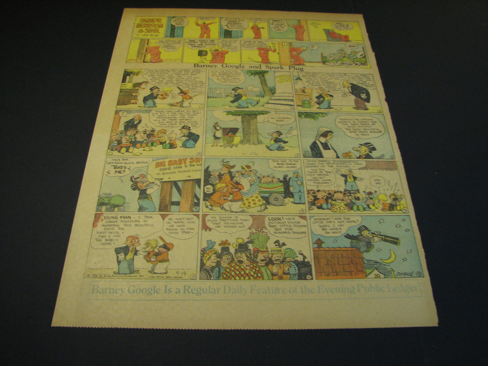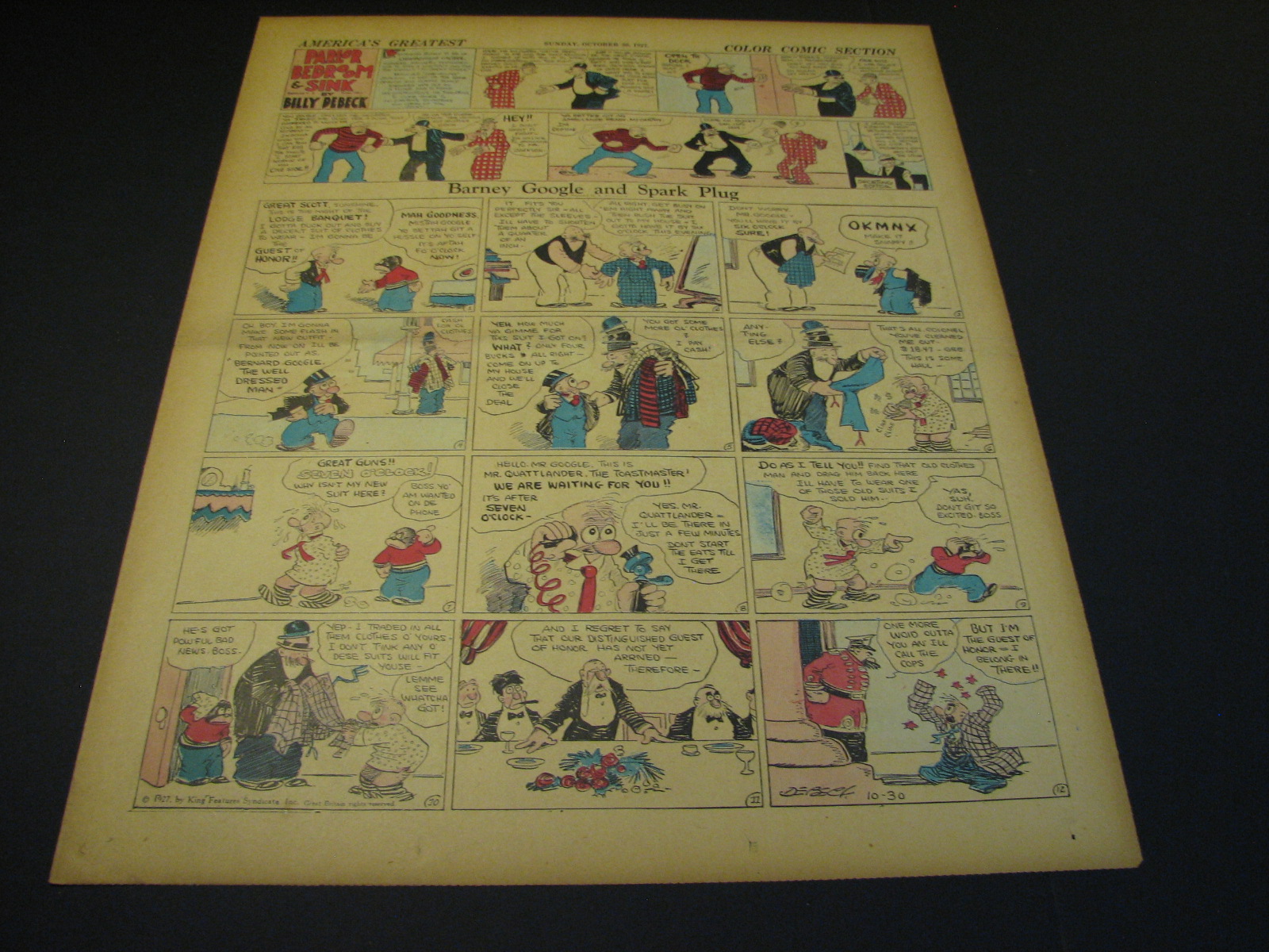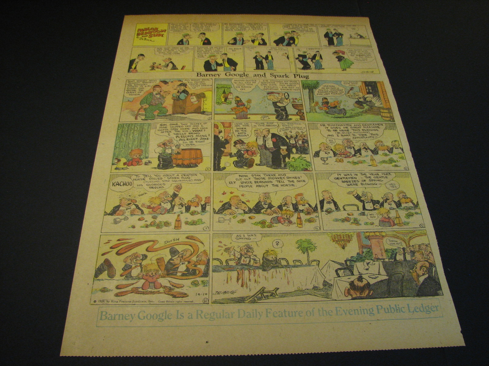 | Barney Google (...and Spark Plug) (...and Snuffy Smith) by Billy DeBeck (0060-) 1st Appeared June 17th, 1919 - Barney Google is the ultimate creation of Billy DeBeck, one of the finest humorists ever to spin a cartoon. Barney Google began as a wonderfully drawn gag strip starring Barney and his very funny mule named Sparkplug. From his first appearance on June 17, 1919 Barney Google became a favorite of the funny pages. Barneys main career under Billy DeBeck was as a horse racing enthusiast. Because of this, Barney was often the dupe for many a racing scheme. This would last for years (this was partly how Sparkplug came into the picture, as a racehorse). Eventually, Barney's luck would hit rock bottom forcing a getaway to the hills in the mid 1930's and an introduction of Snuffy Smith to the strip. The change of scenery was accompanied by a decided change in the demeanor of the strip to southern folk satire. DeBeck got on to proving his versatility in humor for another decade, but sadly, DeBeck died early during the World War II years and Fred Lasswell took over. Under Lasswell, the strip continued in the southern genre, so much so that Snuffy Smith would eventually takeover the strip. The Market for Barney Google by Billy DeBeck is moderately strong, especially those featuring Sparkplug. Color Fulls with Sparkplug from the 1920s move at a premium quite well. The later Fred Lasswell strips have a thin but loyal following. Similarly, the early DeBeck dailies sell very well. |