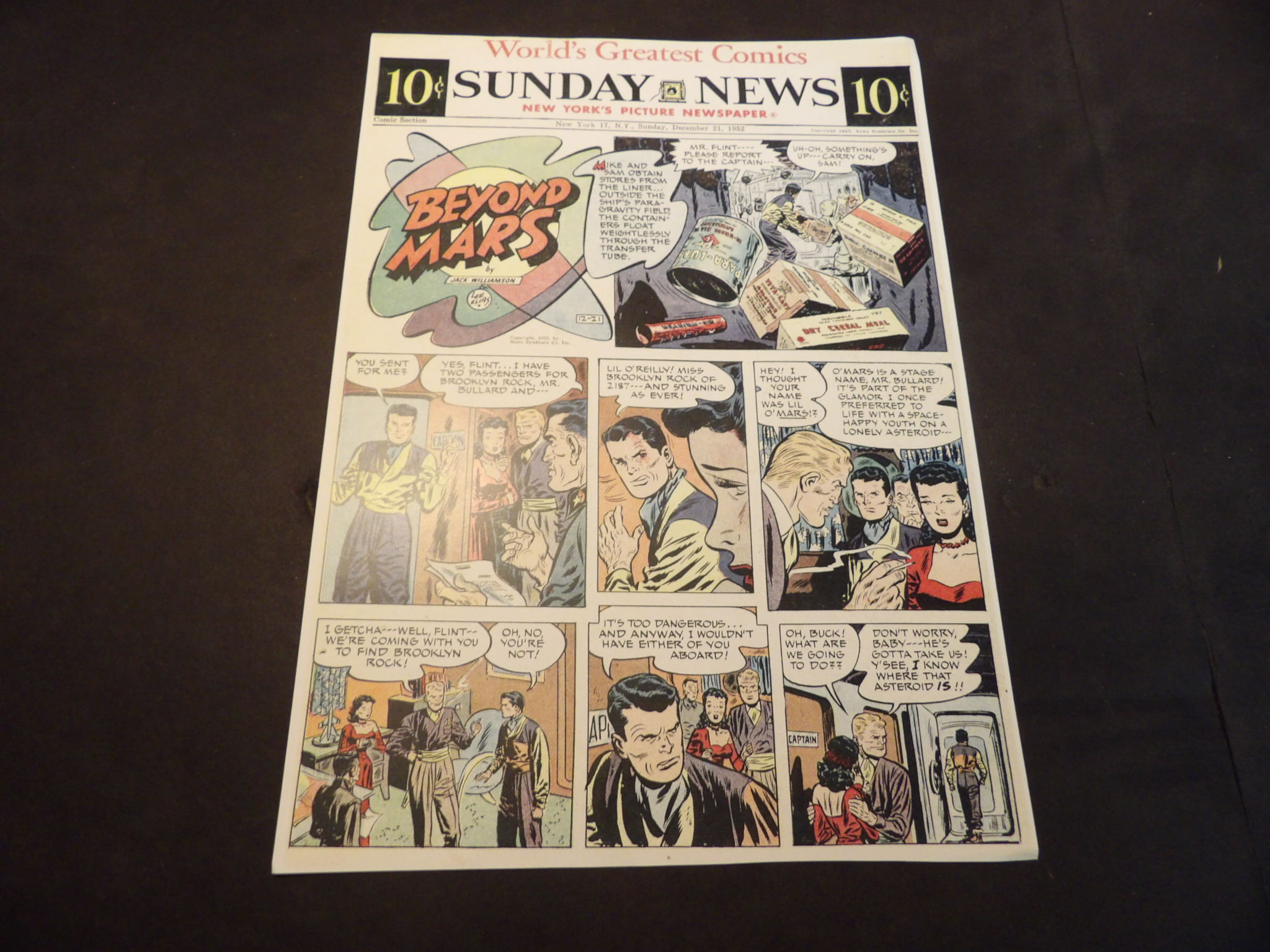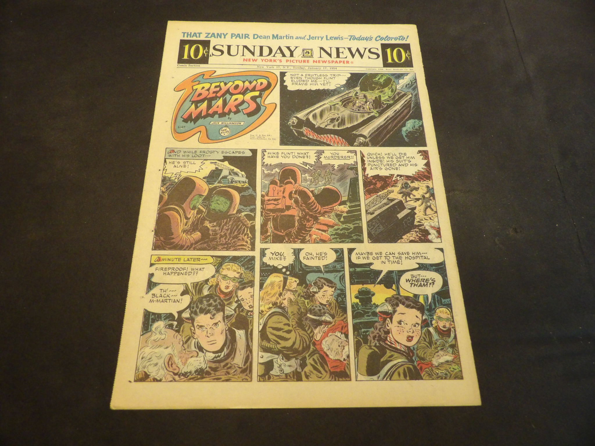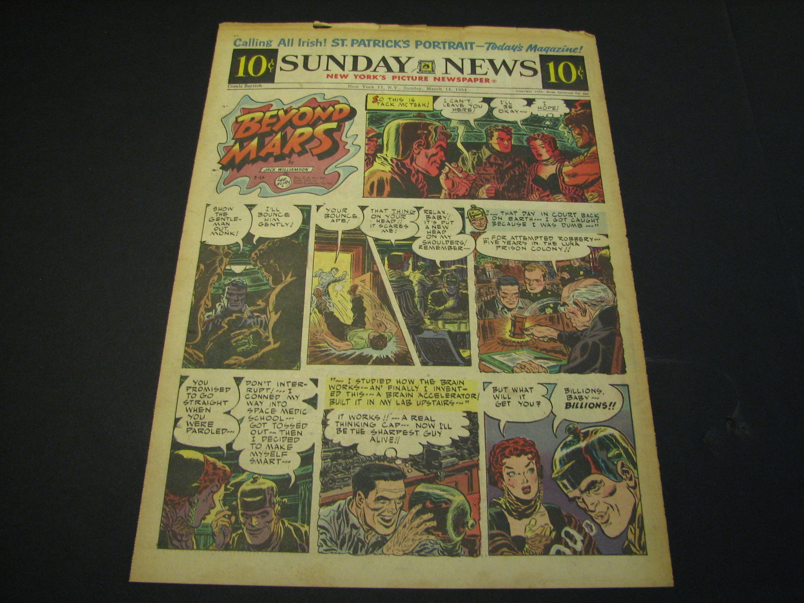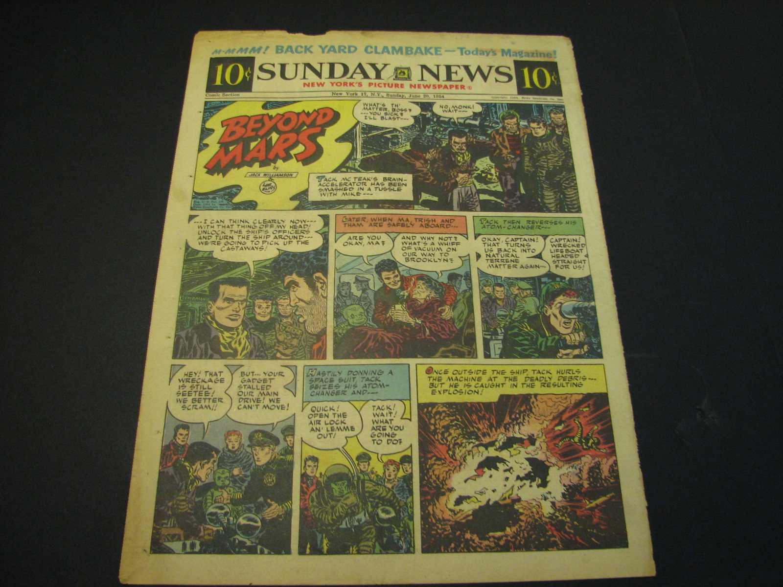 | Beyond Mars by Jack Williamson & Lee Elias (0110-) 1st Appearance February 17, 1952 - In the early 1950's, Science Fiction was as popular as ever. The names of great Science Fiction writers like Arthur C. Clarke and Isaac Asimov would sell millions of pulp digests. The New York Daily News sought to take advantage of this by signing up popular Sci-fi writer Jack Williamson to create an exclusive Sunday-only feature, Beyond Mars. Beyond Mars was an action/adventure continuity strip in space. The stars of the action were Mike Flint and his green Venusian partner Sam Smith. Together they would fight evil villains across the galaxy. The villains were often exaggerated corrupt caricatures which were largely much more interesting that the protagonists themselves. The fine artwork of the strip was provided by Lee Elias, a veteran of the fabulous EC comics bullpen. The market for Beyond Mars is excellent. Offered exclusively as Tabs and Half-tabs, these are very hard to keep in stock even at high premium. The value of the strip escalates due to the popular Sci-fi theme, the great period artwork, and the rarity of a strip that was featured in only a couple of newspapers for only 3 and 1/2 years. (191) | ||||