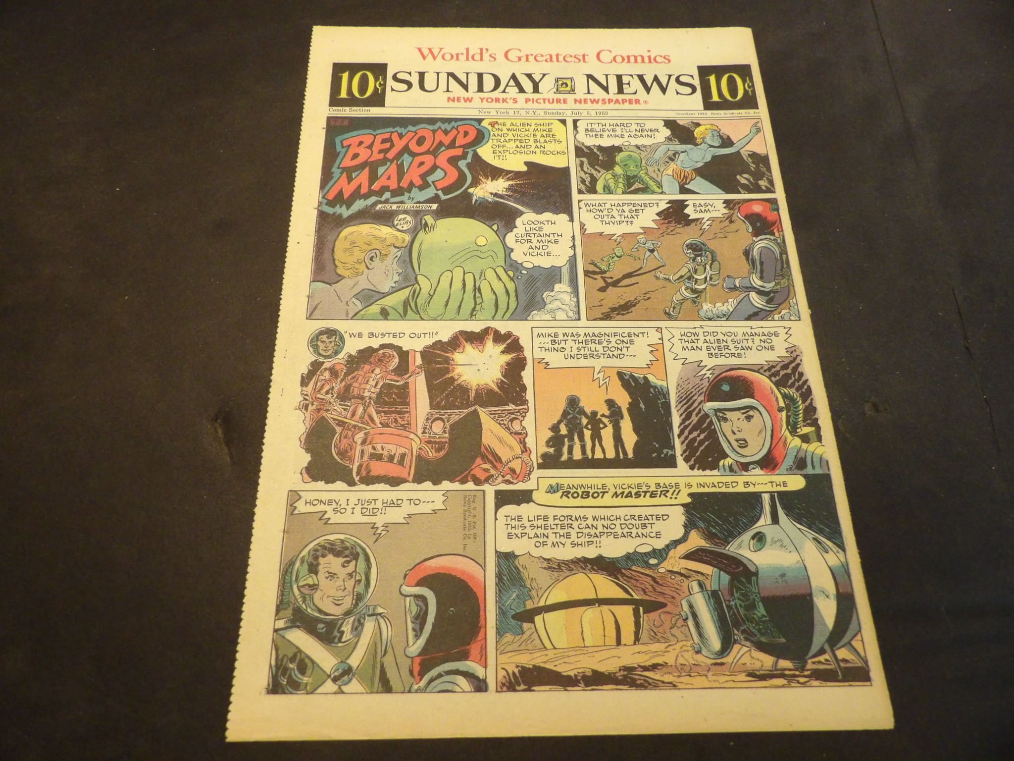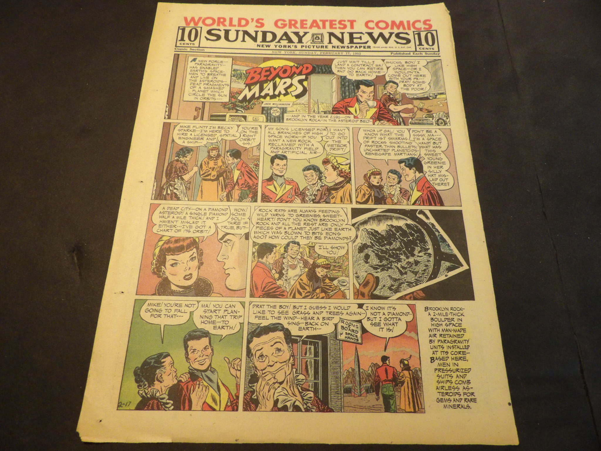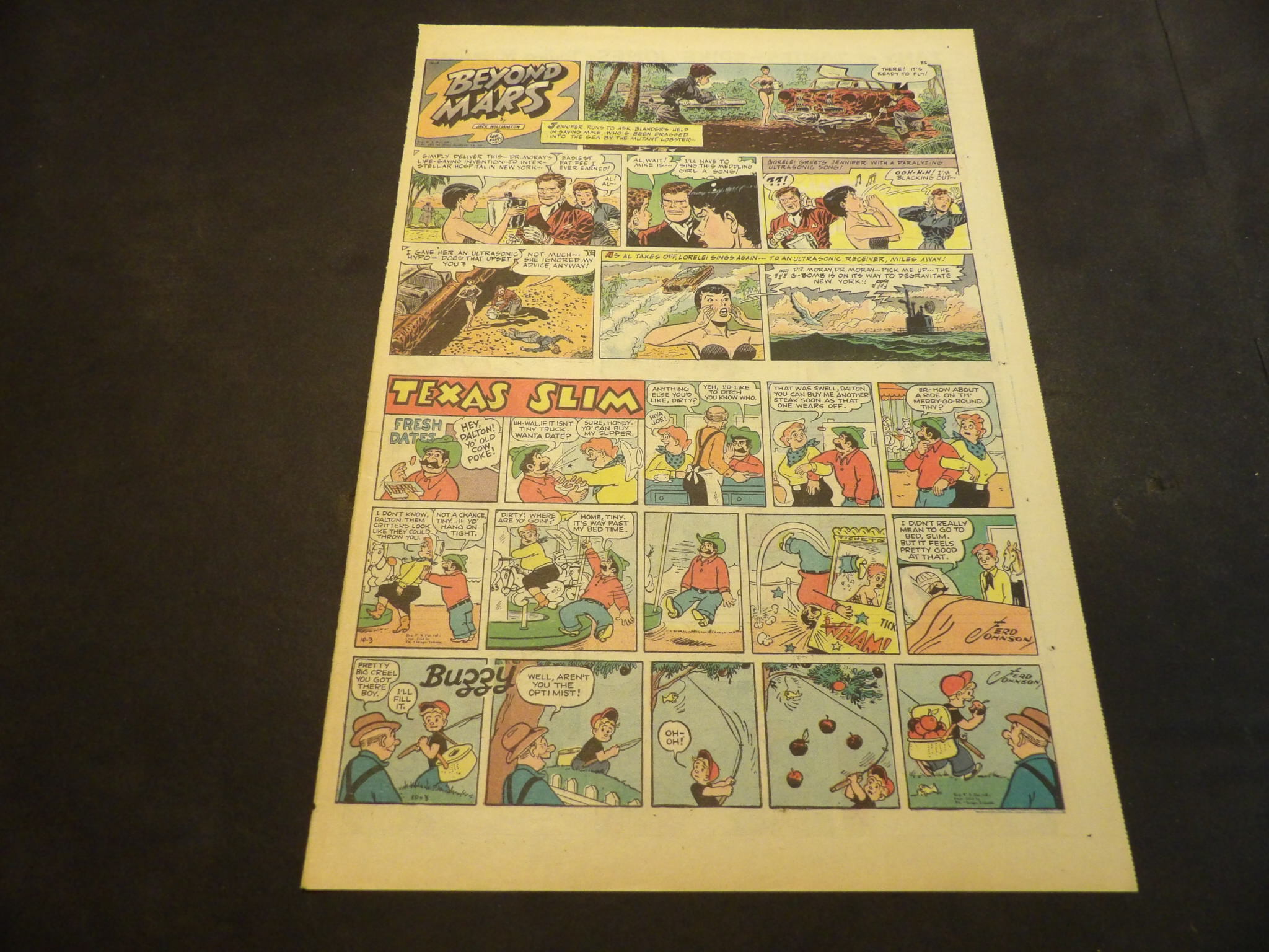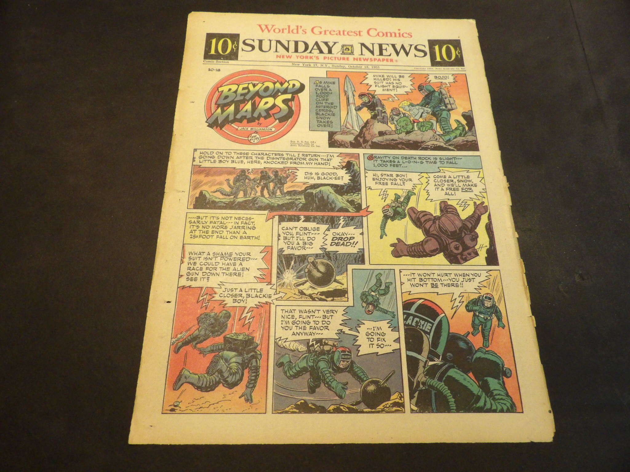 | Beyond Mars by Jack Williamson & Lee Elias (0110-) 1st Appearance February 17, 1952 - In the early 1950's, Science Fiction was as popular as ever. The names of great Science Fiction writers like Arthur C. Clarke and Isaac Asimov would sell millions of pulp digests. The New York Daily News sought to take advantage of this by signing up popular Sci-fi writer Jack Williamson to create an exclusive Sunday-only feature, Beyond Mars. Beyond Mars was an action/adventure continuity strip in space. The stars of the action were Mike Flint and his green Venusian partner Sam Smith. Together they would fight evil villains across the galaxy. The villains were often exaggerated corrupt caricatures which were largely much more interesting that the protagonists themselves. The fine artwork of the strip was provided by Lee Elias, a veteran of the fabulous EC comics bullpen. The market for Beyond Mars is excellent. Offered exclusively as Tabs and Half-tabs, these are very hard to keep in stock even at high premium. The value of the strip escalates due to the popular Sci-fi theme, the great period artwork, and the rarity of a strip that was featured in only a couple of newspapers for only 3 and 1/2 years. (191) | ||||