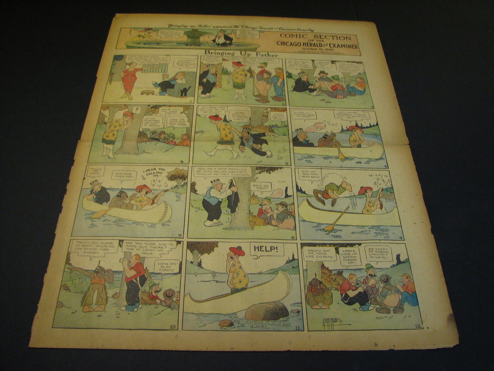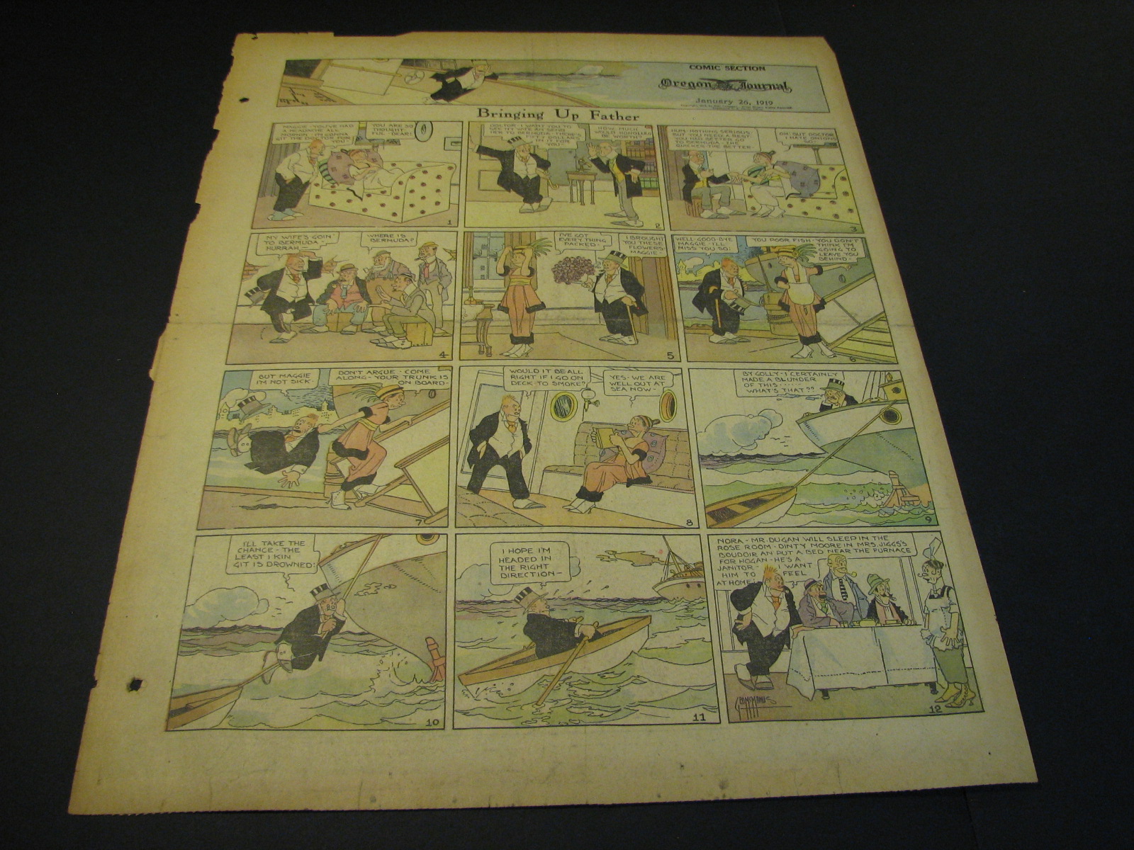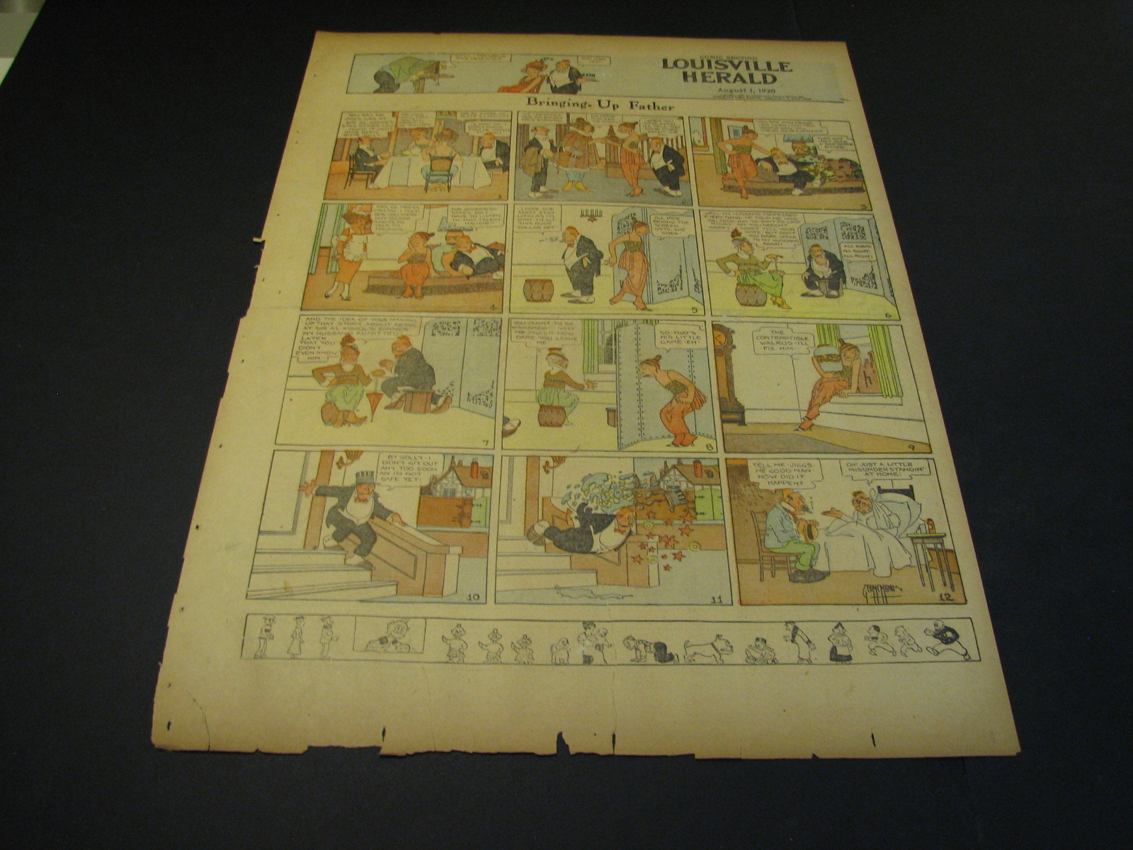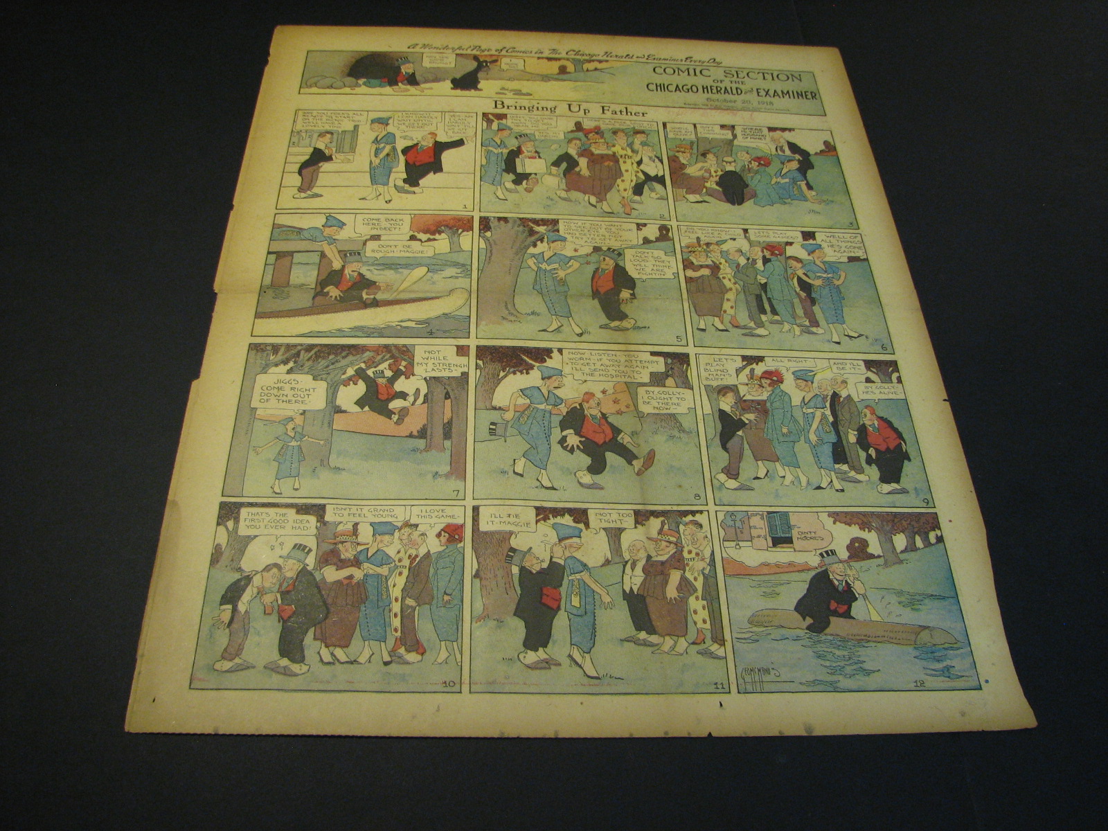 | Bringing Up Father (Jiggs & Maggie) by George McManus (0170-) 1st Appearance January 2nd, 1913, 1st Sunday April 14, 1918 - Jiggs and Maggie was the ultimate creation of one of the fathers of the comics George McManus. Beginning in January 1913, Bringing Up Father was the 1920s-40s equivalent of Blondie, the delightful marriage cartoon which absolutely dominated the era. Jiggs was a displaced common man who stumbled into huge wealth and never, ever, lived up to the hoi-poloi life-style. Maggie was his erudite wife who was the love and bane of his common existence. Throughout close to a century of gags and escapades, the two never left each others side in a delightful I love you but you drive me crazy relationship. The popularity of Bringing Up Father put the strip in virtually every paper in the country through the 10s through the 40s. That means that the supply of these wonderful strips is quite ample and actually depresses their price to the delight of collectors. Dailies sell about as well as Sundays. One note on the sundays, many newspapers through the 1940's (including most Puck sections) would have Bringing Up Father leading off their comics sections, effectively wrapping the rest of the comics beneath it. The result was usually a more pronounced dirty centercrease. This just tends to make clean pages (usually from bound volumes) even more desirable. (781/108) |