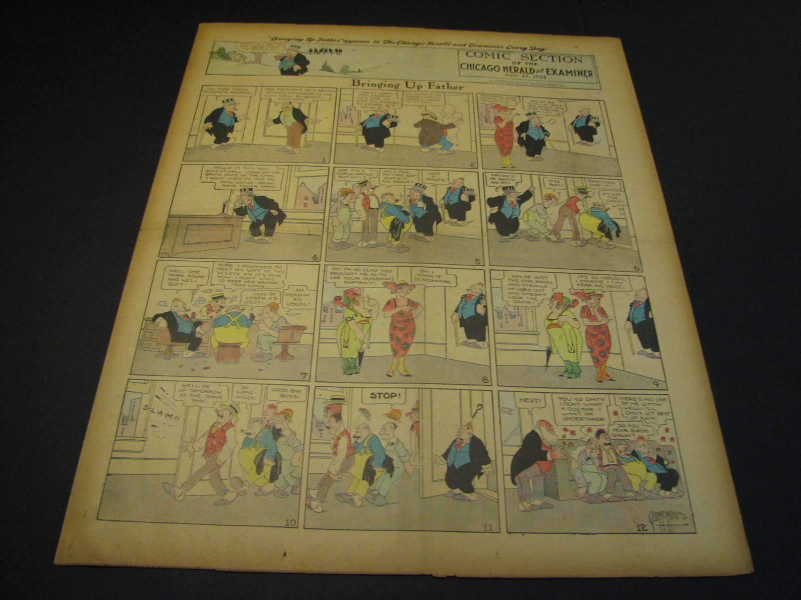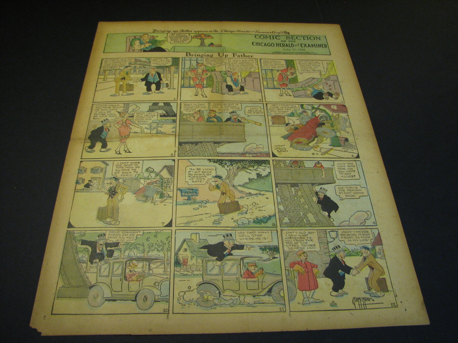 | Bringing Up Father (Jiggs & Maggie) by George McManus (0170-) 1st Appearance January 2nd, 1913, 1st Sunday April 14, 1918 - Jiggs and Maggie was the ultimate creation of one of the fathers of the comics George McManus. Beginning in January 1913, Bringing Up Father was the 1920s-40s equivalent of Blondie, the delightful marriage cartoon which absolutely dominated the era. Jiggs was a displaced common man who stumbled into huge wealth and never, ever, lived up to the hoi-poloi life-style. Maggie was his erudite wife who was the love and bane of his common existence. Throughout close to a century of gags and escapades, the two never left each others side in a delightful I love you but you drive me crazy relationship. The popularity of Bringing Up Father put the strip in virtually every paper in the country through the 10s through the 40s. That means that the supply of these wonderful strips is quite ample and actually depresses their price to the delight of collectors. Dailies sell about as well as Sundays. One note on the sundays, many newspapers through the 1940's (including most Puck sections) would have Bringing Up Father leading off their comics sections, effectively wrapping the rest of the comics beneath it. The result was usually a more pronounced dirty centercrease. This just tends to make clean pages (usually from bound volumes) even more desirable. |