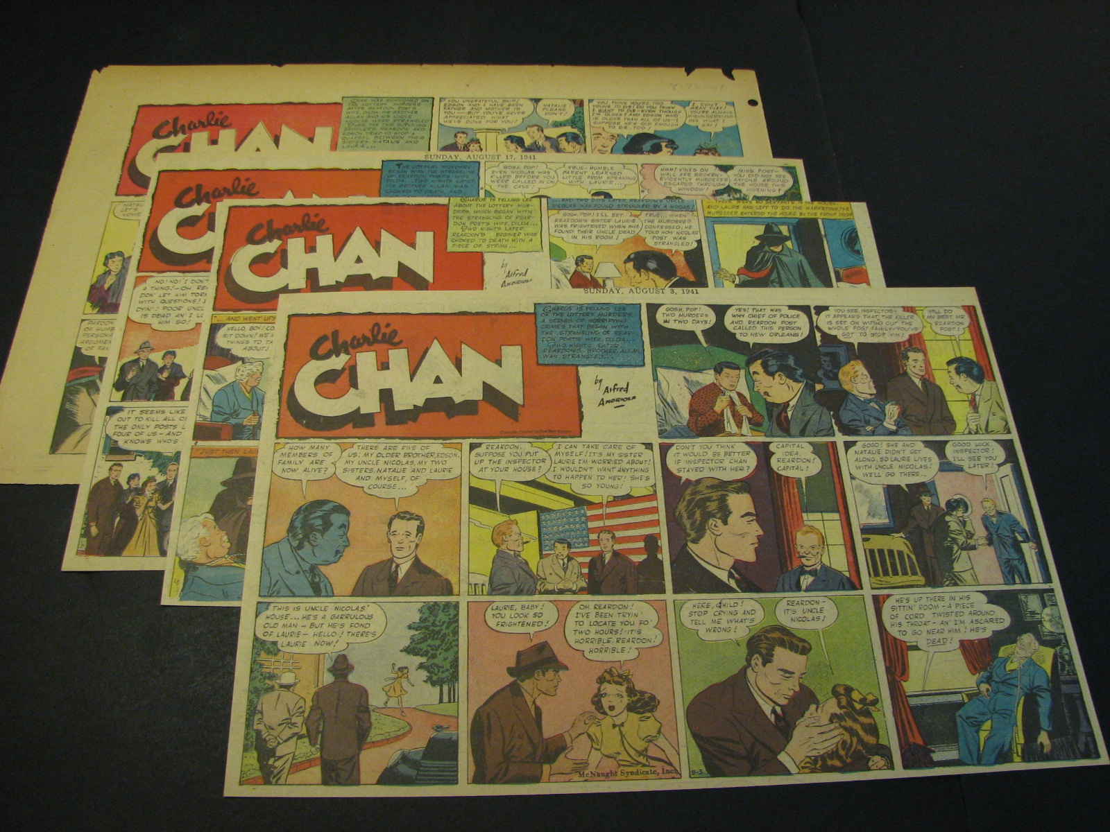 | Charlie Chan by Alfred Andriola (0290-) - Al Andriola adapted the famous Chinese investigator Charlie Chan to comics in 1938. Andriola is known as one of the greatest of american cartoonists who would later lend his great talents to the creation of Kerry Drake. For Charlie Chan's sedentary approach to criminal investigation in other mediums, in the comics there was plenty of action. That action came from Andriolas great story-lines. The artwork was also clean sharp and appealing as was always the case with Andriola work. The Charlie Chan run was short and sweet making the strip a premium strip on the secondary market. Add in the clique popularity of the main character and you have the recipe for a hot-selling title. Runs of Sundays are becoming uncommon, more and more these are offered as single strips. Those Sundays usually were never larger than Half-page size. Dailies are downright scarce and are an immediate sell at high premium. | ||||