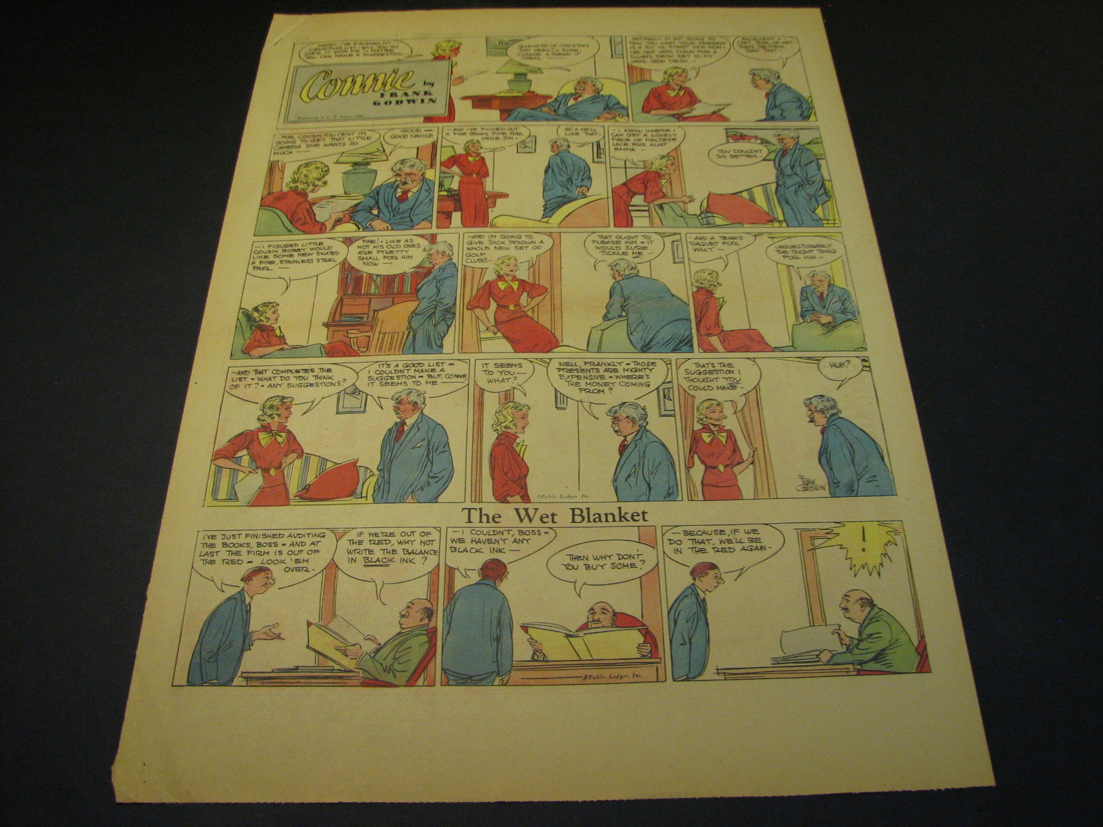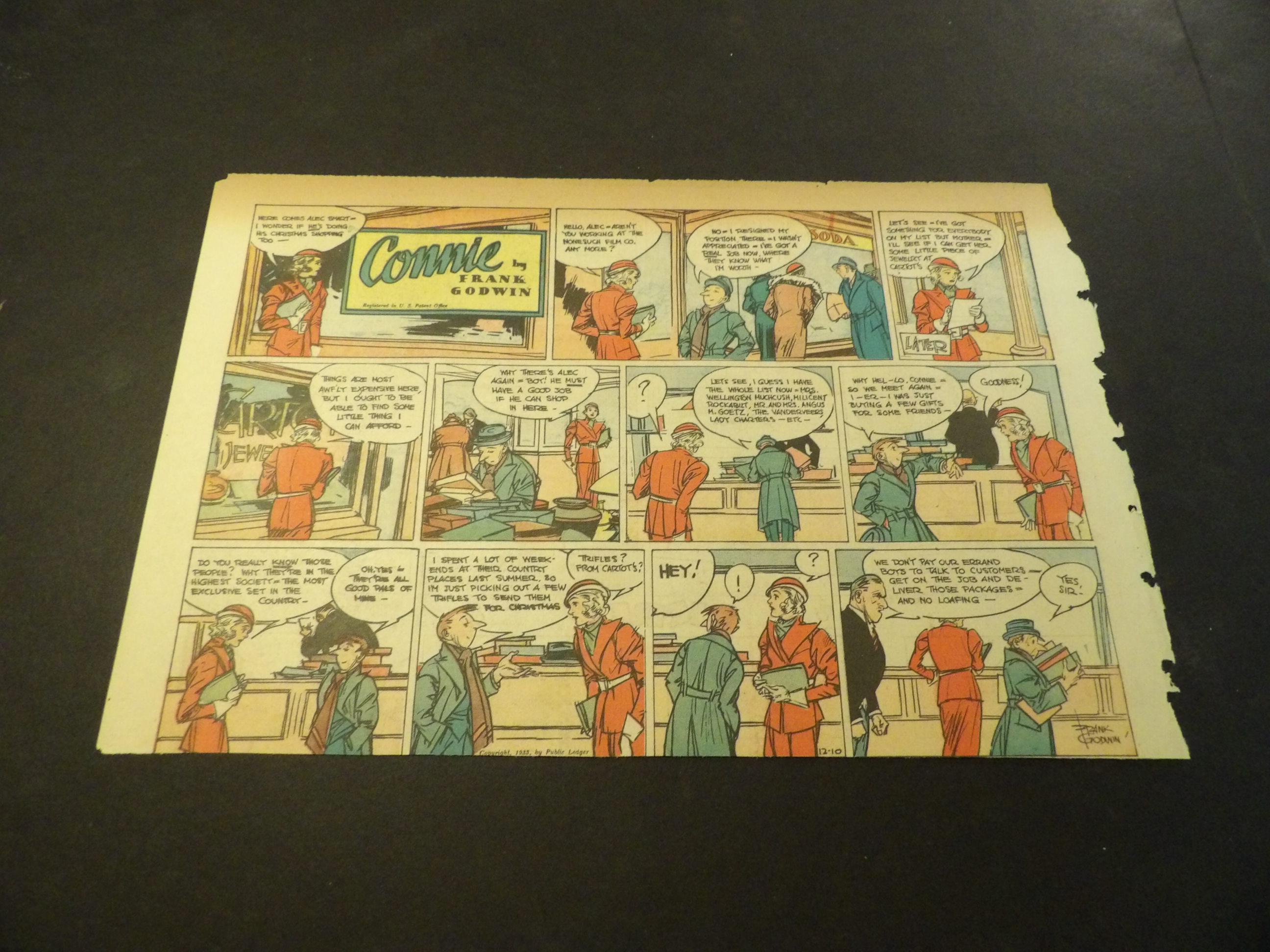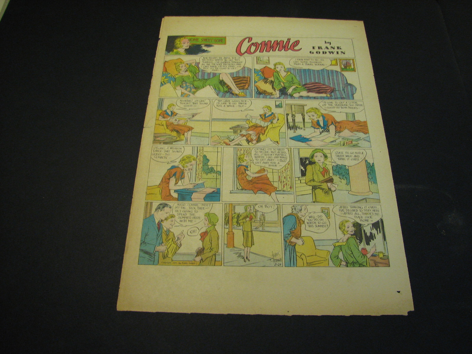 | Connie by Frank Godwin (0320-) 1st Sunday November 13, 1927, 1st Daily May 13, 1929 - The popularity of Connie in collector’s circles is directly attributable to the talent of the strip’s creator Frank Godwin. Godwin is acknowledged to be not only a wonderful cartoonist but as one of America’s great artists, a rare height that few professionals reach. Connie began in 1927 as one of the typical Flapper strips of the roaring 20’s. The strip would evolve into an adventure strip in the early 30’s as the depression forced many of the flappers to get a job. The big draw for collector’s would come in the mid-to-late 30’s when the strip dabbled in science fiction. Throughout all of these eras, the artwork of Frank Godwin was a wonderful constant. Sales of full-page full-size Connie are brisk, the sci-fi strips of the late 30’s sell at a very high premium and are rarely offered. The dailies are ever rarer and also sell very well.(29) | ||||