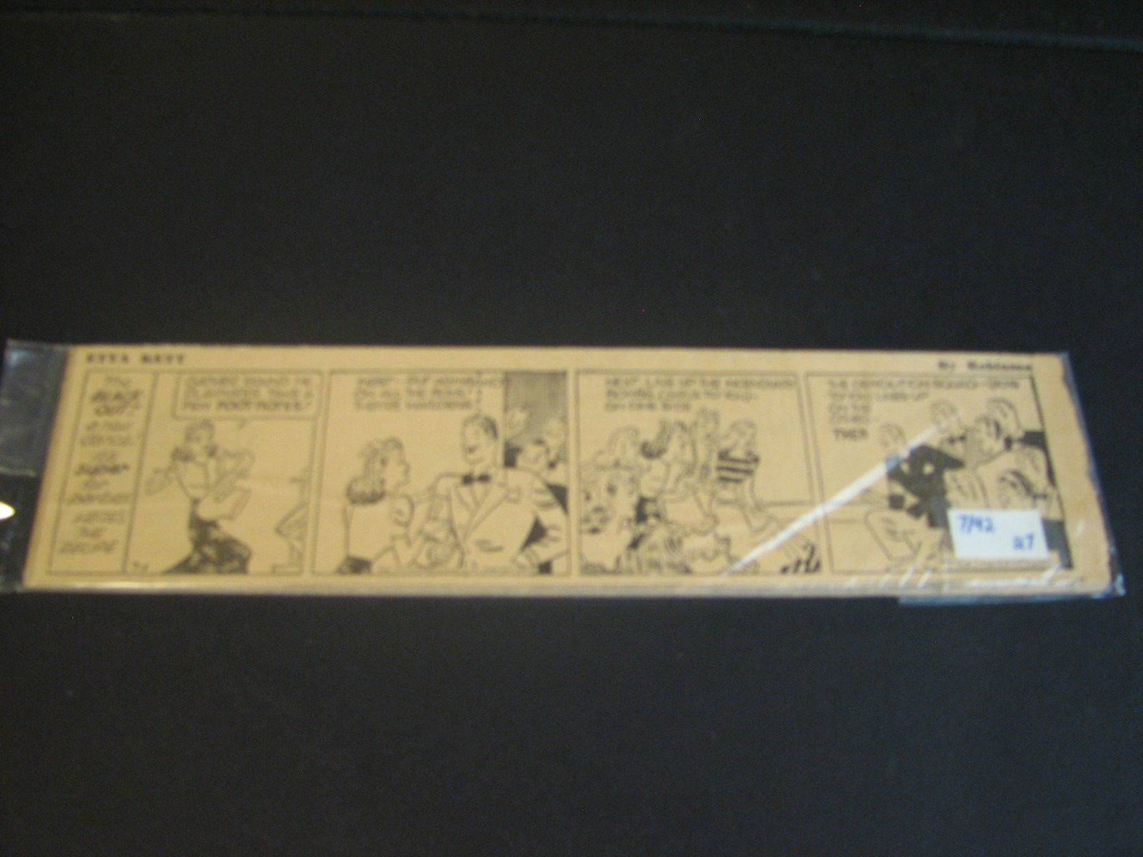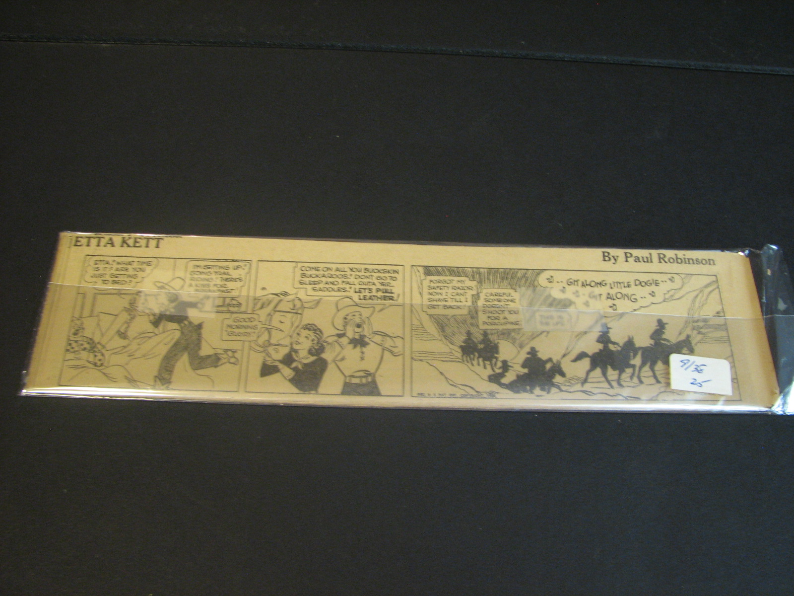 | Etta Kett by Paul Robinson (0500-) 1st Appearance December, 1925 - Beginning in late 1925, Etta Kett was another of the flapper strips stemming from the 1920's. Like those that survived the era, Etta Kett had to metamorphosize away from the frivolous flapper mentality to attract Great Depression and beyond readers. For Etta Kett this was largely accomplished by putting Etta into a more college-like setting and making her the proper opposite to her somewhat wolfish boyfriends. Like most of the flapper strips, Etta Kett has a thin following with minor exceptions. Paul Robinson fully participated in the paper novelty craze of the 1930's. Full-Size Etta Kett pages with Play Money and Paper Dolls sell quite well at the usual premium. (23/89) | |||
