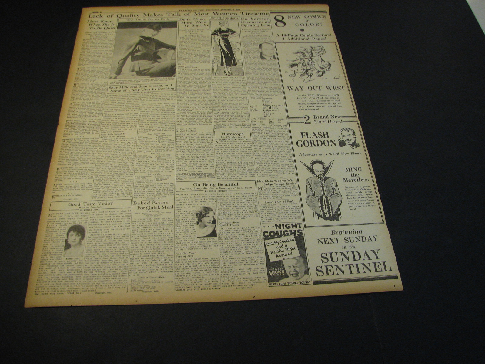 | S0530-0004 | 1934/01/04- F BW | G/G/VG | $12.00 | Approximately 12"x10" on full-size page, advertisement for Flash Gordon by Alex Raymond and Way Out West by Vic Forsythe 'starting this sunday' in the Milwaukee Sentinel. Ad contains a small single sample illustration Flash and Ming. Pre-dates Flash's first appearance. (Same as 1/5/1934) |