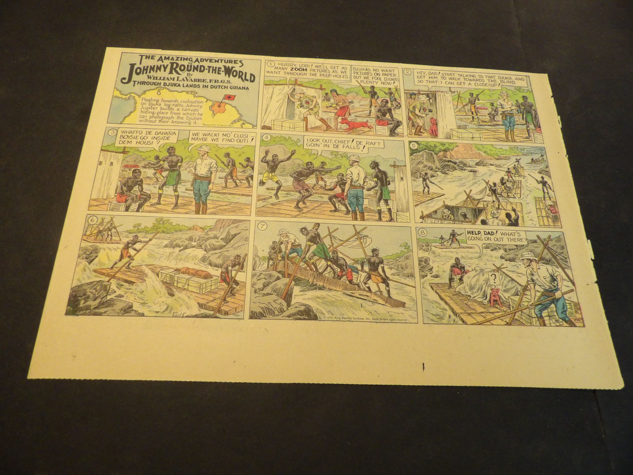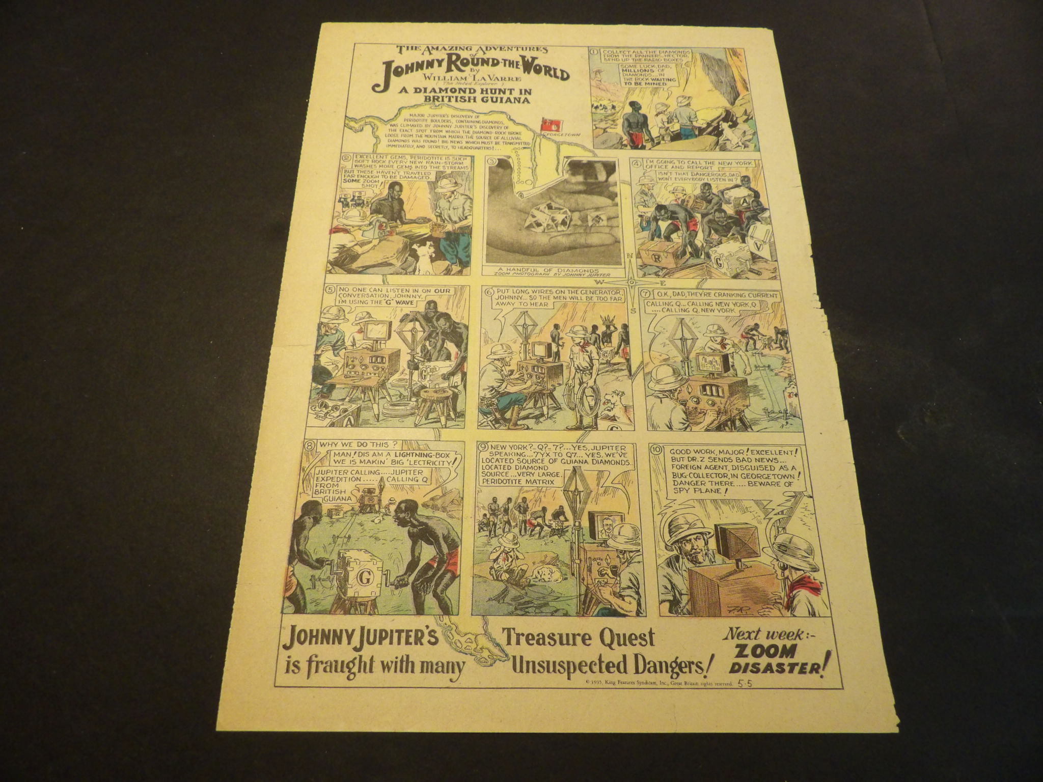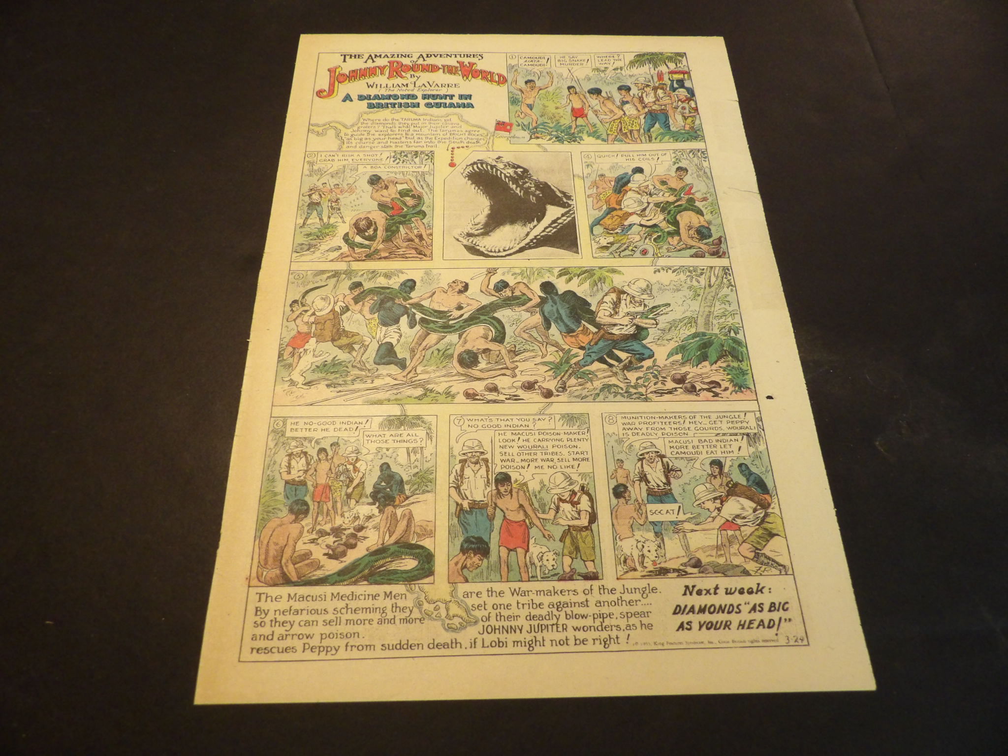 | Johnny Round-The-World by William LaVarre (0700-) First Appearance December 23, 1934 - Johnny Round-The-World was the sunday comic creation of William LaVarre, a popular world-traveling explorer of some note. The hero of the strip was Johnny Jupiter the young son of Major Jupiter, South American Explorer. Johnny went on his adventures equipped with a Zoom Camera which looks more like a Buck Rogers Zap Gun than a camera. As the action moved across jungle settlements, a picture of native life would get taken (by Johnny). There wasn't a lot of action in the stories, the strip acted more as a tour of the country and its natives. This snapshot within the strip was the novelty of the strip, but the classic 1930's artwork on the strip was also visually appealing. Coupled with the mystique of the LaVarre name, it makes for a strip that collectors find very appealing. The run of the strip was short (1935-37) so supply is pretty tight. Printed as mostly as Tabs or Halfs, both sell very well at a high premium. (120) | ||||