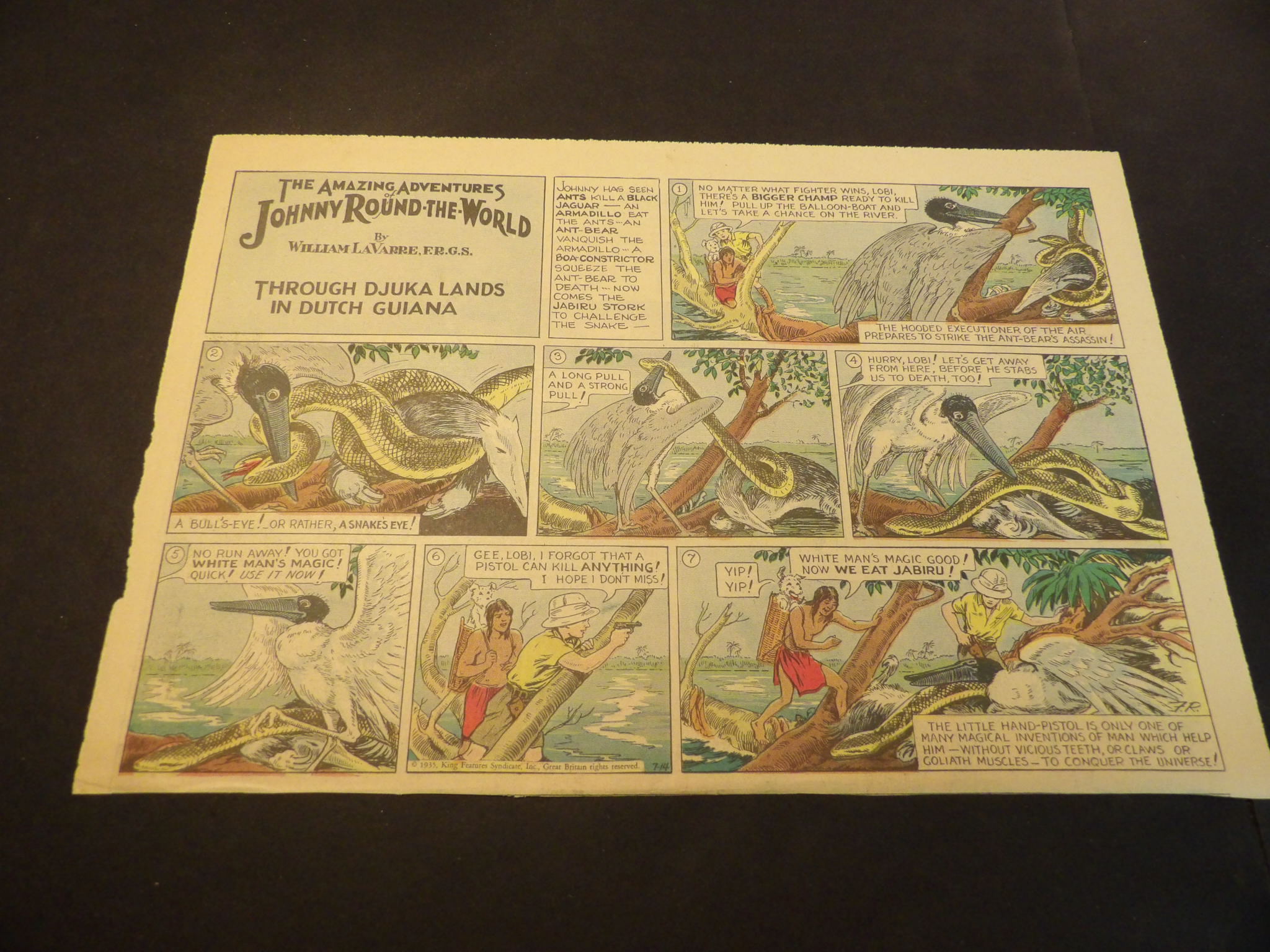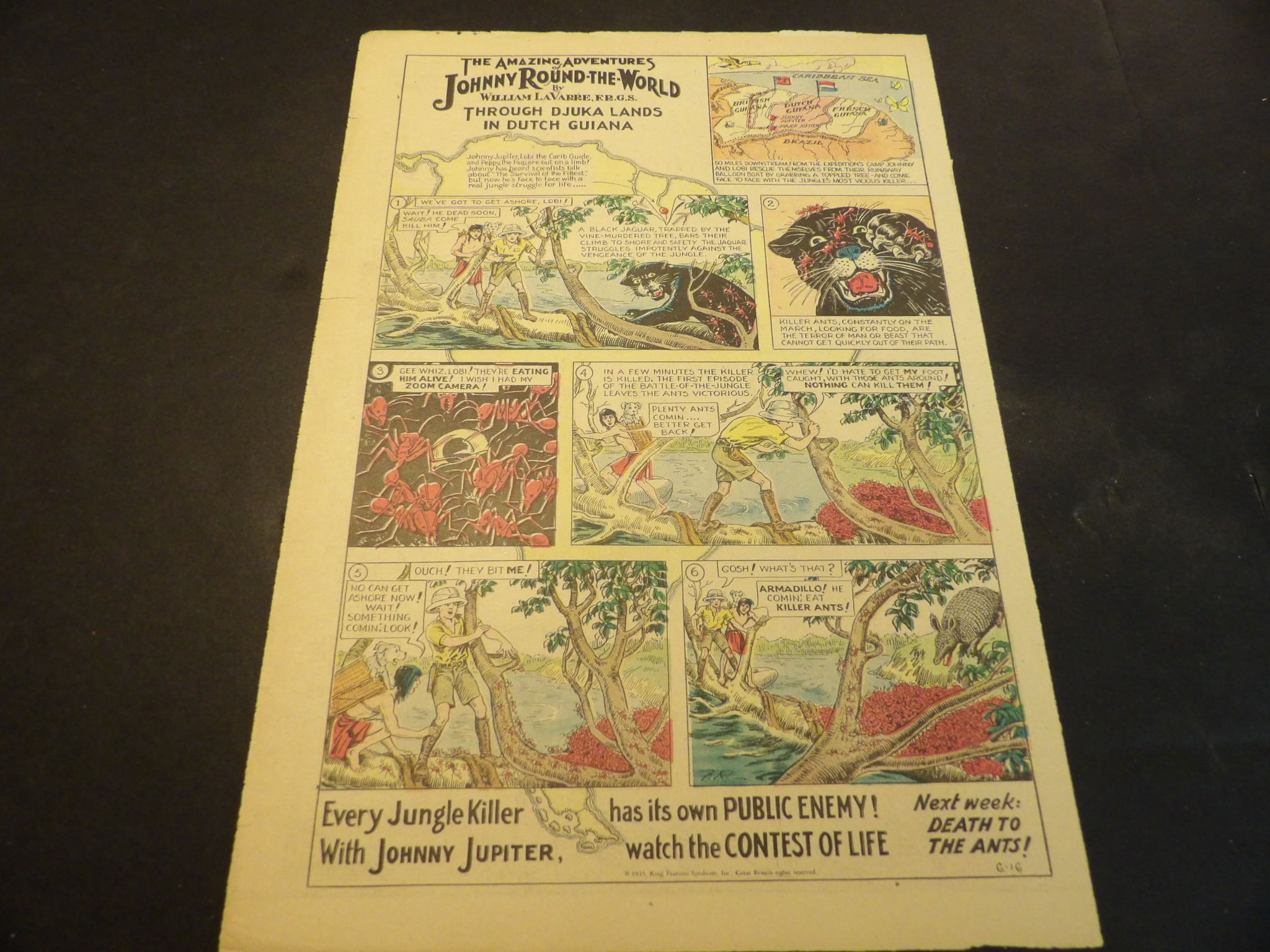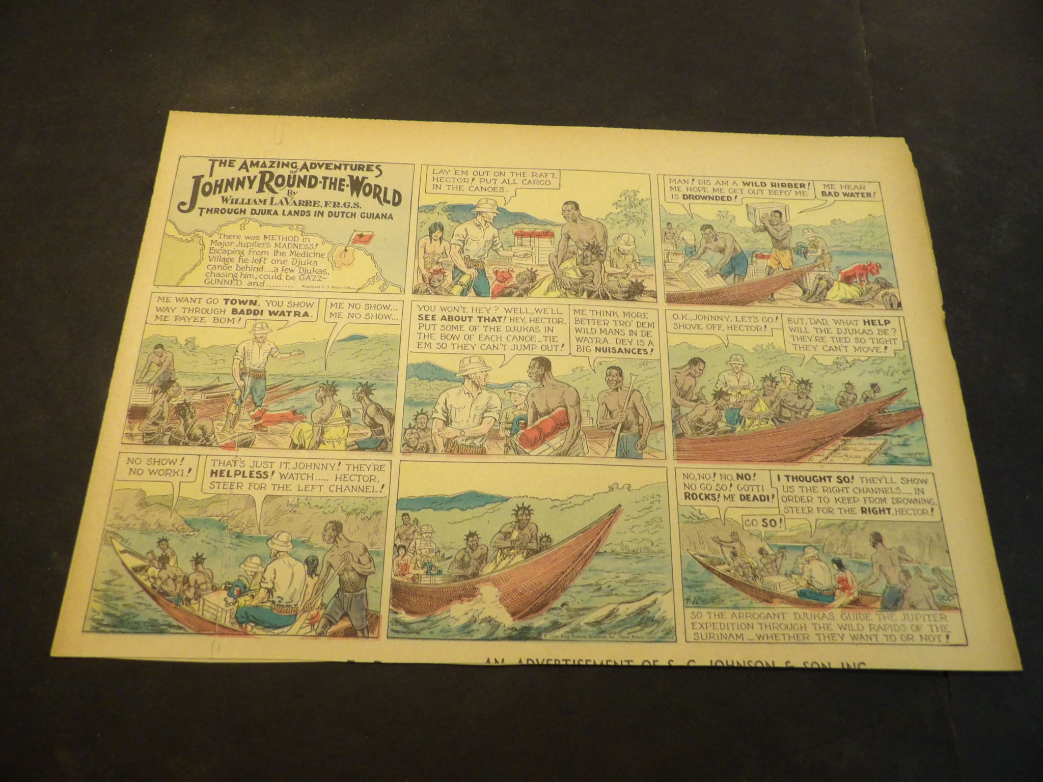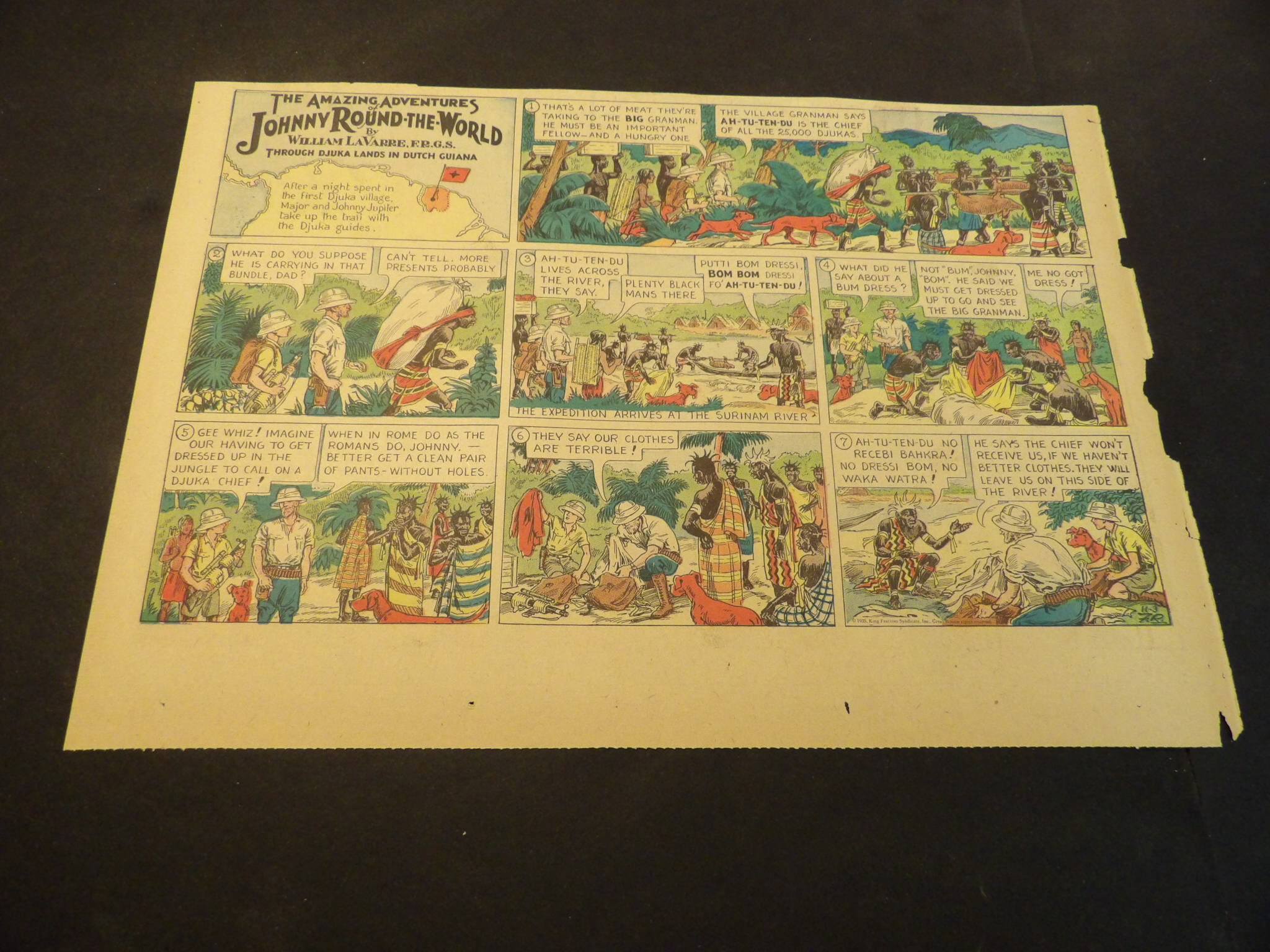 | Johnny Round-The-World by William LaVarre (0700-) First Appearance December 23, 1934 - Johnny Round-The-World was the sunday comic creation of William LaVarre, a popular world-traveling explorer of some note. The hero of the strip was Johnny Jupiter the young son of Major Jupiter, South American Explorer. Johnny went on his adventures equipped with a Zoom Camera which looks more like a Buck Rogers Zap Gun than a camera. As the action moved across jungle settlements, a picture of native life would get taken (by Johnny). There wasn't a lot of action in the stories, the strip acted more as a tour of the country and its natives. This snapshot within the strip was the novelty of the strip, but the classic 1930's artwork on the strip was also visually appealing. Coupled with the mystique of the LaVarre name, it makes for a strip that collectors find very appealing. The run of the strip was short (1935-37) so supply is pretty tight. Printed as mostly as Tabs or Halfs, both sell very well at a high premium. (120) | ||||