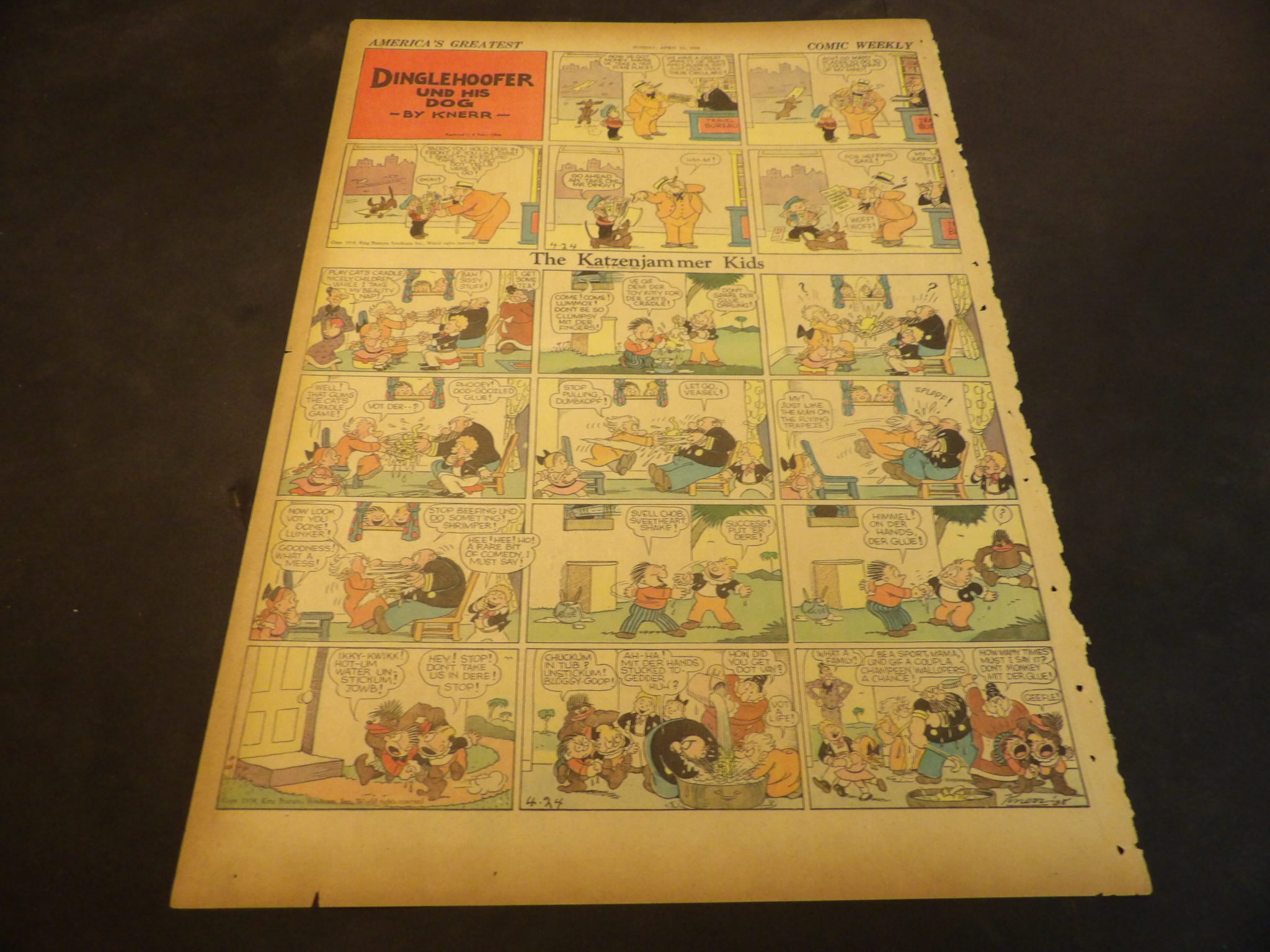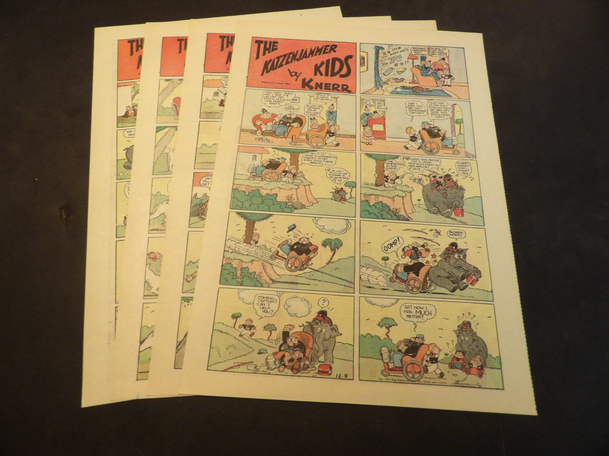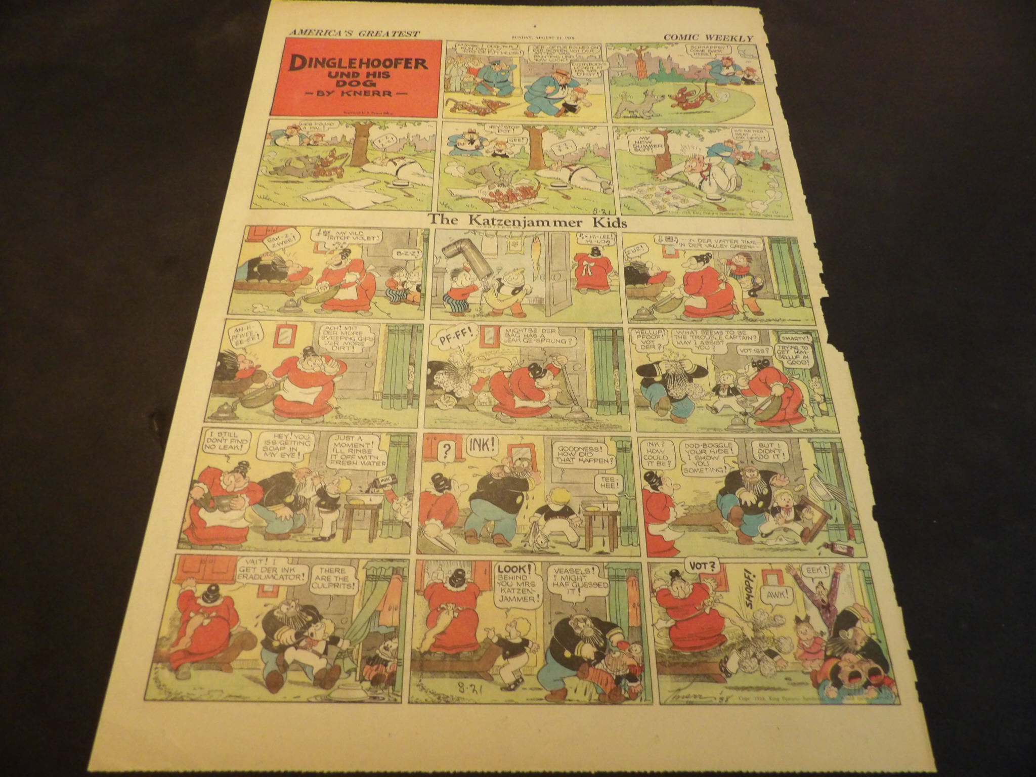 | A note about the Katzenjammer Kids & Captain & the Kids - In June 1914 Rudolph Dirks, creator of the Katzenjammer Kids, switched from the Hearst Syndicate to the World Feature Syndicate. In a court battle, Dirks was allowed to continue producing the kids, but the name 'Katzenjammer Kids' was awarded to Hearst. From the end of 1914 onward, 'the Kids' would be produced by two totally different artists working for different syndicates. Dirks would begin producing the strip under various titles, but eventually would settle on 'Captain and the Kids'. In November 1914 Hearst would hire Harold Knerr and continue the strip under the 'Katzenjammer Kids' title. To see post-1914-switch Dirks offerings, check out my listings for 'Captain and the Kids'. |