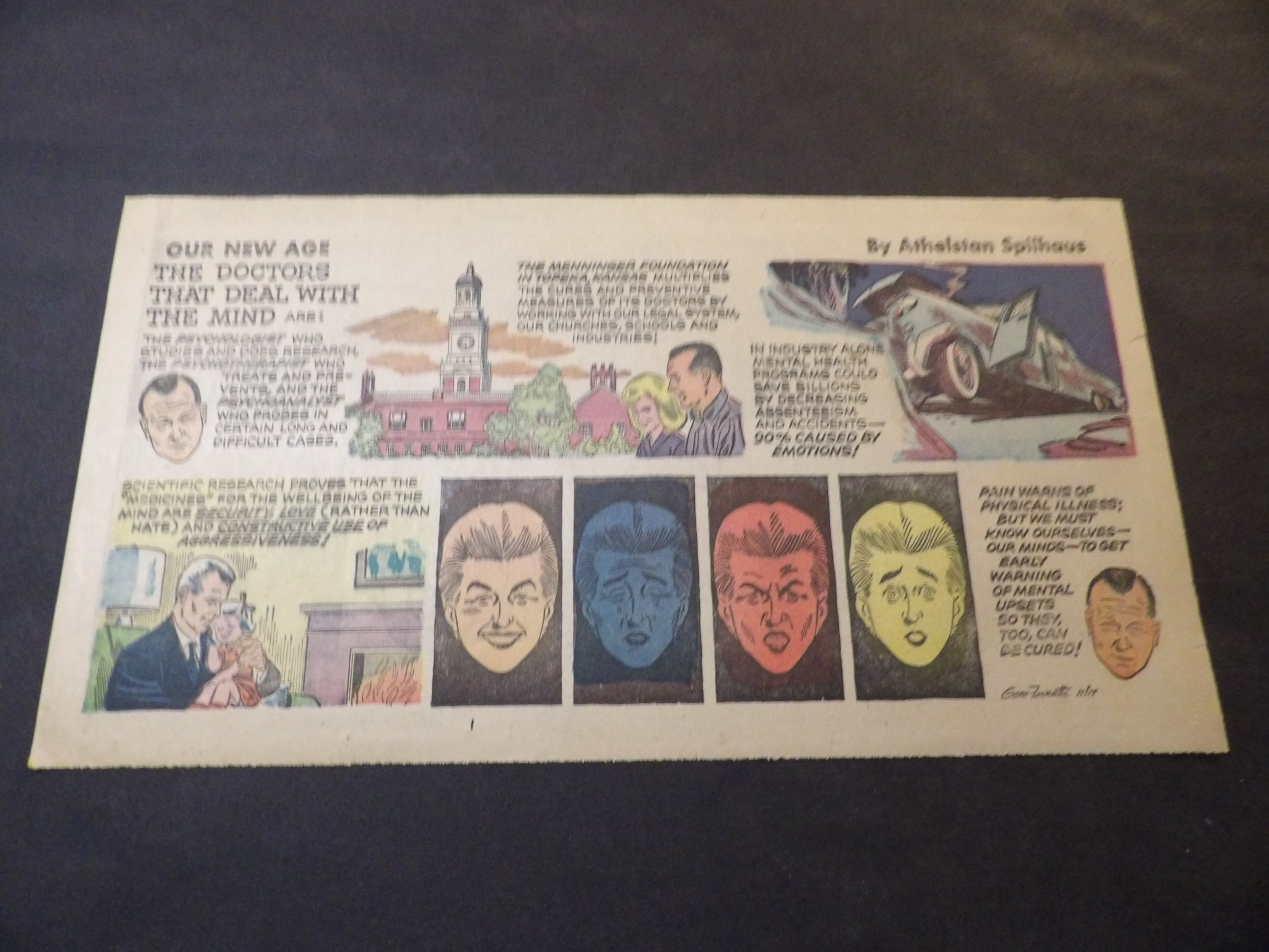 | Our New Age. by Athelstan Spilhaus (1065-) 1st Sunday 1958 - With the beginning of the Space Race in the late 1950s, Scientist and Meteorologist Athelstan Spilhaus began writing 'Our New Age'. Each week Spilhaus would present a scientific advancement and its implcations on modern life. The strip succeeded in two aspects (1) bringing Science to children and adults reading the comics and (2) enlighting the public that the Science in the United States was not trailing the USSR. The artwork on the strip was produced by different artists, however the theme of the panels stayed steady. Wide perspectives were meant to impress and excite the reader. The result was a visually pleasing strip which is quite collactable. The market for Our New Age is quite good. Printed as Tabs or smaller thirds, this title is difficult to keep in stock. (189) | ||||