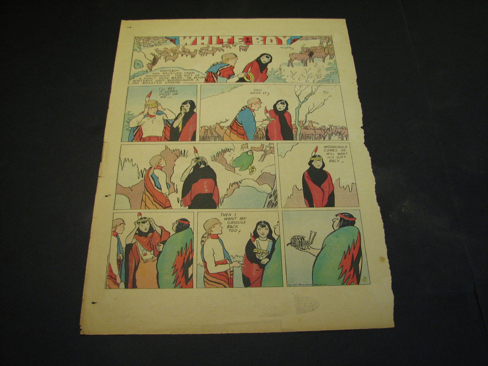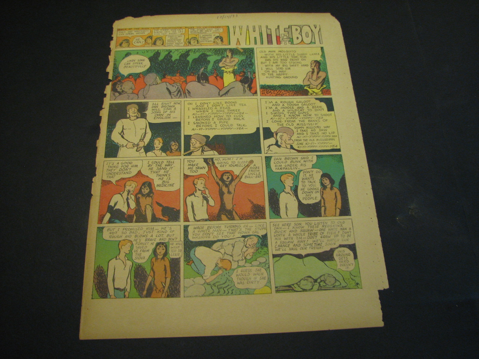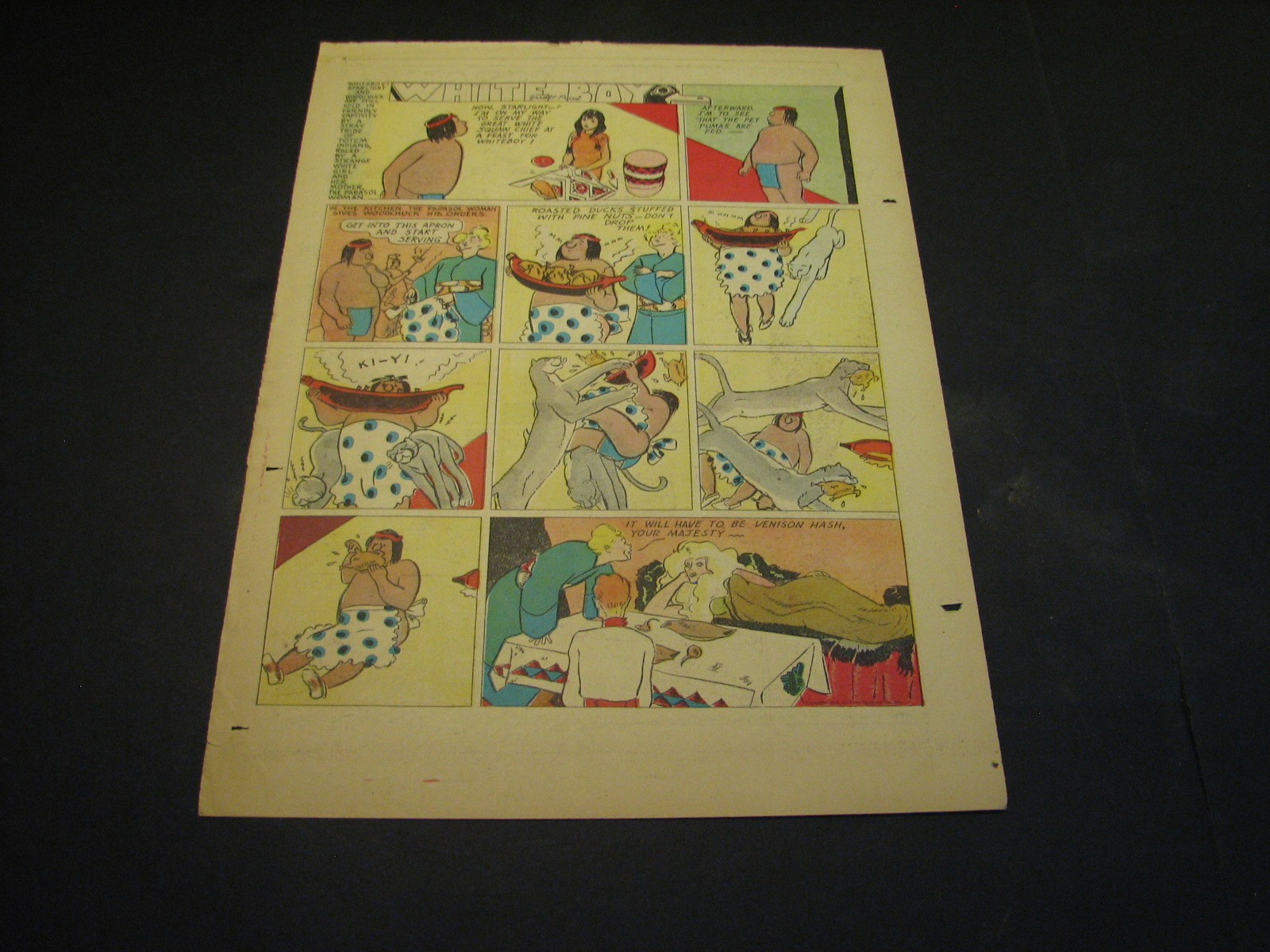 | White Boy(Skull Valley) by Garrett Price (1560-) - 1st Sunday Comic Appearance October 1, 1933 - White Boy was a marvelous comic strip created by Garrett Price, an artist with an authentic western background. White Boy was the main character of the strip in it's early days when the strips was all about living life with an Indian Tribe. Light humor and mile storylines were the tone of the strip. The attraction was the distinctive artwork of Price. Exaggerated characters and authentic western backdrops gave the strip wonderful appeal. Beginning in 1935 the strip would take a wide turn away from Native American life to a western ranch based gag strip. Although the quality of the strip remained strong, Garrett Price would lose interest and move on to other artistic challenges. The market for White Boy is very good. Printed as either Tabs or Halfs, Collectors pay a reasonably high premium for these pages. They are very hard to keep in stock. (252) | ||||