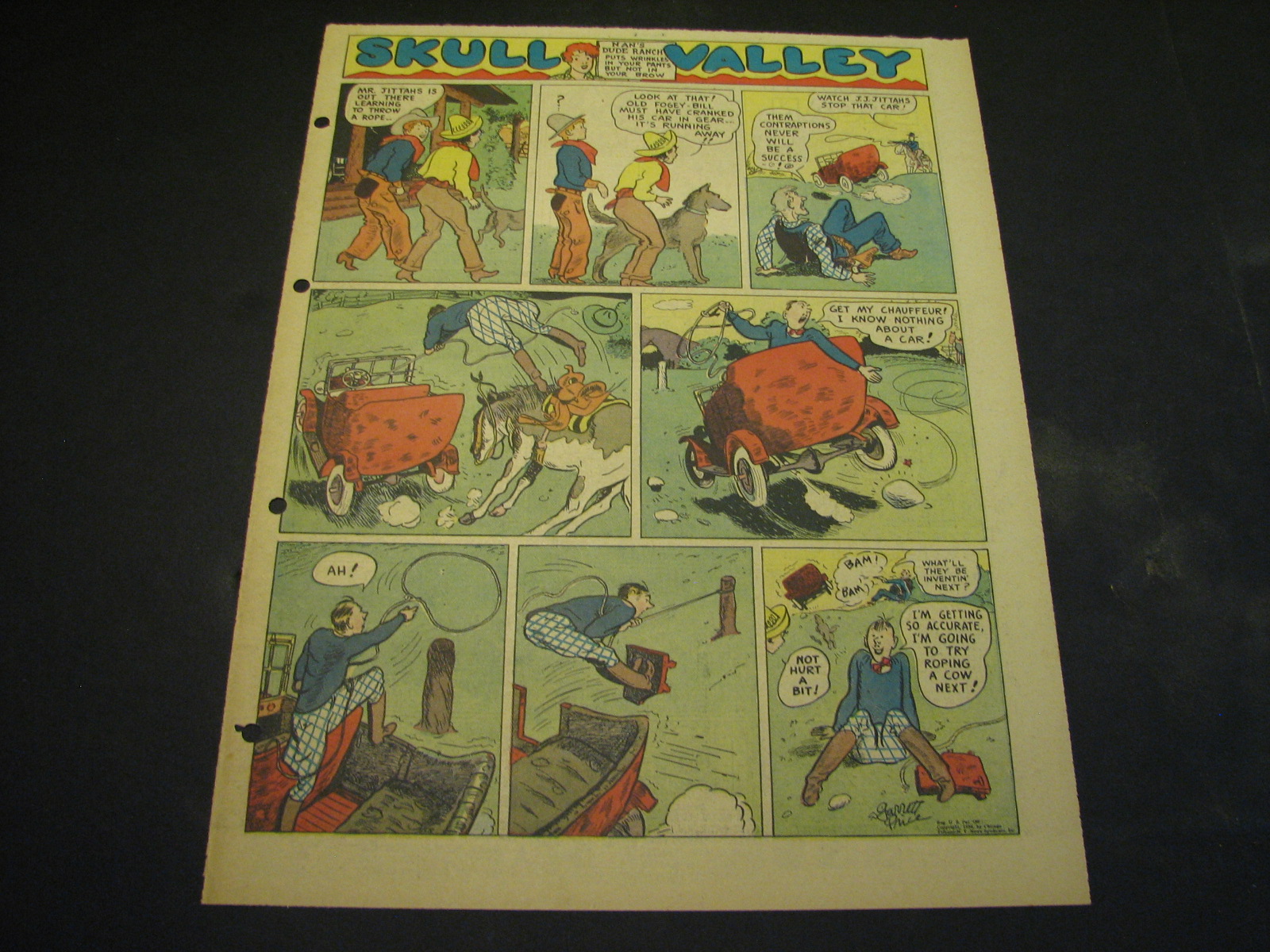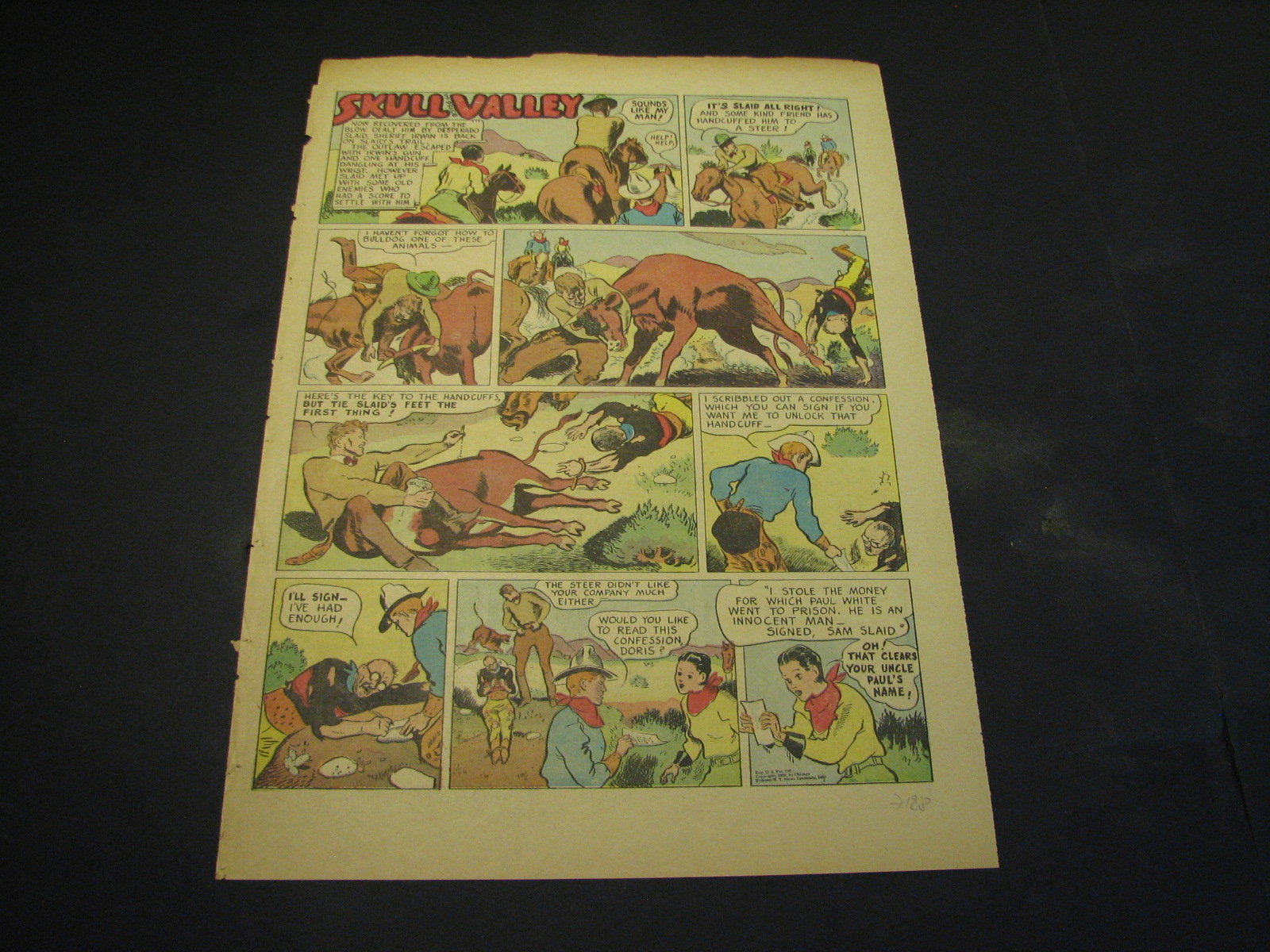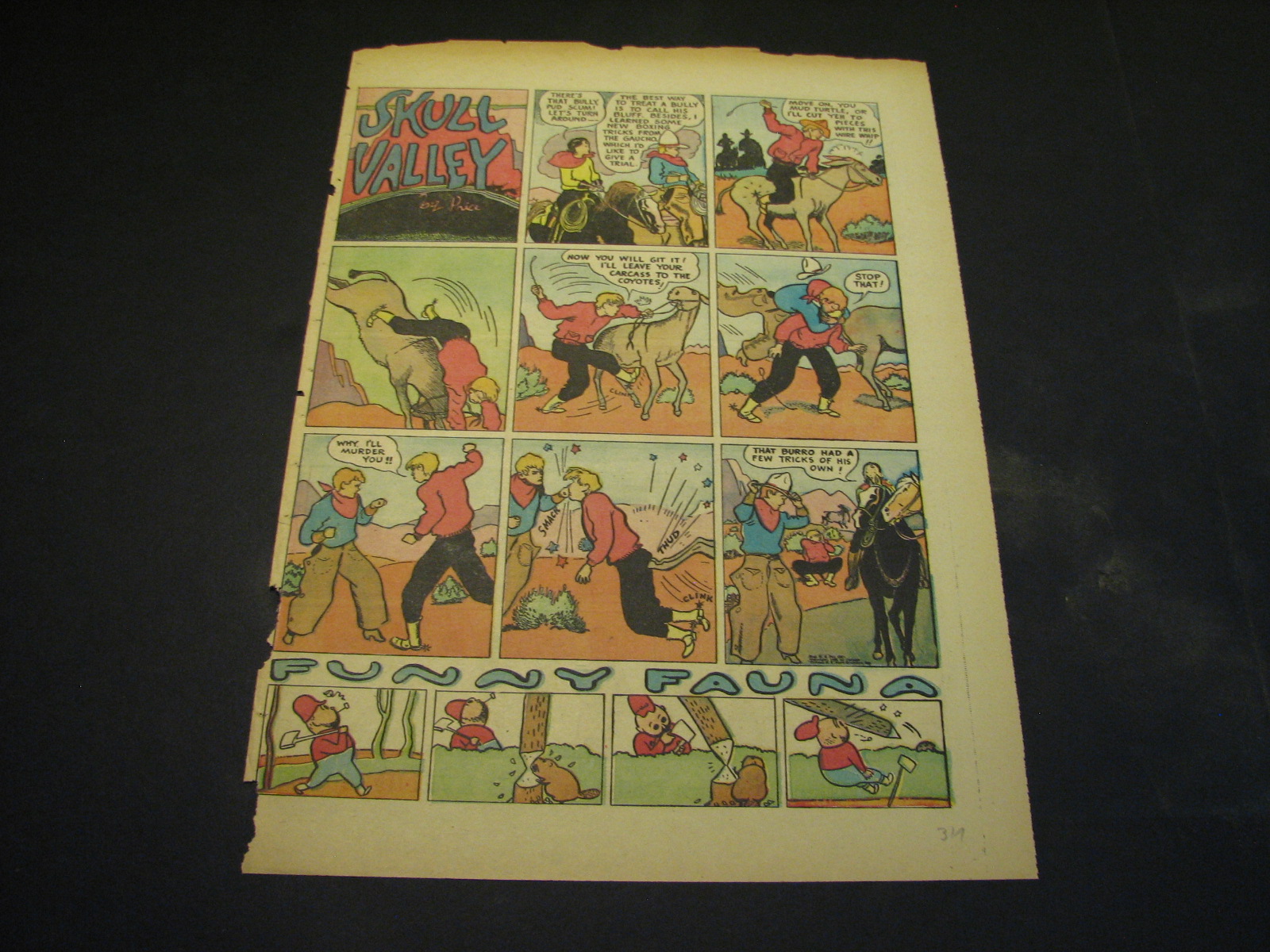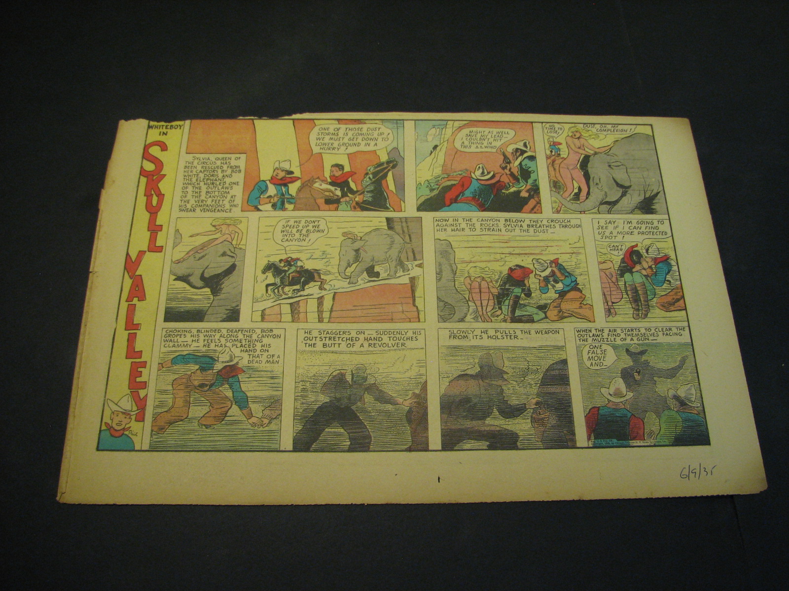 | White Boy(Skull Valley) by Garrett Price (1560-) - 1st Sunday Comic Appearance October 1, 1933 - White Boy was a marvelous comic strip created by Garrett Price, an artist with an authentic western background. White Boy was the main character of the strip in it's early days when the strips was all about living life with an Indian Tribe. Light humor and mile storylines were the tone of the strip. The attraction was the distinctive artwork of Price. Exaggerated characters and authentic western backdrops gave the strip wonderful appeal. Beginning in 1935 the strip would take a wide turn away from Native American life to a western ranch based gag strip. Although the quality of the strip remained strong, Garrett Price would lose interest and move on to other artistic challenges. The market for White Boy is very good. Printed as either Tabs or Halfs, Collectors pay a reasonably high premium for these pages. They are very hard to keep in stock. (252) | ||||