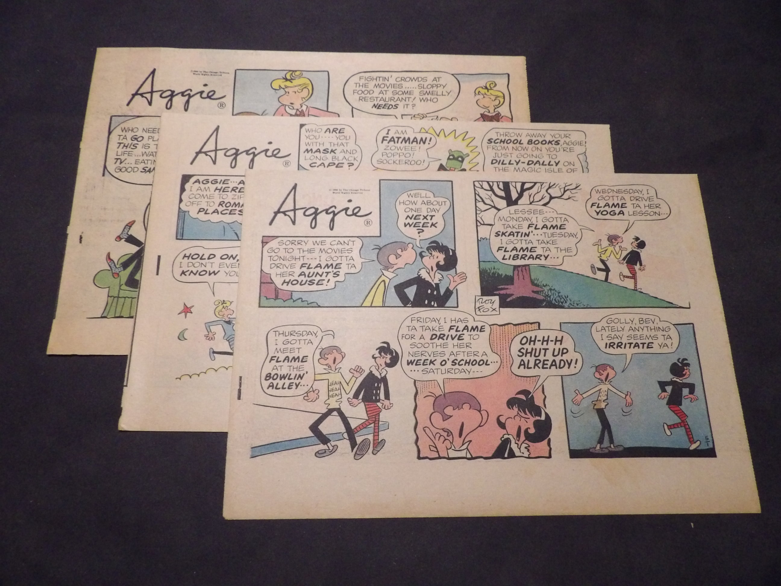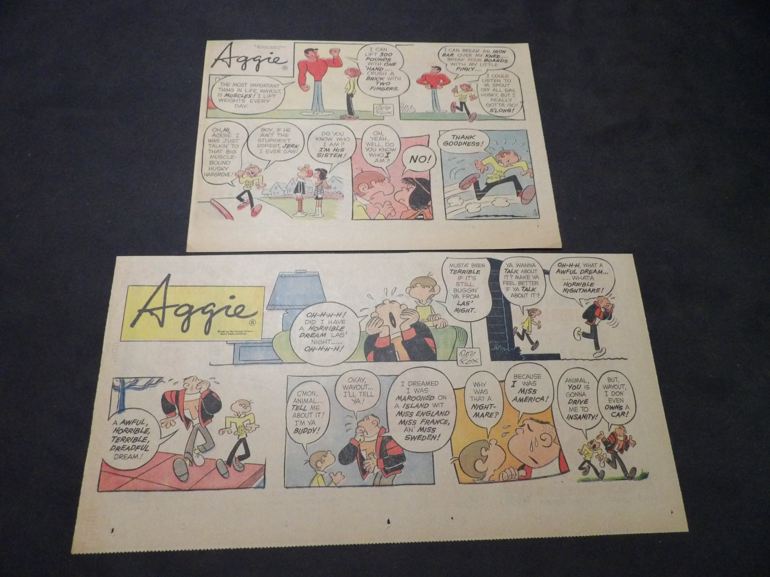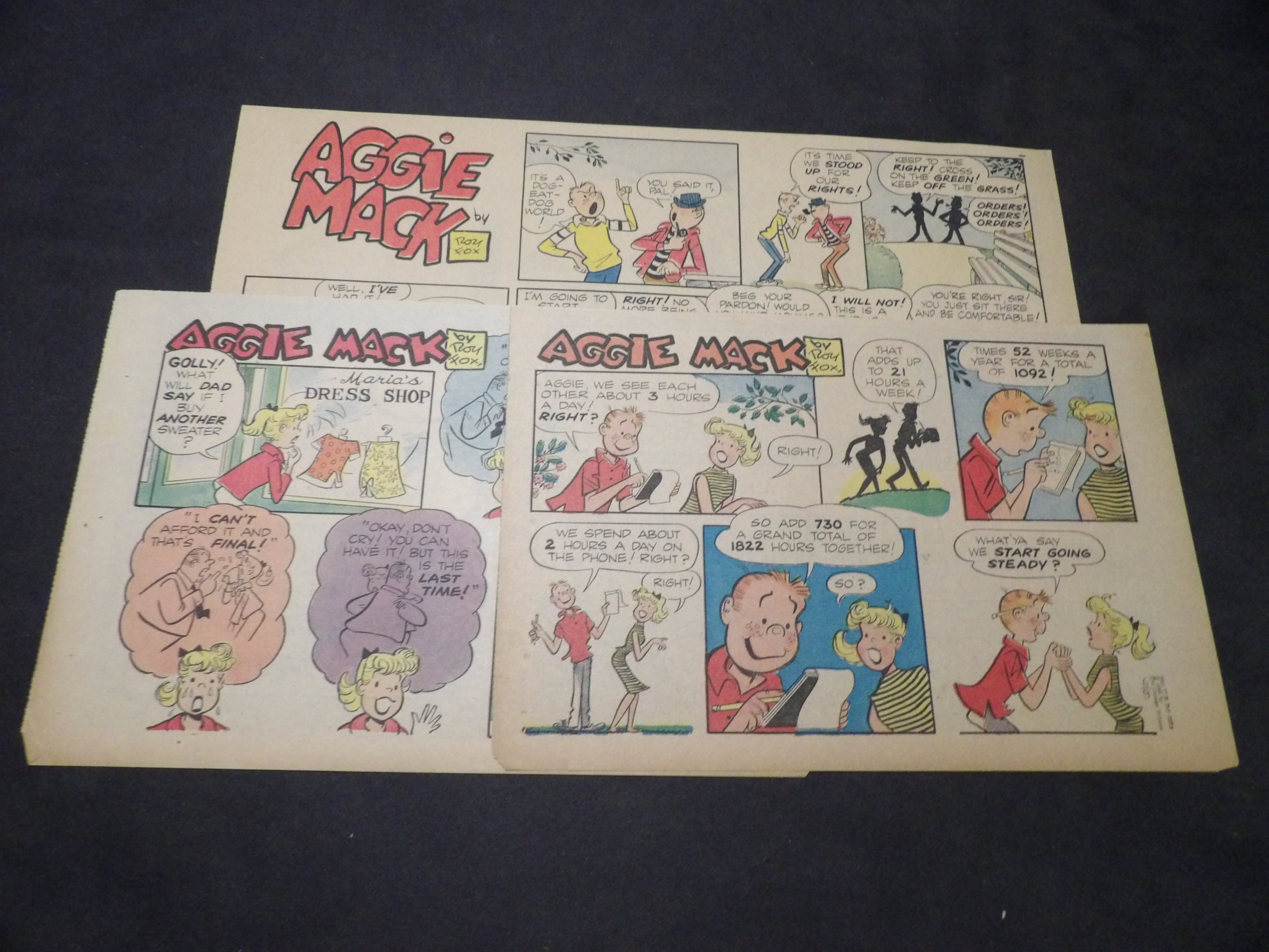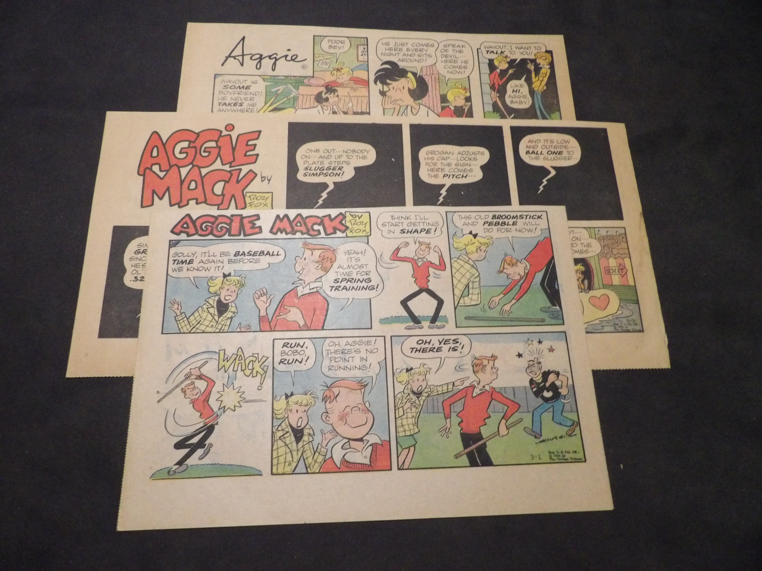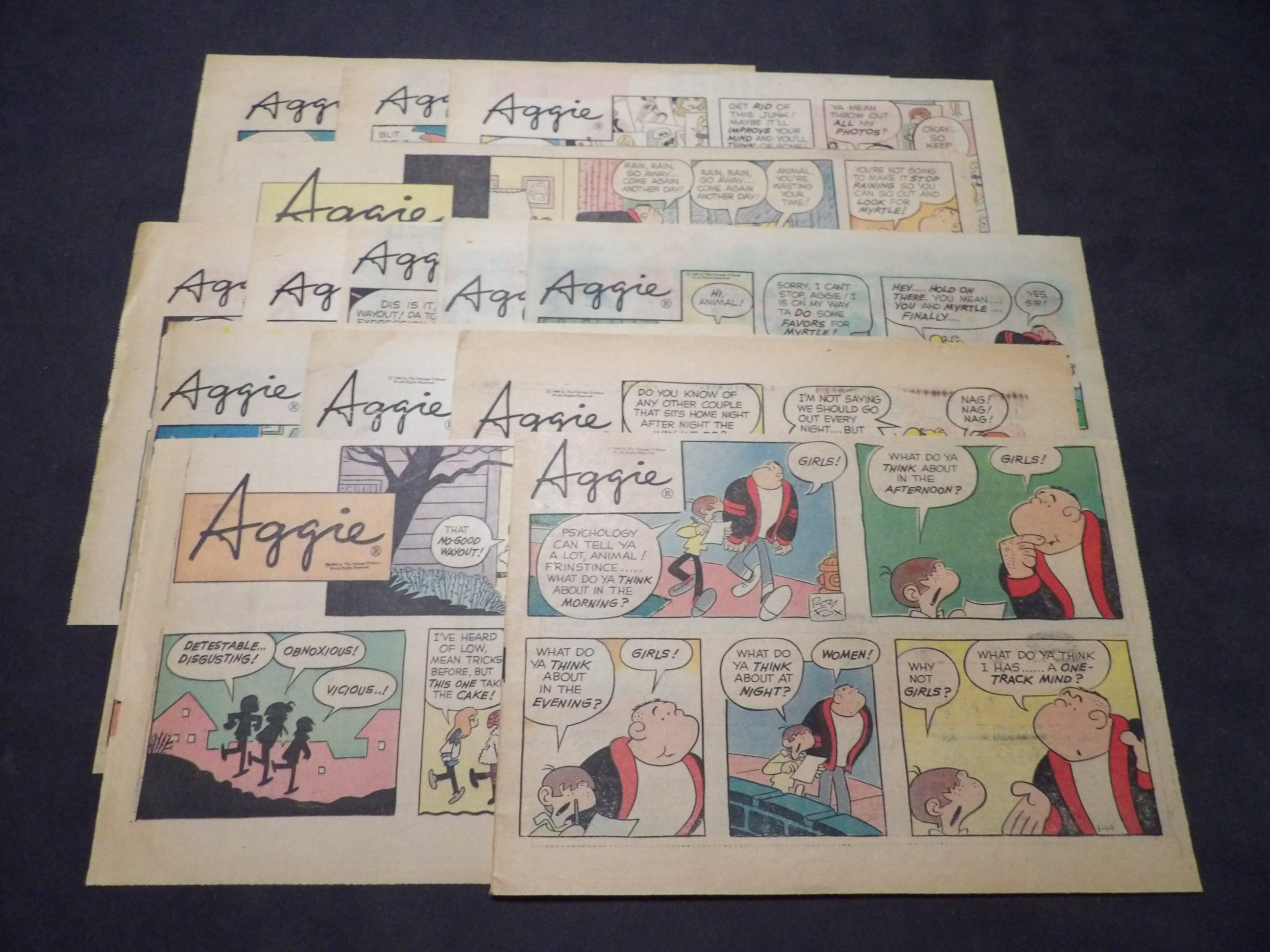 | 0901-0017 | Aggie Mack | 1949 - 9TH, 1HT | G-VG/G/VG | $5.00 | by Hal Rasmusson, On reverse Harold Teen(1TH, 1HT), Ferd'nand(1TH) (2/20, 2/27, 3/27, 7/17, 8/7, 8/21, 8/28, 9/11, 11/13, 11/20) |