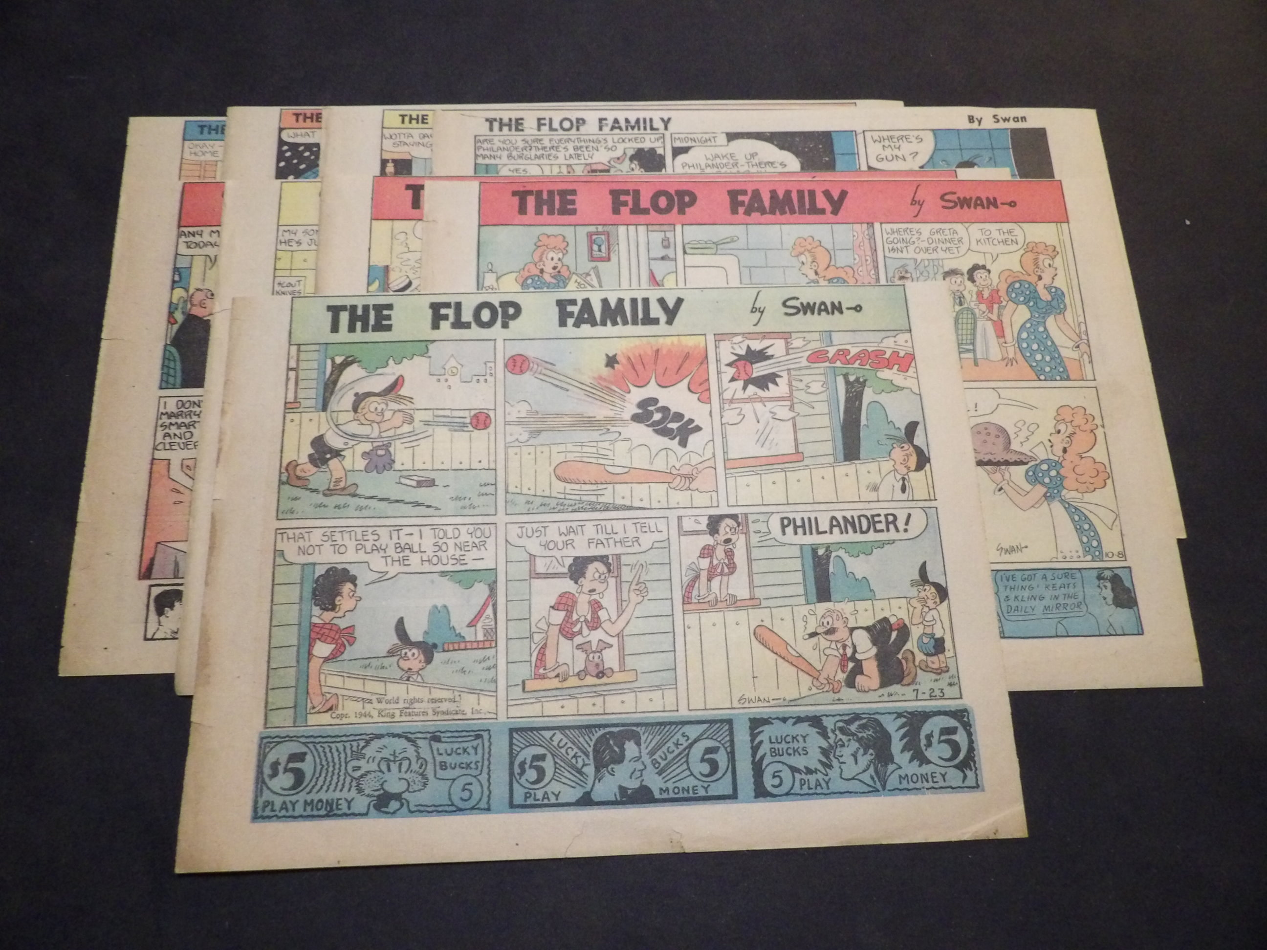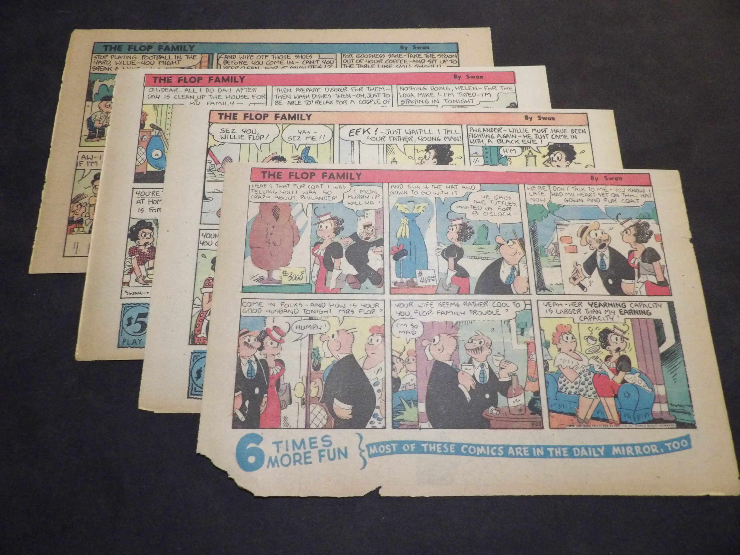 | 0905-0147 | Flop Family | 1947 - 8HT | G-VG/G-VG/VG | $8.00 | by George Swanson, On reverse Captain Easy(2HT), Bobby Sox(5HT), Our Boarding House(1HT) (3/16-4/20, 5/4, 5/11) |