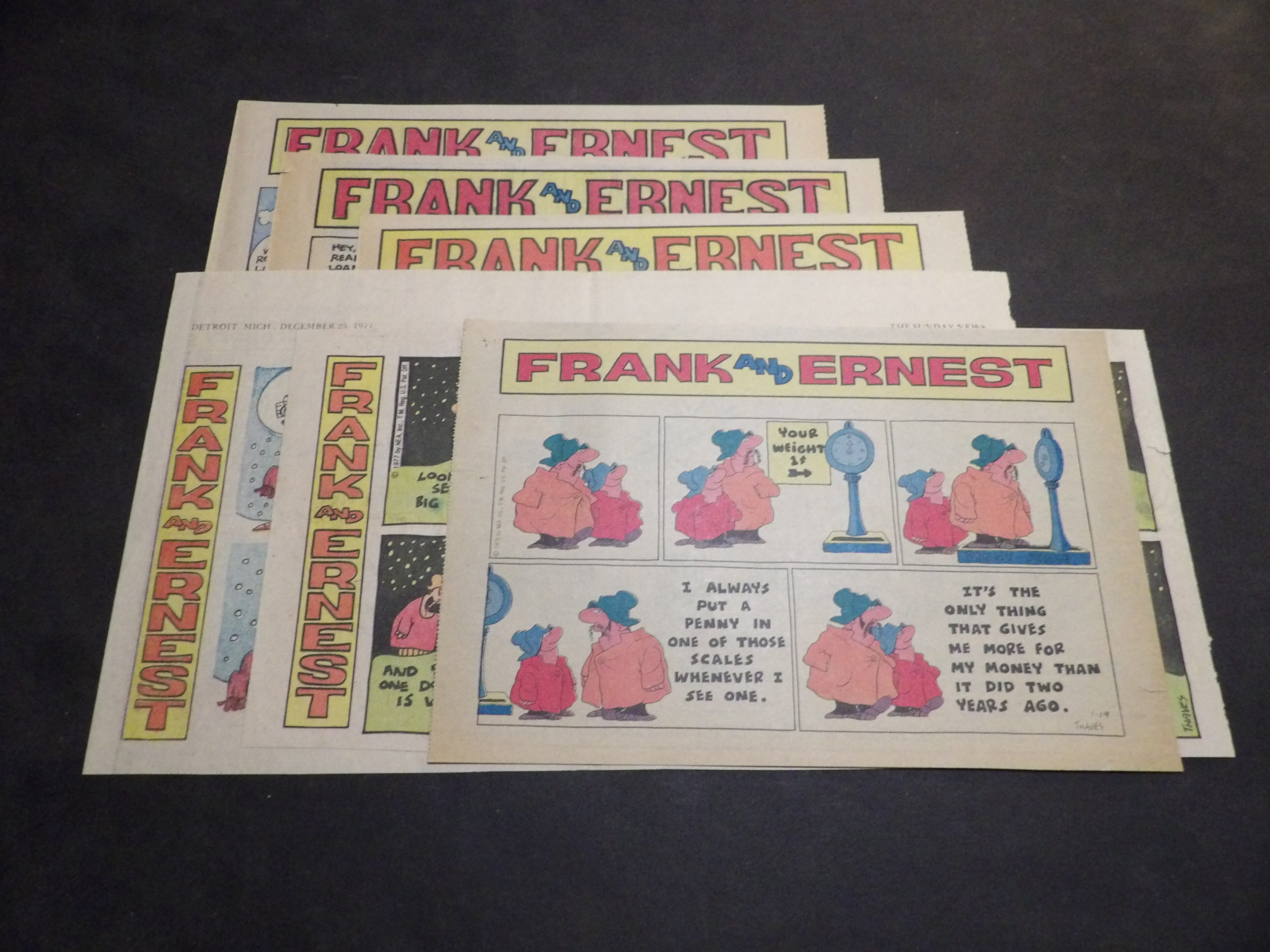 | 0905-0156 | Frank and Ernest | 1977 - 2TH, 4HT | G/G/G-VG | $1.00 | by Bob Thaves, On reverse BC(1SX), Lockhorns(1SX), Wizard of ID(1SX) (1975:1/19, 1977:6/26, 12/25 1979:7/23 1981:9/19, 10/11) |