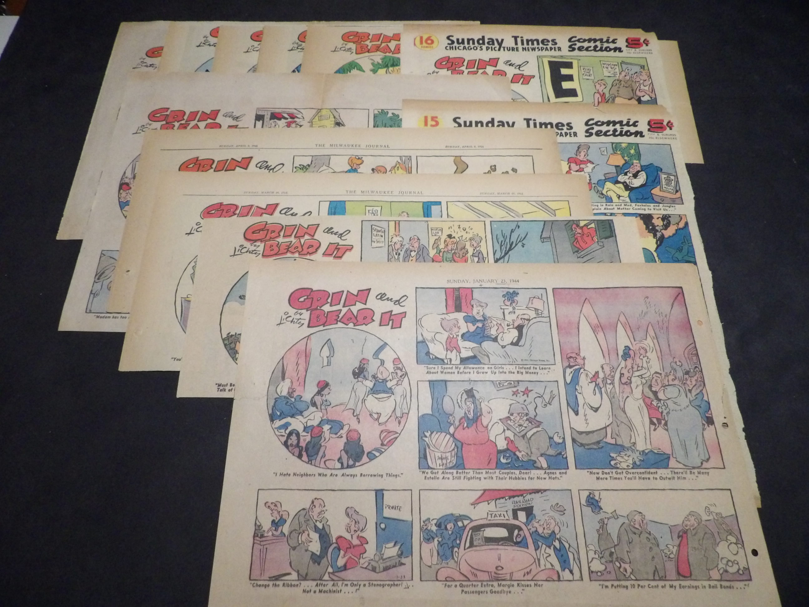 | 0906-0061 | Grin & Bear It | 1950-54 - 9H, 27TH, 5Q | G/G/G-VG | $15.00 | by George Lichtenstein, On reverse Mary Worth(1TH), Blondie(1TH), It's Philadelphia(1TH), Eveready battery ad(1TH), Bo(1TH), Friskies Dog Food ad(1TH), Grandma(1TH), Little Iodine(1Q), Oxydol detergent ad(1TH), Smith Family(1TH), Life's Like That(1TH) (1950:1/8, 1/22, 4/23, 5/21, 7/16, 7/23, 9/3, 11/19, 12/31, 1951:1/14, 2/4, 2/25, 5/13, 6/10, 9/30, 10/14-11/4, 12/30, 1952:1/6, 1/13, 6/8-6/22, 8/10, 10/19, 12/29, 1953:1/25, 3/29, 4/5, 1954:4/4, 6/13, 8/1, 8/22, 9/5, 10/24, 12/19) |