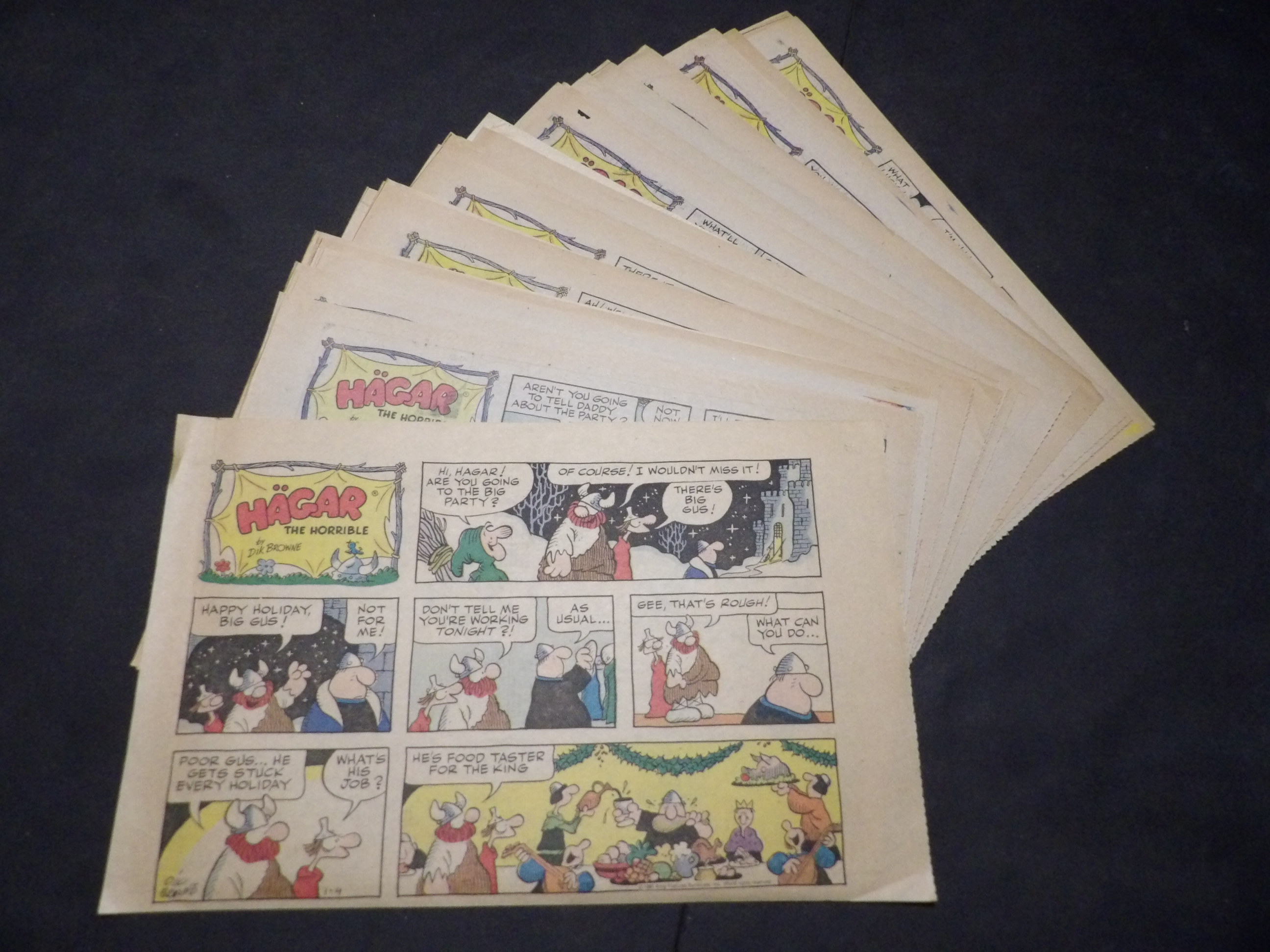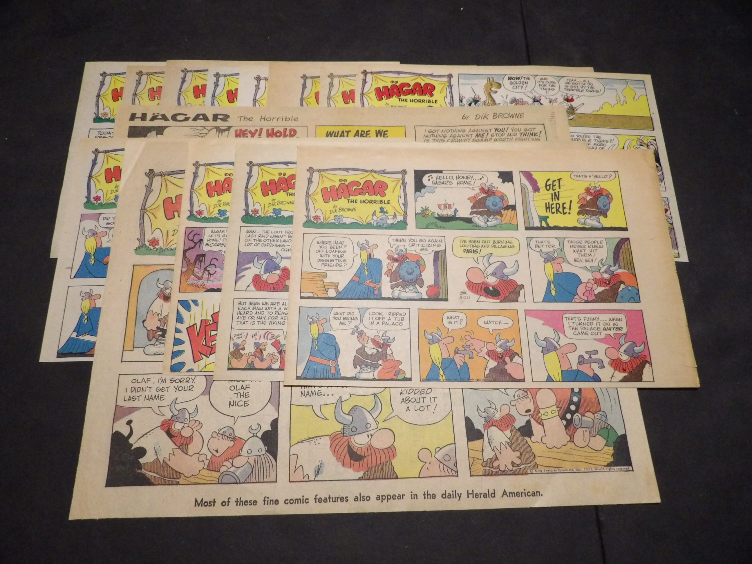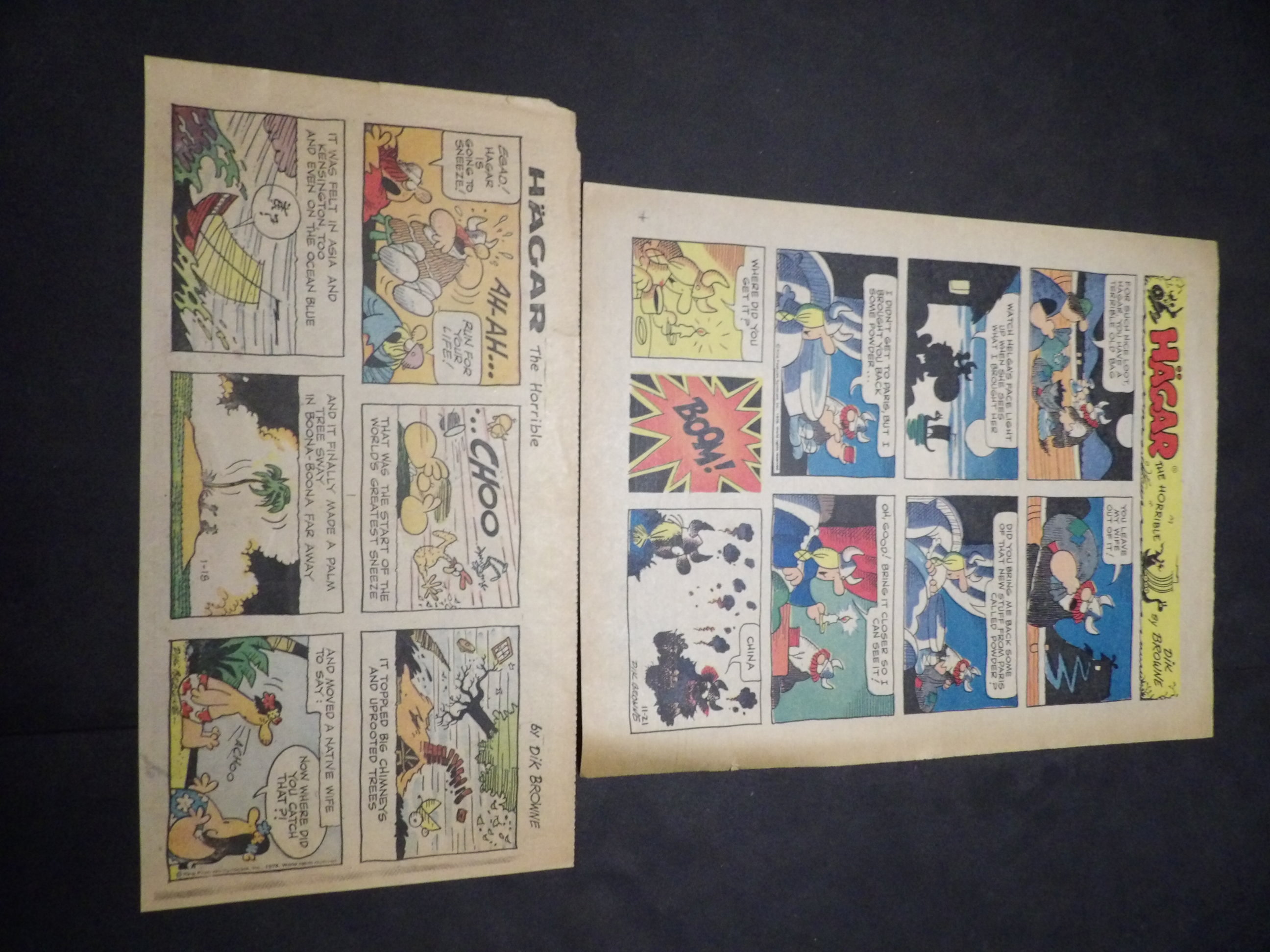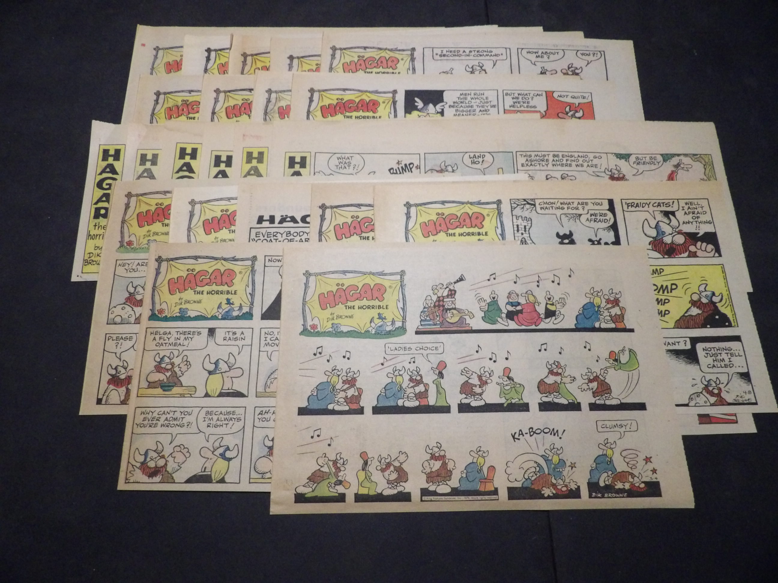 | 0906-0119 | Hagar the Horrible | 1973 - 1H, 1TH, 12HT | G-VG/G-VG/GVG | $15.00 | 1st Year, by Dik Browne, On reverse Friday Foster(3HT), Louie(1HT), Moon Mullins(1HT) (5/20-6/3, 6/17, 6/24, 8/5, 9/2, 9/16, 10/28, 11/11, 12/9-12/30) |