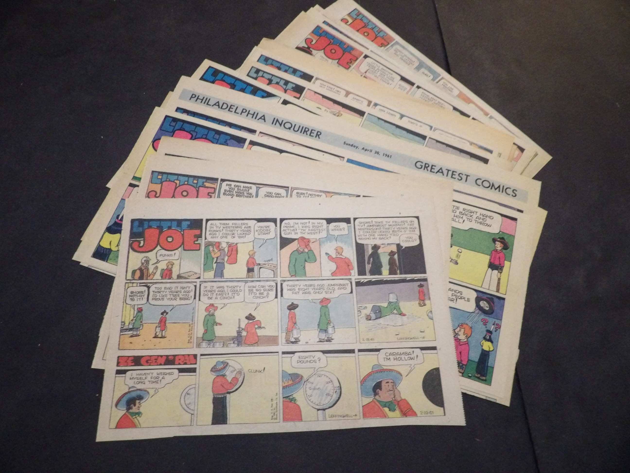 | 0910-0143 | Little Joe | 1947 - 3H, 12TH | G/G/VG | $5.50 | by Ed Leffingwell, 3H w/Ze Gen'Ral On reverse Sweeney & Son(3TH), The Gumps(4TH), Harold Teen(1TH), Smitty(1TH) (2/16, 3/9, 4/6-4/27, 5/11, 6/1, 8/3, 8/24, 9/7-9/21, 11/16, 12/28) |