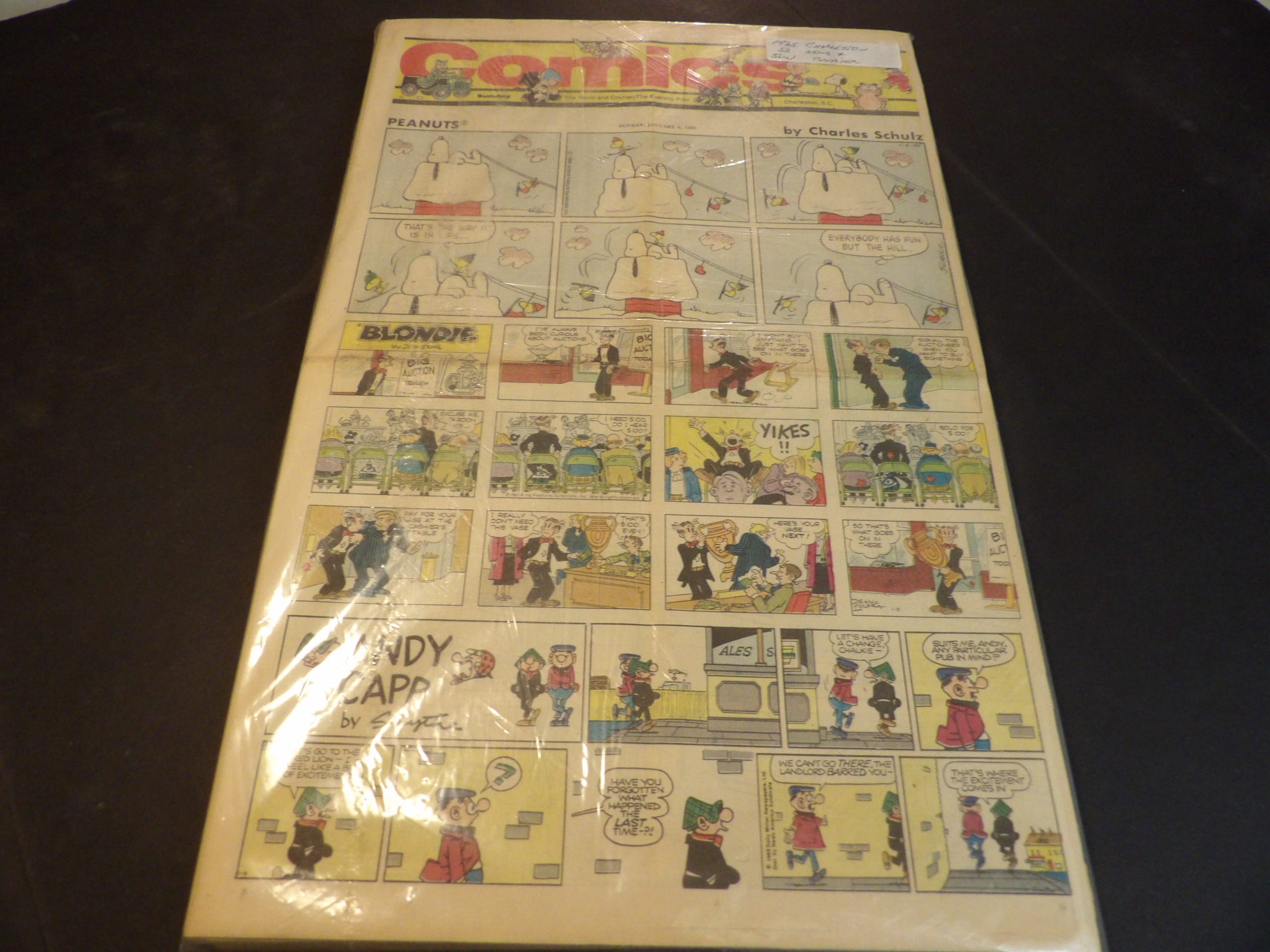 | W020-0001 | 1984 - 14 Full-color Sections (Only 3/11, 4/8-5/6, 11/4-12/23) | 4-Fulls each | $14.00 | Peanuts(TH), Blondie(TH), Andy Capp(TH), HI & Lois(TH), Lockhorns(TH), Garfield(TH), Shoe(TH), Dennis the Menace(TH), Family Circus(TH), BC(Q), Nancy(Q), Mary Worth(Q), Wizard of ID(TH), The Better Half(TH), Mark Trail(TH), Cathy(TH), Snuffy Smith(TH), Redeye(TH), Henry(TH), Dondi(H), Prince Valiant(H), Beetle Bailey(H), Hagar the Horrible(H) |