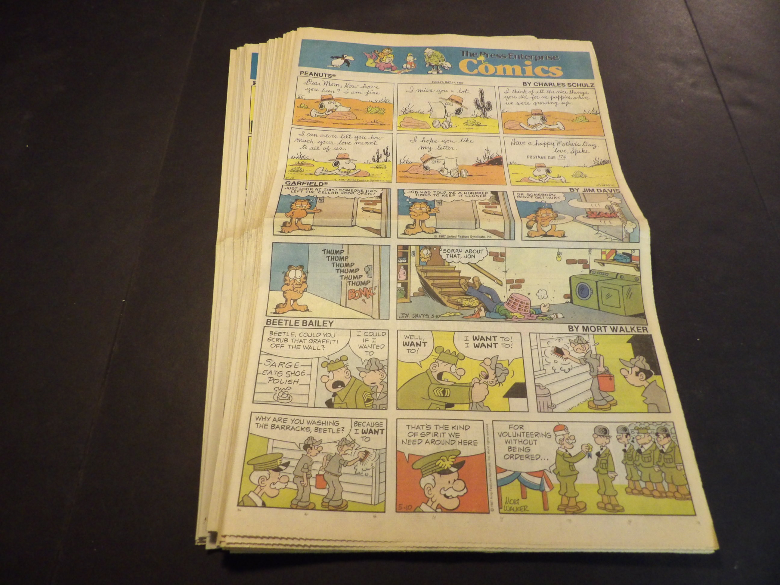 | W105-0005 | 1987 - 30 Full-color Sections (5/10-7/12, 8/2, 8/23-12/27) | 3-Fulls each | $90.00 | Peanuts(TH), Garfield(TH), Beetle Bailey(TH). Dennis the Menace(Q), Calvin & Hobbes(Q), Ferdnand(Q), For Better or Worse(Q), Doonesbury(Q), Family Circus(Q), Shoe(Q), Cathy(Q), Andy Capp(Q), Ziggy(Q), Hagar the Horrible(Q), B.C.(Q), Gasoline Alley(TH), Broom Hilda(TH) |