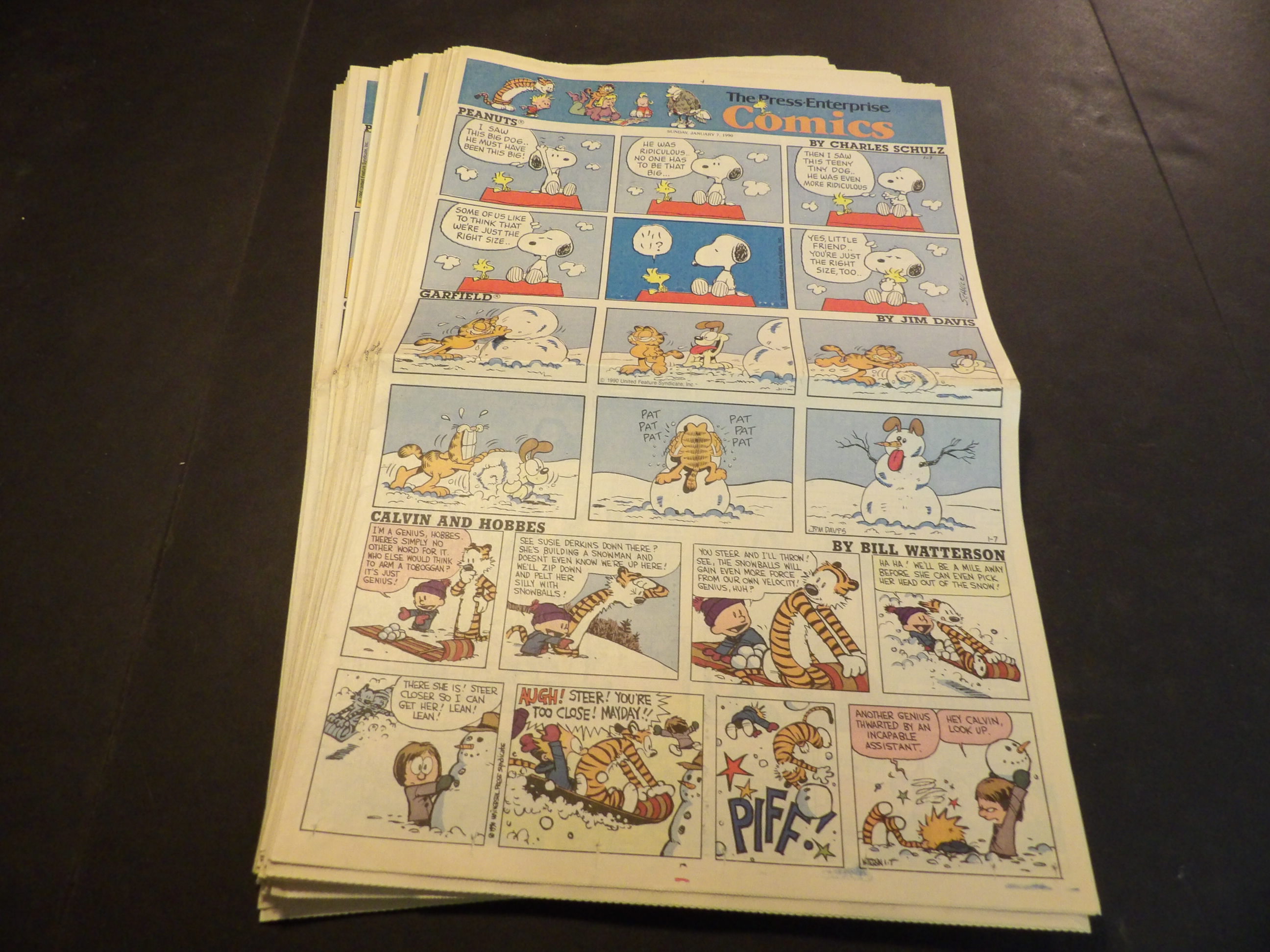 | W105-0010 | 1992 - 16 Full-color Sections (1/5-2/23, 3/15, 6/7-6/28, 8/16, 8/30, 10/4) | 3-Fulls each | $48.00 | Peanuts(TH), Garfield(TH), Calvin and Hobbes(TH), Dennis the Menace(Q), Beetle Bailey(Q), Cathy(Q), For Better or Worse(Q), Doonesbury(TH), Family Circus(TH), Shoe(TH), Andy Capp(Q), Ziggy(Q), Hagar the Horrible(Q), B.C.(Q), Mr. Boffo(Q), Wizard of ID(Q), Blondie(Q), The Far Side(Q), Gasoline Alley(Q), Broom Hilda(Q), Amazing Spider-Man(Q), Outland(Q) |