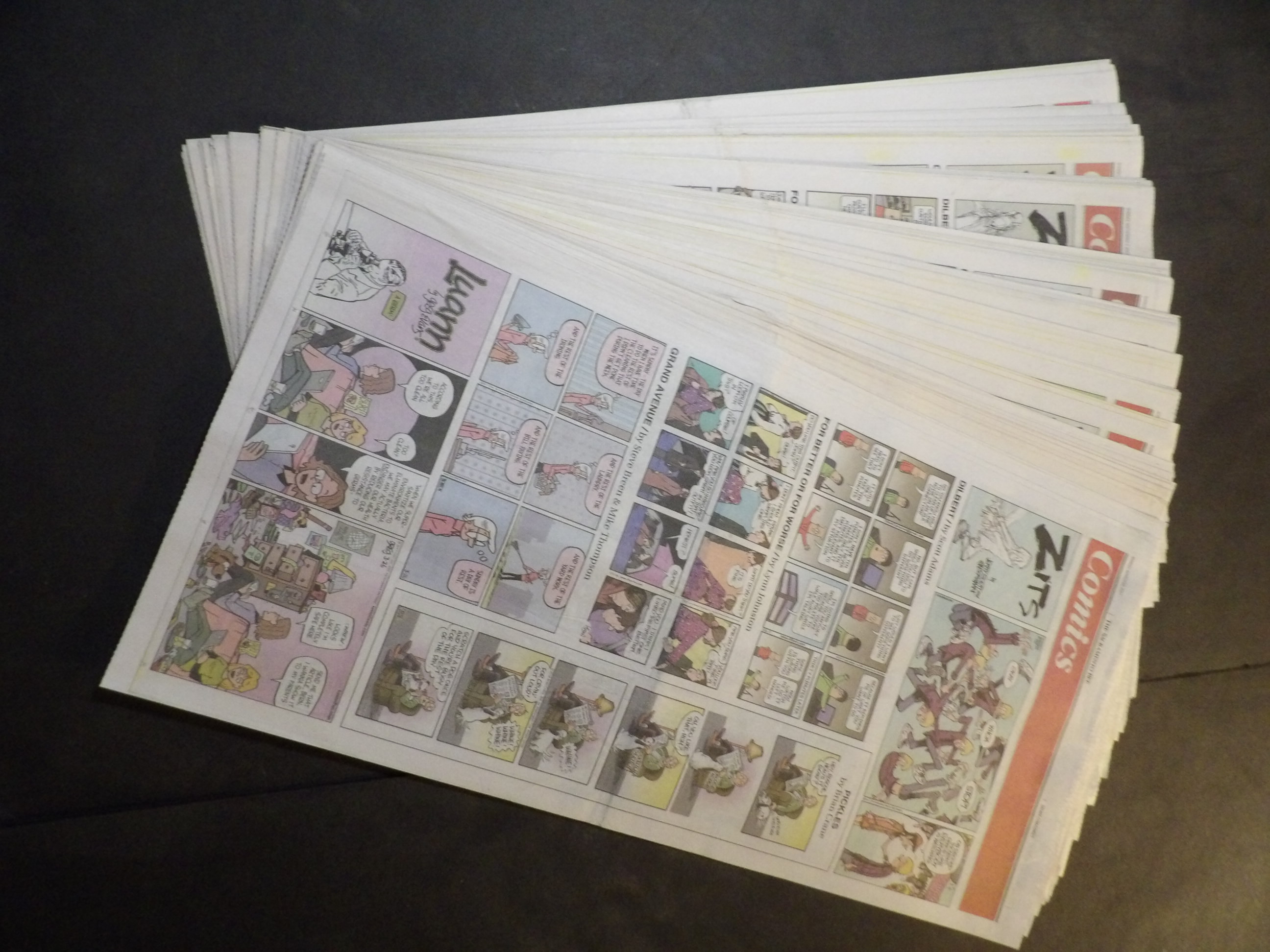 | W107-0001 | 2014 - 20 Full-color Sections | 2 Fulls each (2-sided 4 pages) | $20.00 | Zits(6th), Dilbert(6th), For Better or Worse(6th),Grand Avenue(6th), Luann(6th), Pickles(6th), Wee Pals(Q), Dennis the Menace(6th), Beakman Jax(Q), Ask Shagg(6th), Baby Blues(6th), Frazz(6th), Skylock Fox(Q), Pearls Before Swine(6th), Drabble(6th), Sally Forth(6th), Foxtrot(6th), Jumpstart(6th), Doonesbury(Q), Non Sequitur(6th), Get Fuzzy(6th), Sherman's Lagoon(6th), Beetle Bailey(6th), Mutts(6th) |