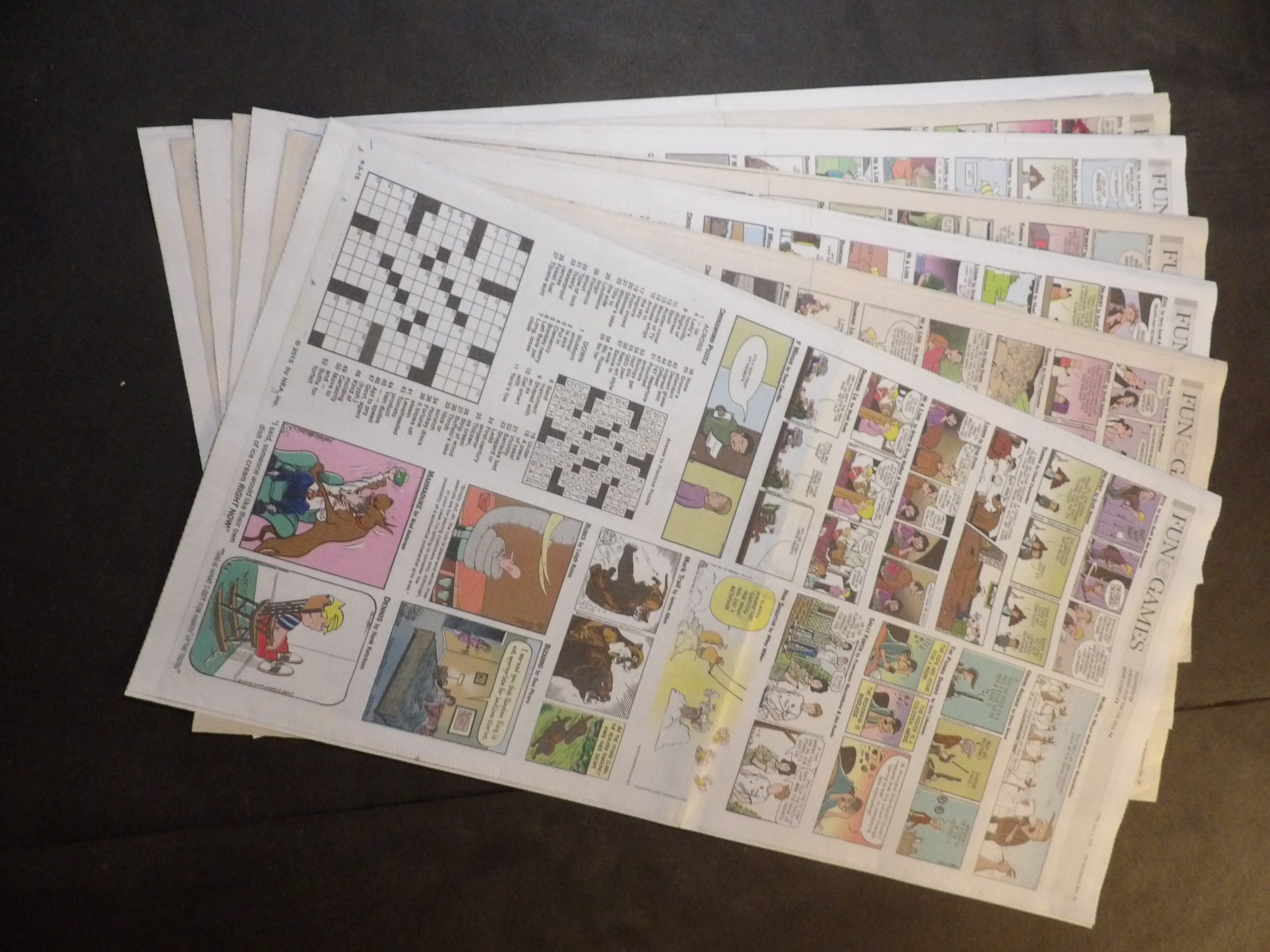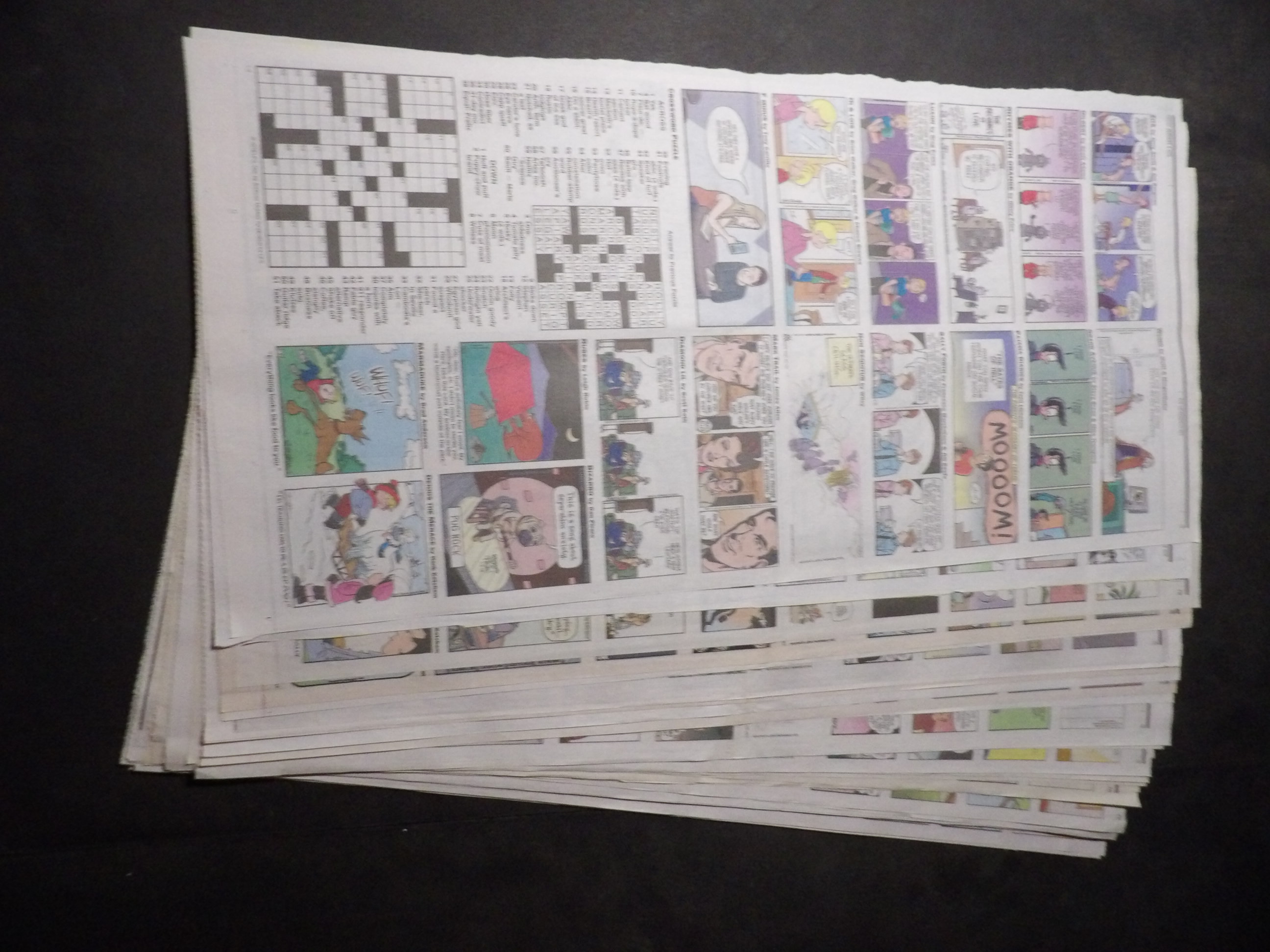 | W530-0002 | 2015 - 7 Full Color Daily sections | 2-Fulls each (1-sided, 2 Pages) | $1.50 | Zits, Dilbert, Tundra, Luann, Hi and Lois, Diamond Lil, F Minus, WuMo, Grand Avenue, Pajama Diaries, Sally Forth, Non Sequitur, Mark Trail, Rubes, Marmaduke, Bizarro, Dennis the Menace, Pickles, Jumpstart, Baby Blues, Beetle Bailey, Crankshaft, Rose is Rose, Drabble, Family Circus, Get Fuzzy, Mutts, Pearls Before Swine, Blondie, Frank and Ernest, Classic Peanuts, Garfield |