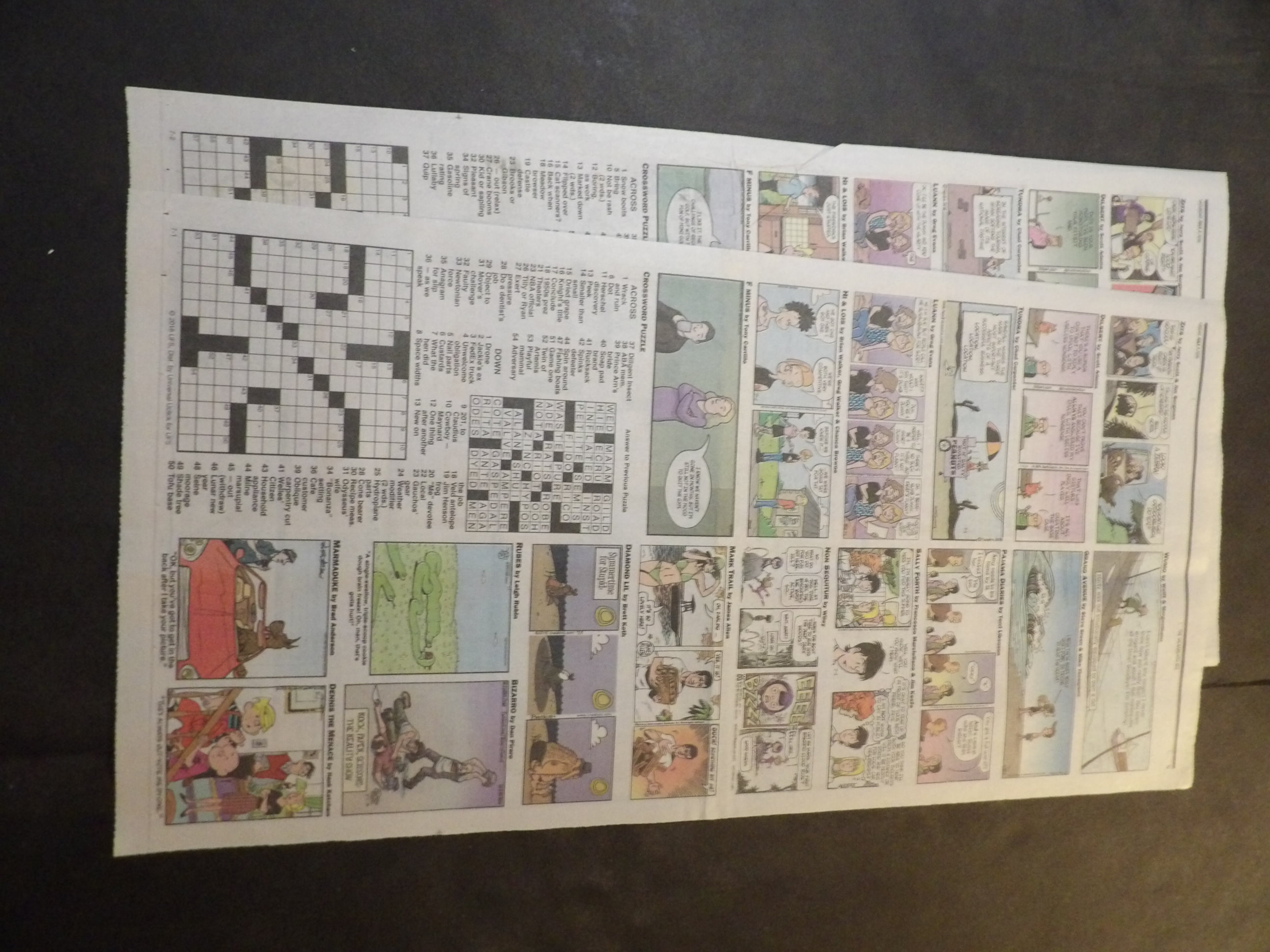 | W530-0003 | 2016 - 2 Full Color Daily sections | 1-Fulls each (2-sided, 1 Pages) | $1.00 | Zits, Dilbert, Tundra, Luann, Hi and Lois, Diamond Lil, F Minus, WuMo, Grand Avenue, Pajama Diaries, Sally Forth, Non Sequitur, Mark Trail, Rubes, Marmaduke, Bizarro, Dennis the Menace, Pickles, Jumpstart, Baby Blues, Beetle Bailey, Crankshaft, Rose is Rose, Drabble, Family Circus, Get Fuzzy, Mutts, Pearls Before Swine, Blondie, Frank and Ernest, Classic Peanuts, Garfield |