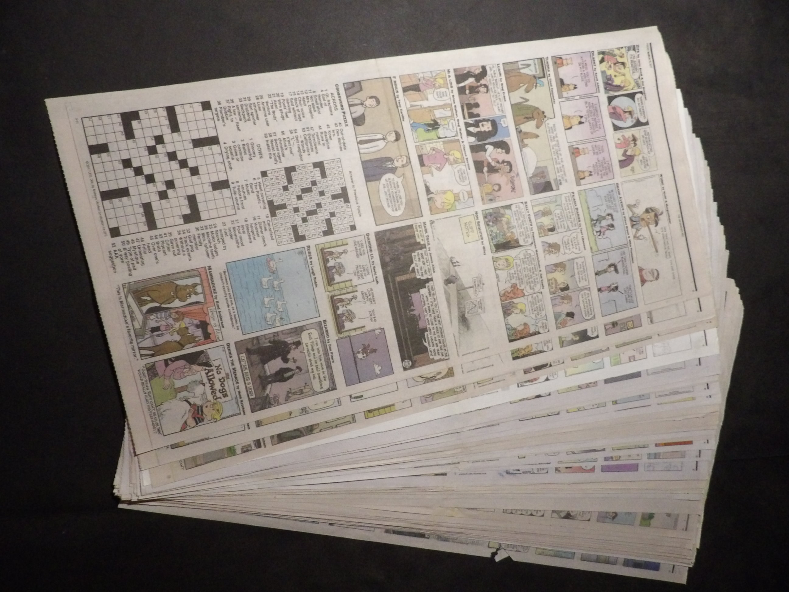 | W530-0005 | 2018 - 47 Full Color Daily sections | 1-Fulls each (2-sided, 1 Pages) | $11.50 | Zits, Dilbert, Tundra, Luann, Hi and Lois, Diamond Lil, F Minus, WuMo, Grand Avenue, Pajama Diaries, Sally Forth, Non Sequitur, Mark Trail, Rubes, Marmaduke, Bizarro, Dennis the Menace, Pickles, Jumpstart, Baby Blues, Beetle Bailey, Crankshaft, Rose is Rose, Drabble, Family Circus, Get Fuzzy, Mutts, Pearls Before Swine, Blondie, Frank and Ernest, Classic Peanuts, Garfield |